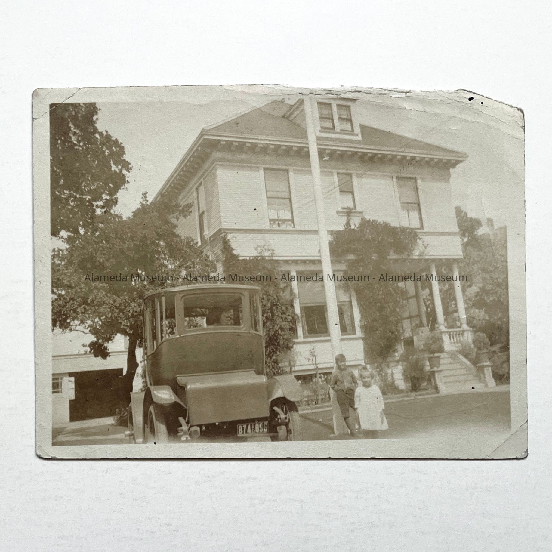History of Object: Photo of the exterior (main facade) of the Hamilton residence, 1275 Weber Street. It was erected in 1895 for James K. Hamilton, insurance, San Francisco. Pictured in front of the house is his two grandchildren, Roscoe & Carolyn (by his son Roscoe B. & Carol Tripp Hamilton).