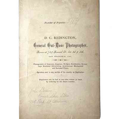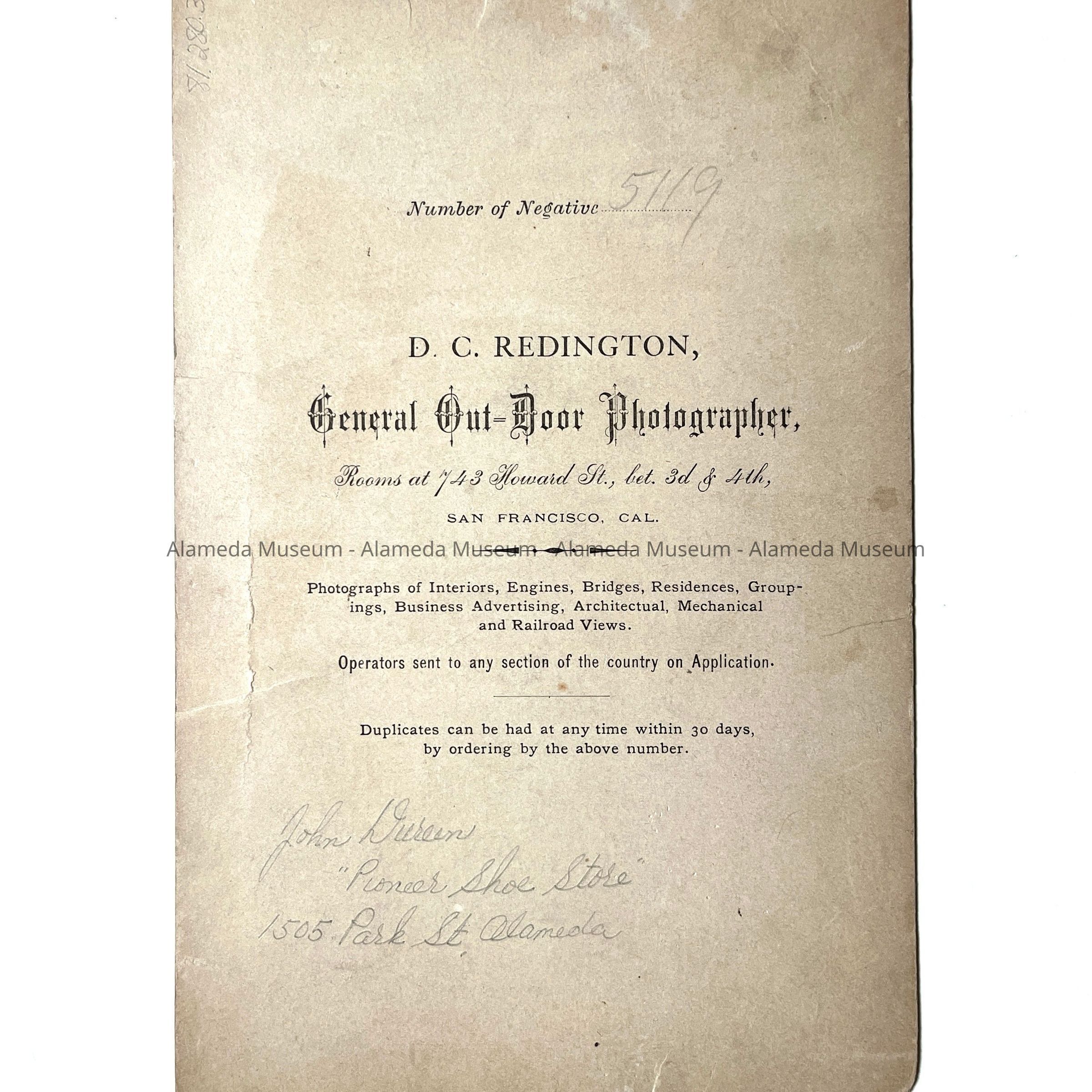 Description: Sepia tinted photograph, off white mounting, photographer was "D. C. Redington, General Out-Door Photographer, 743 Howard St., San Francisco, Cal."