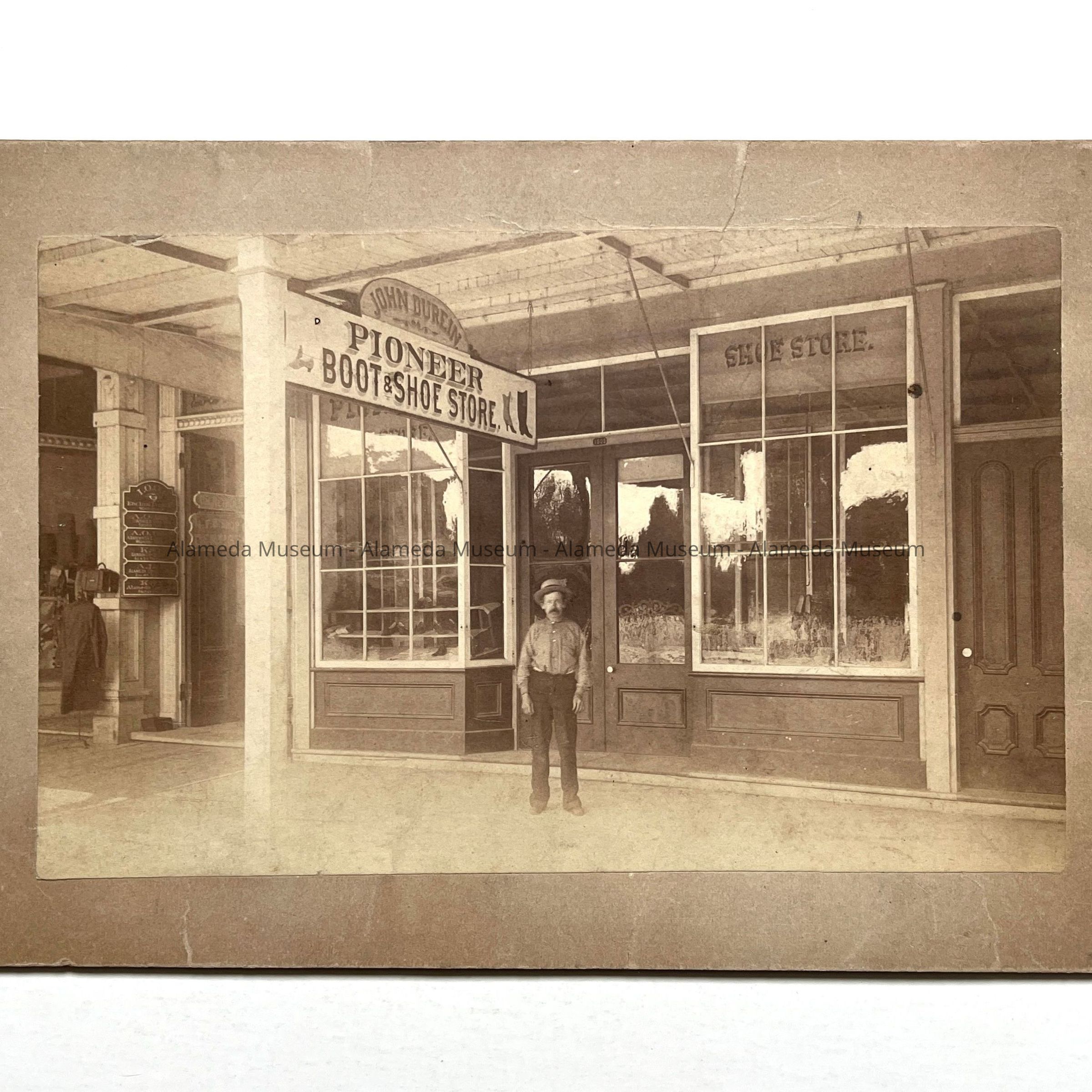 History of Object: Exterior photograph of the John Durein "Pioneer Shoe Store", showing detail of first floor. Mr. Durein was a pioneer merchant in Alameda. He purchased this lot in 1866.