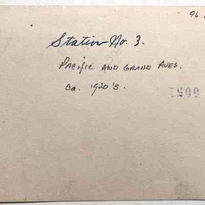 History of Object: Exterior view of fire Station #3, located at the corner of Pacific and Grand Avenues, showing the closed entrance to the engine garage.