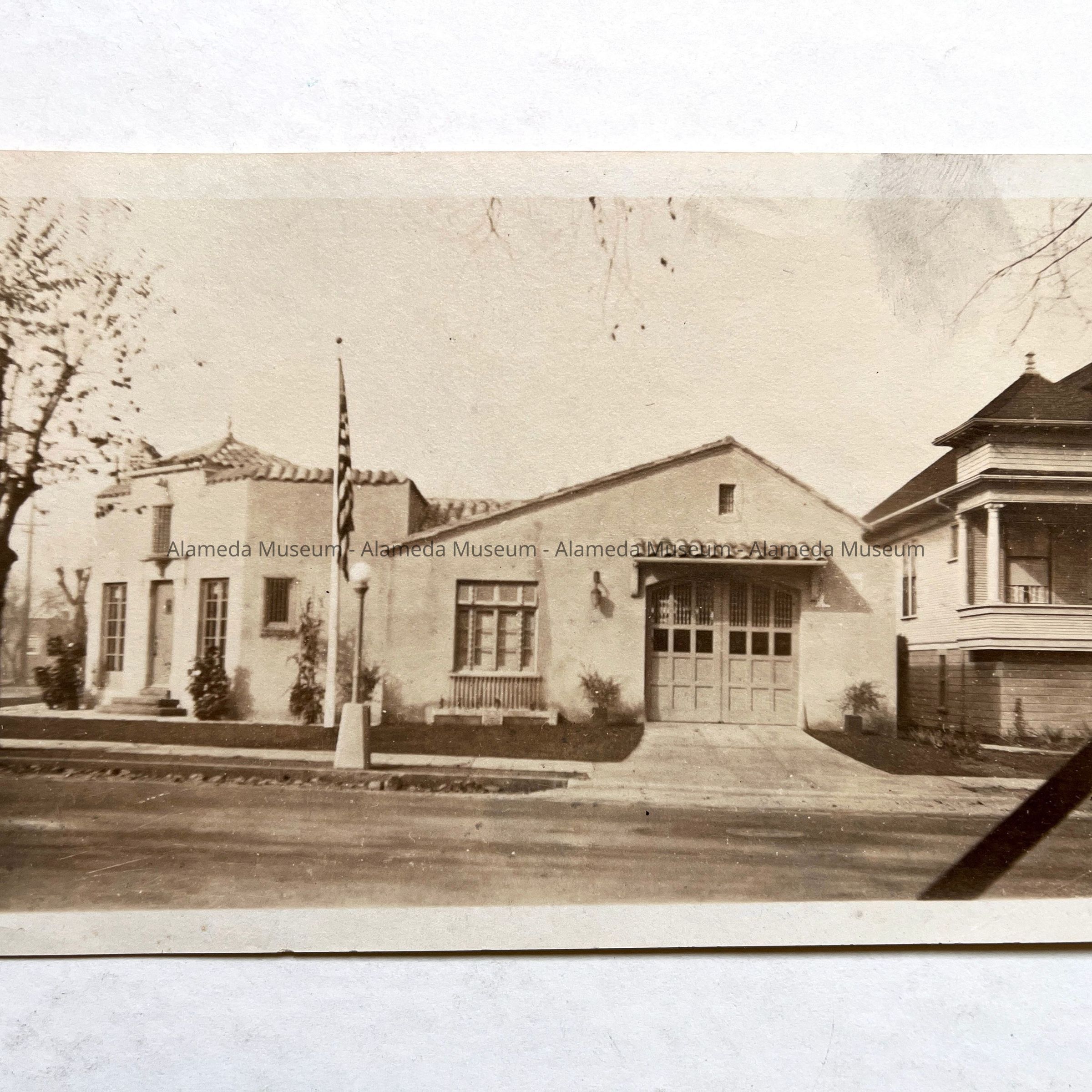 Photo exterior of Fire Station #3 with closed door, corner Pacific and Grand, c. 1920Entry/Object ID
