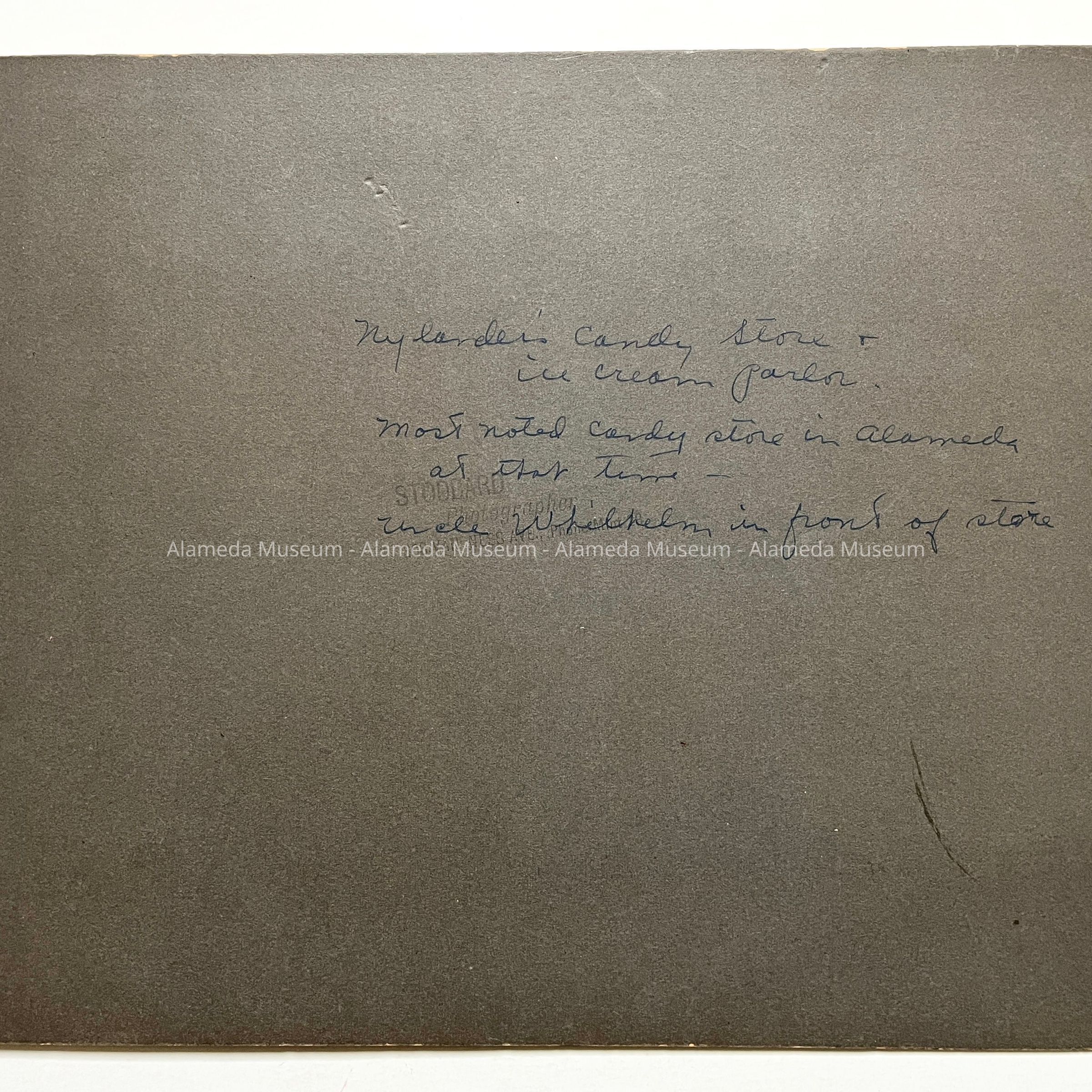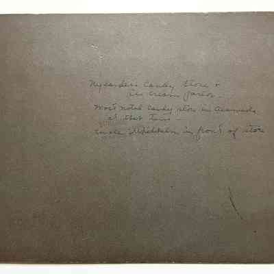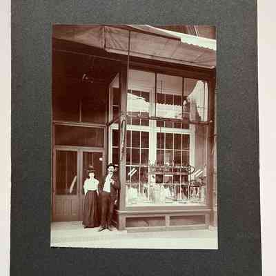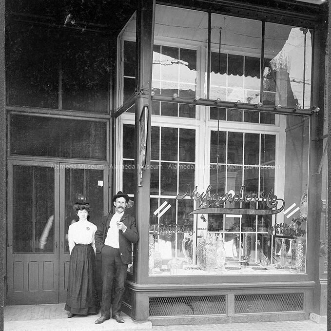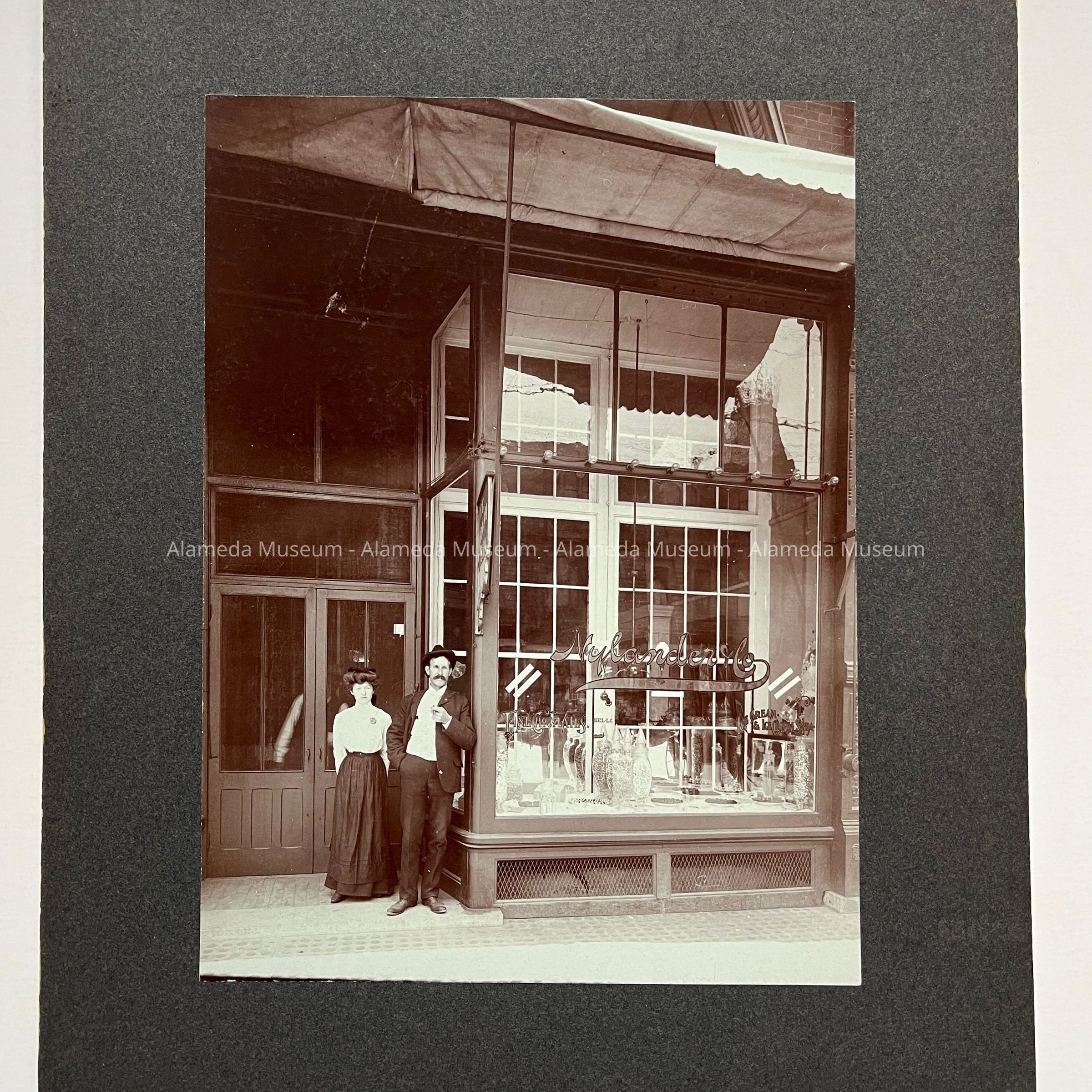 PHOTOGRAPH OF THE EXTERIOR OF THE NYLANDER CANDY STORE, 1601 PARK STREET. WILHELM NYLANDER, WITH AN UNIDENTIFIED FEMALE COMPANION, IS PICTURED STANDING IN FRONT OF THE STORE. MR NYLANDER WAS THE BROTHER OF GUSTAF ADOLF NYLANDER OF 1630 NINTH STREET, ALAMEDA, CALIFORNIA.