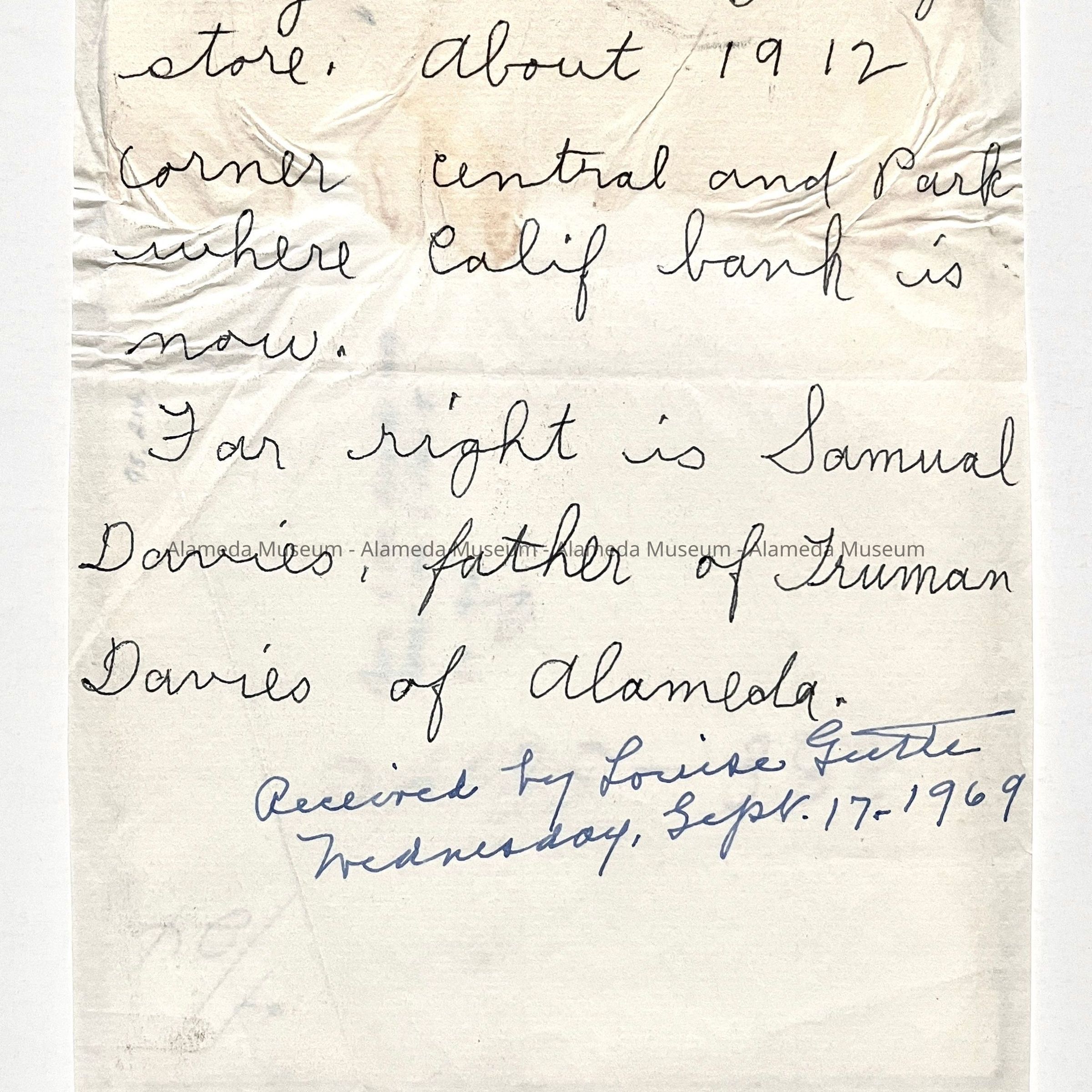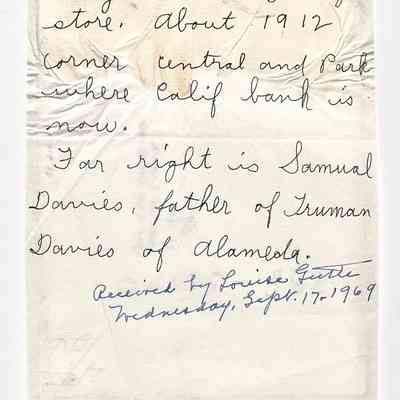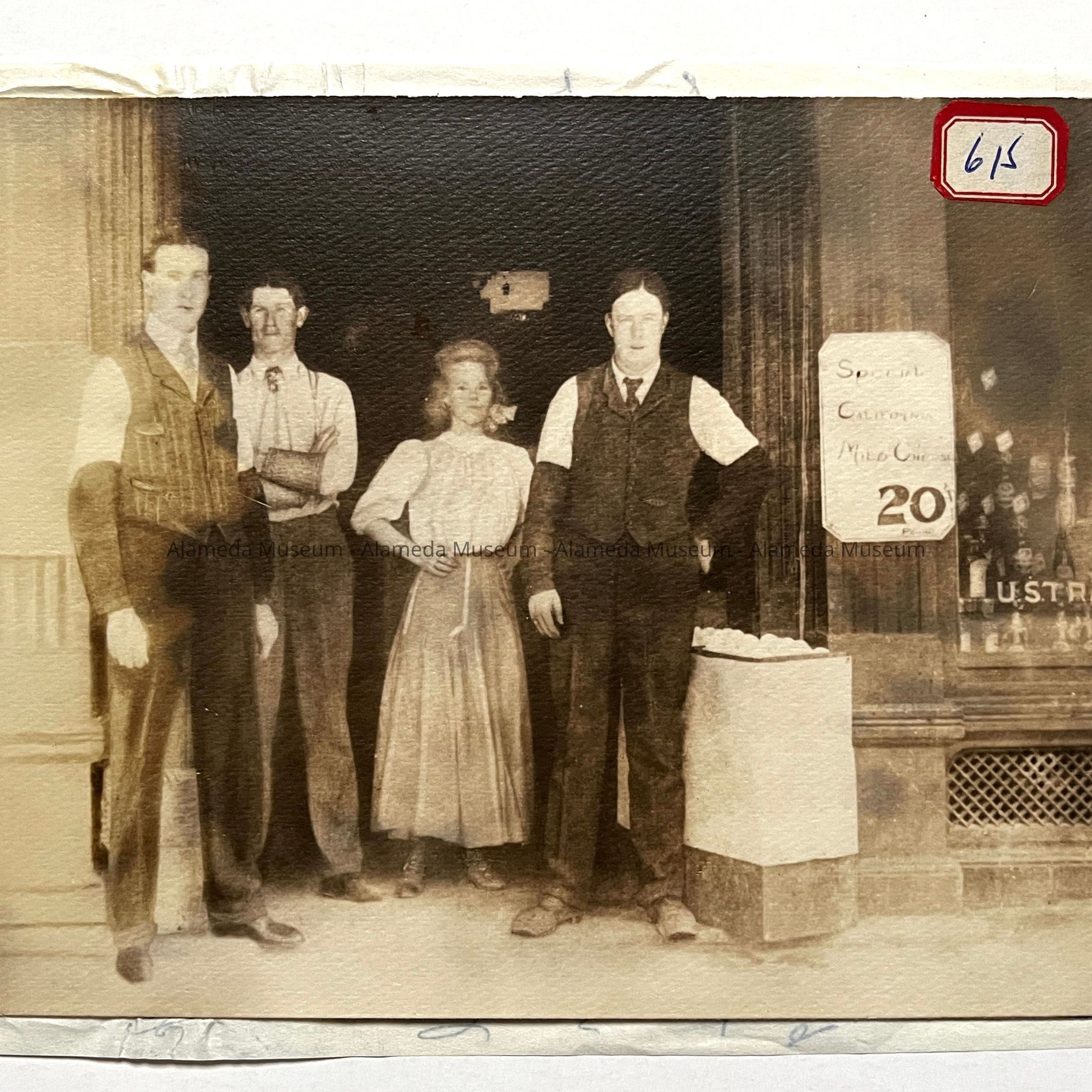 Four grocers standing at entrance to Patey and Cox Grocery, located at N.E. corner of Central Ave, and Park St. Man at far right is identified as Saruel Davies, father of Trunan Davies.