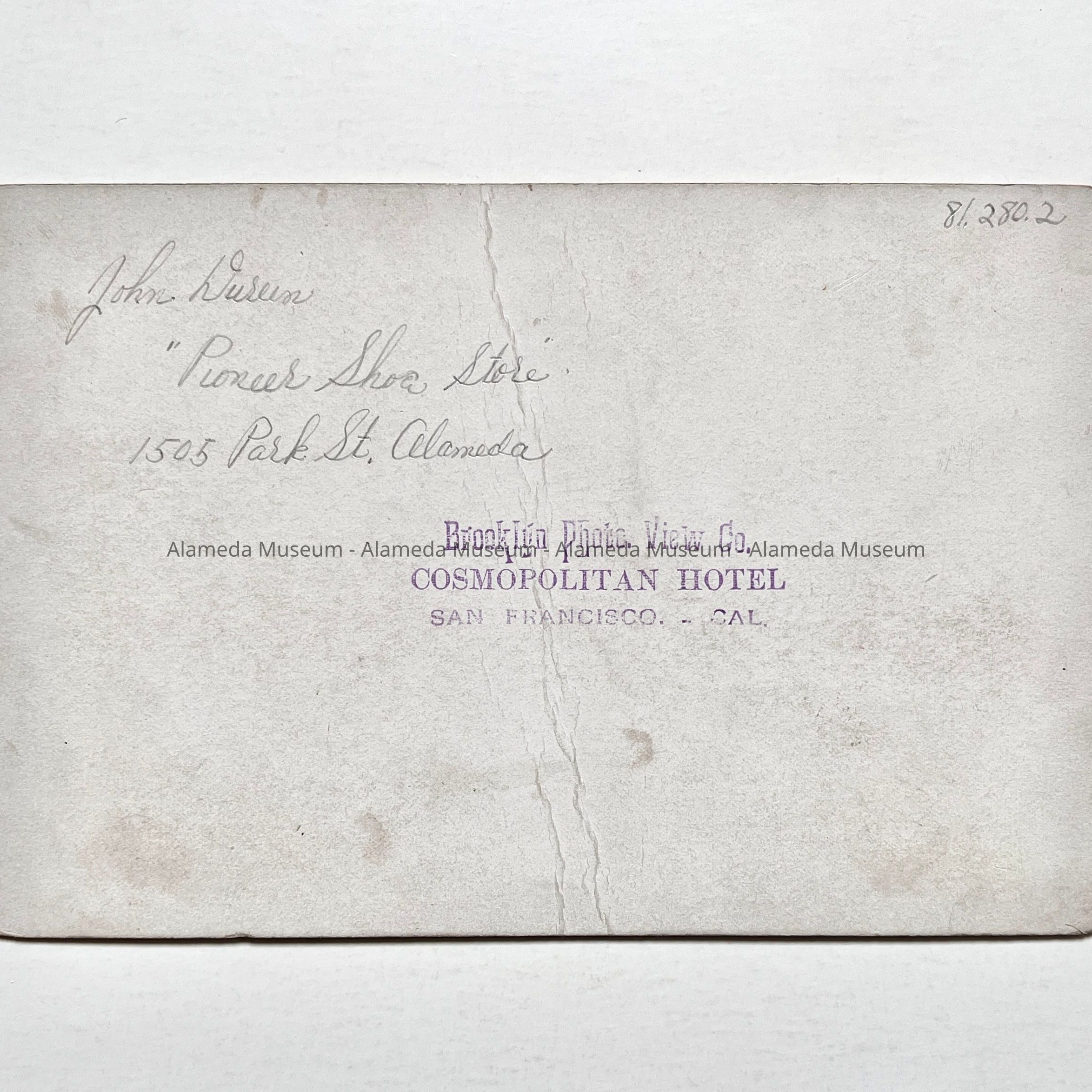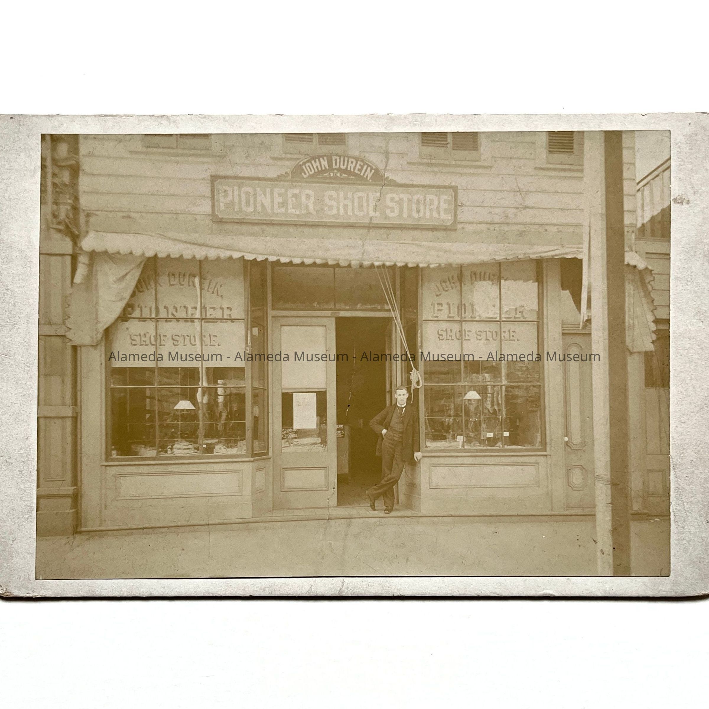 History of Object: Exterior photograph of the John Durein "Pioneer Shoe Store", showing detail of first floor. Mr. Durein was a pioneer merchant in Alameda. He purchased this lot in 1866.