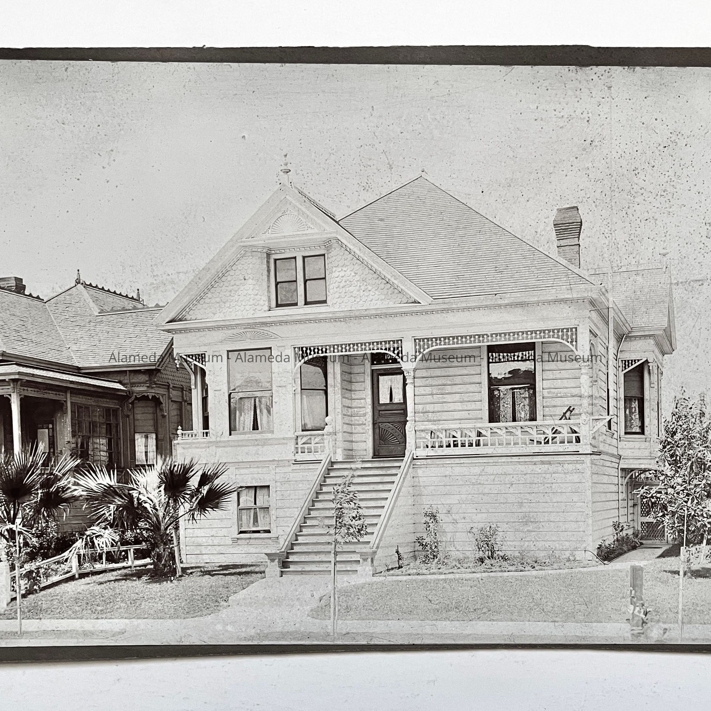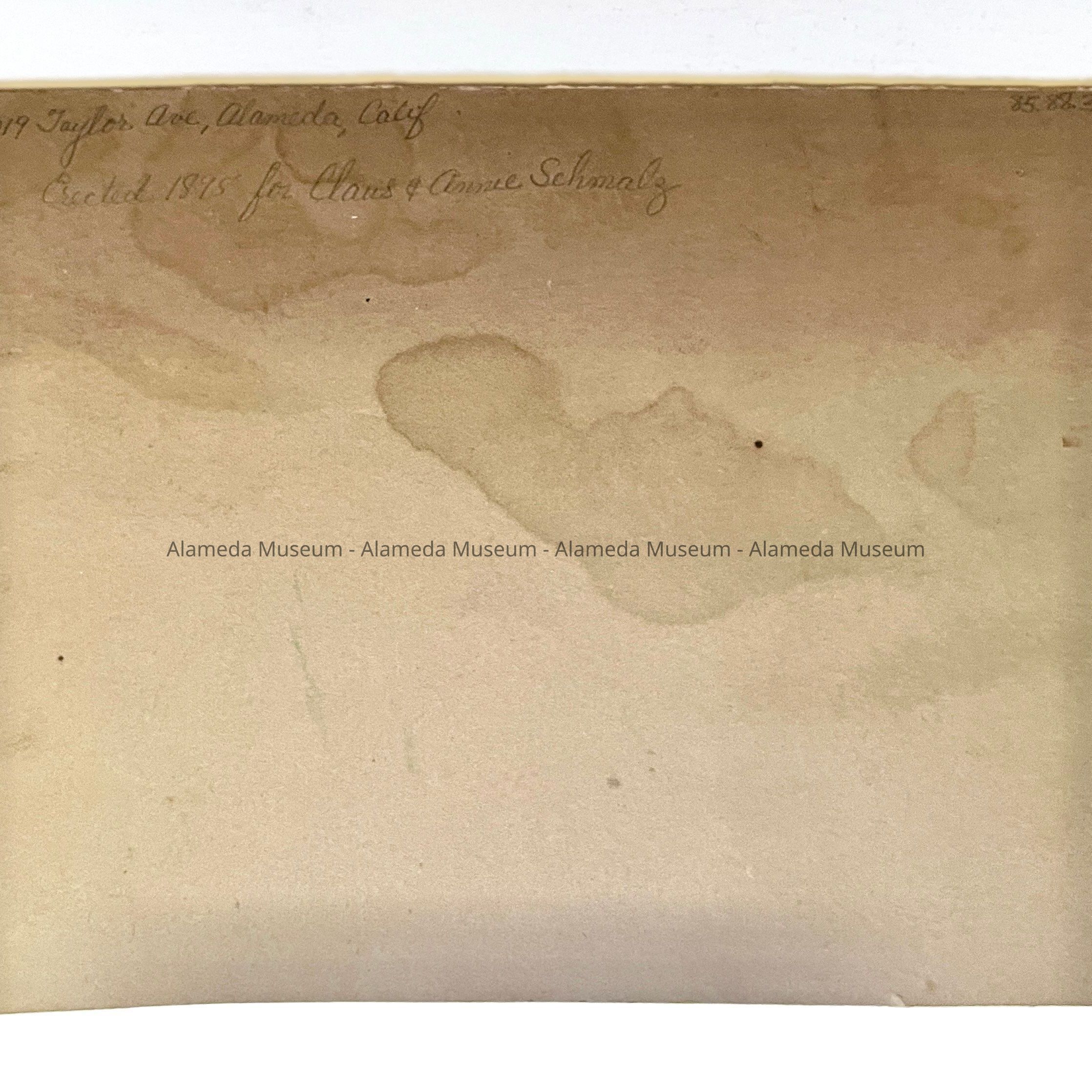 History of Object: Exterior photo of 1019 Taylor Avenue, Alameda (Queen Anne style cottage, high basement), erected 1895 for Claus & Annie Schmalz, The Schmalz family occupied the house from 1895 to the late 1960's.