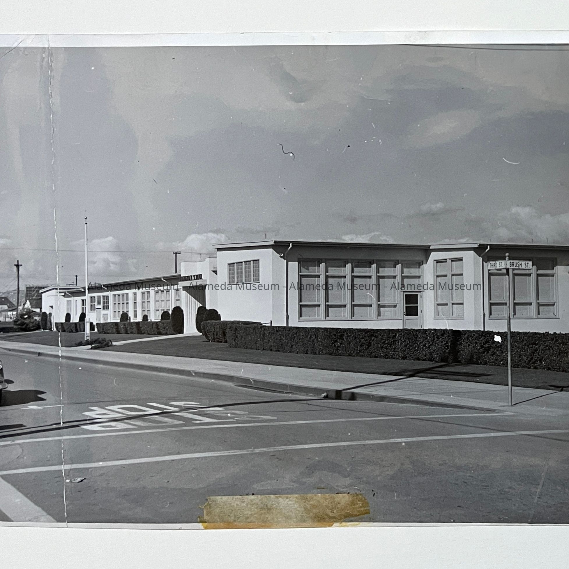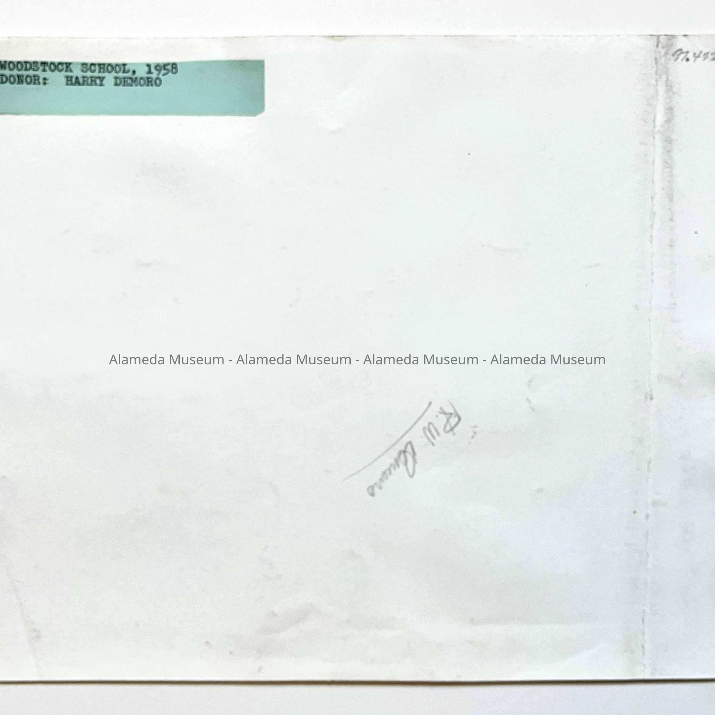 Description: Glossy black/white photo, unmounted. Photographer unknown. The image has a full length vertical crease about 14 in. from its left edge, and also the remnants of a white label at the bottom center edge.