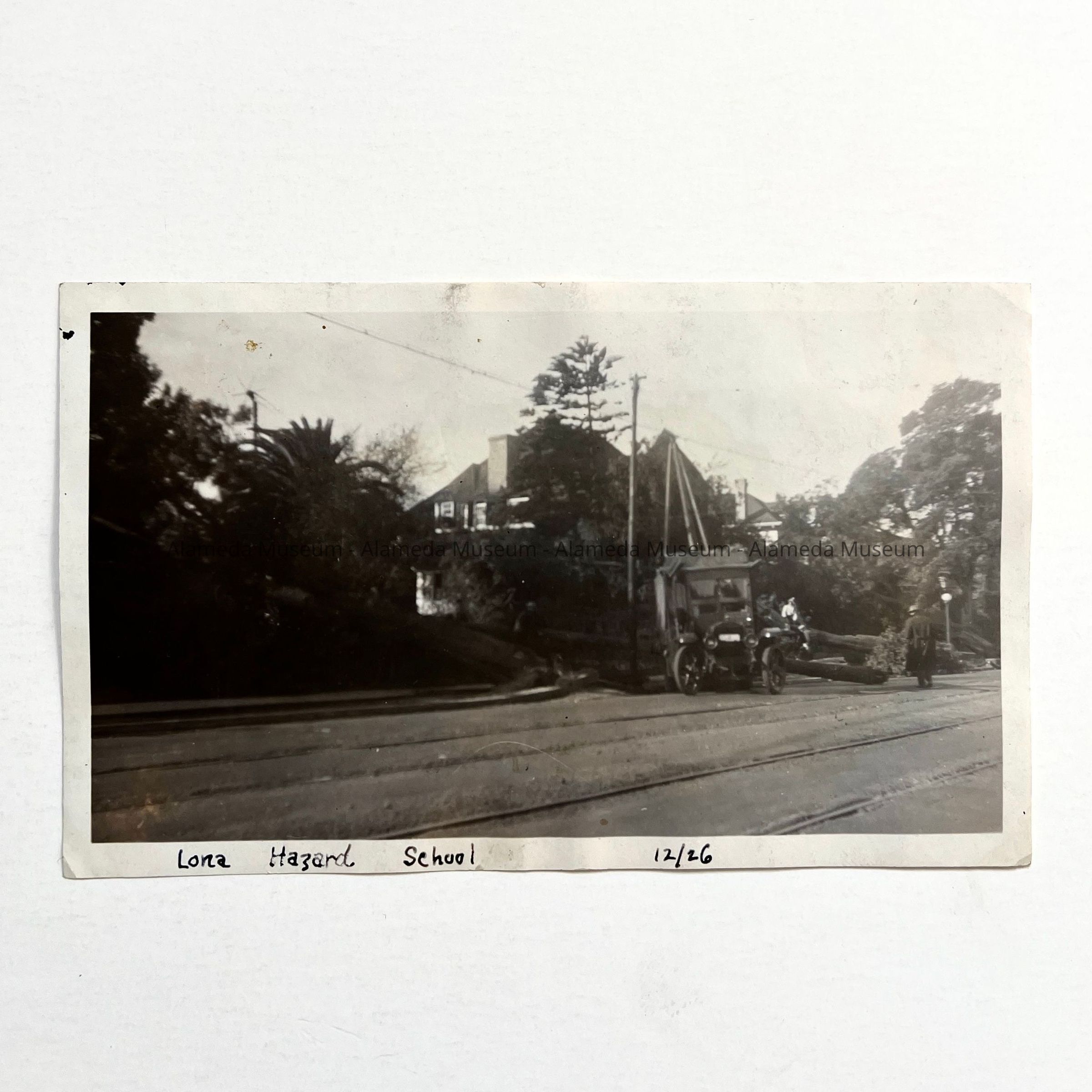 History of Object: Scene showing the removal of fallen trees in front of the Lona Hazzard School (private) on Santa Clara Avenue near Grand Street, resulting from a severe wind storm.
