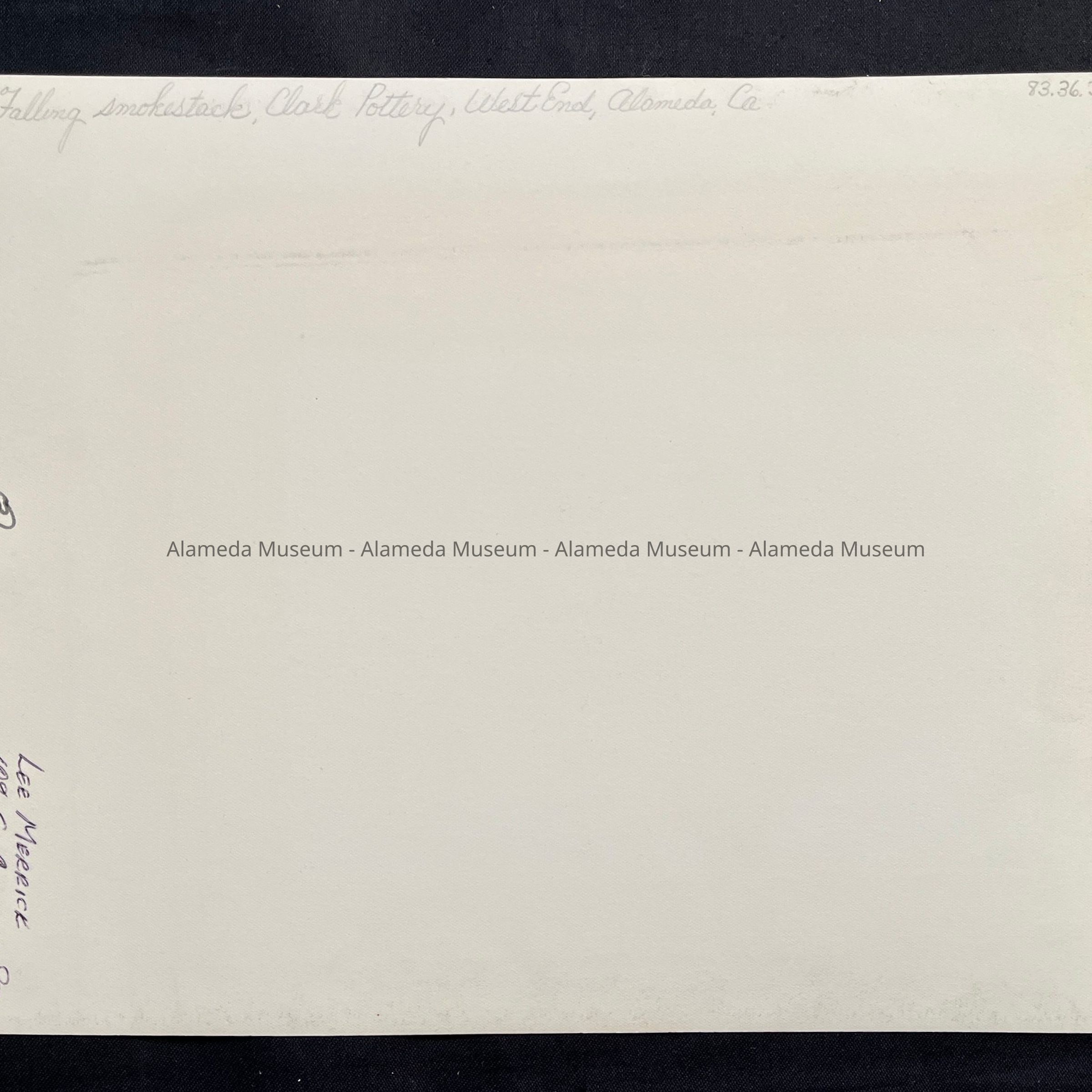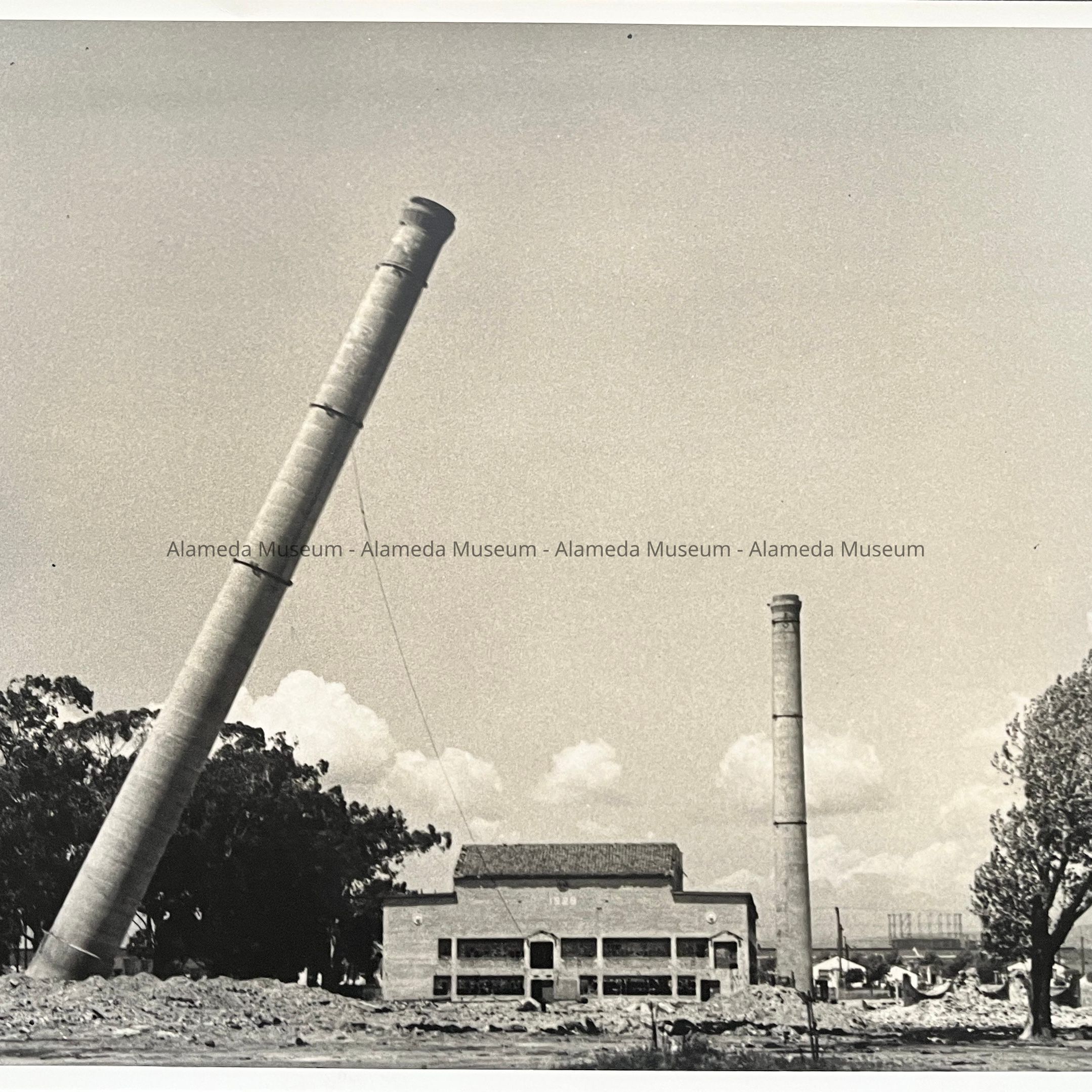 History of Object: Photo, falling smokestack, Clark Pottery, West End, Alameda, Ca.