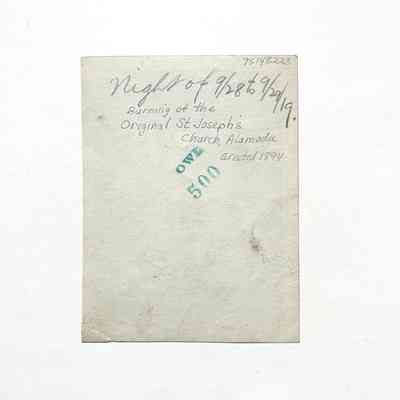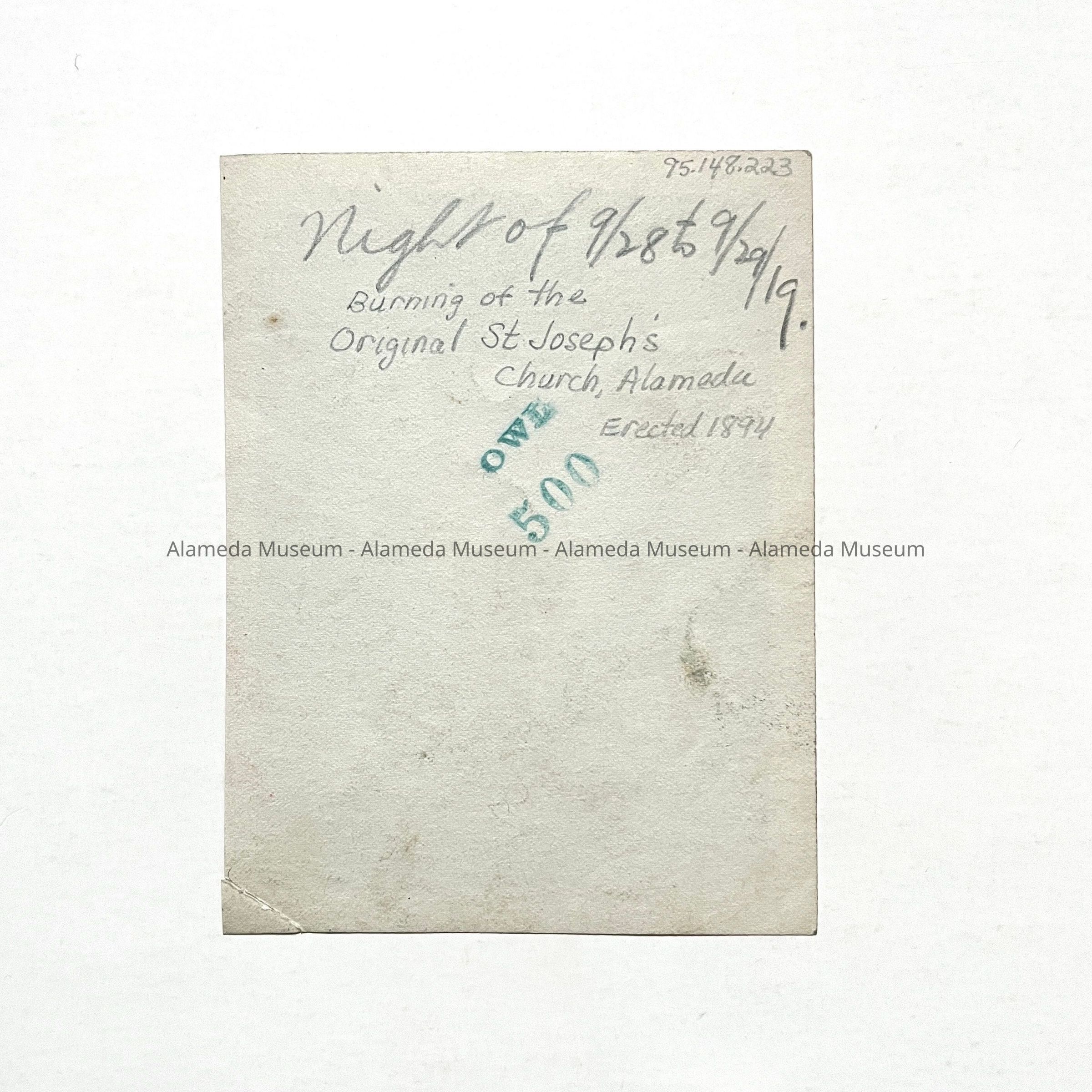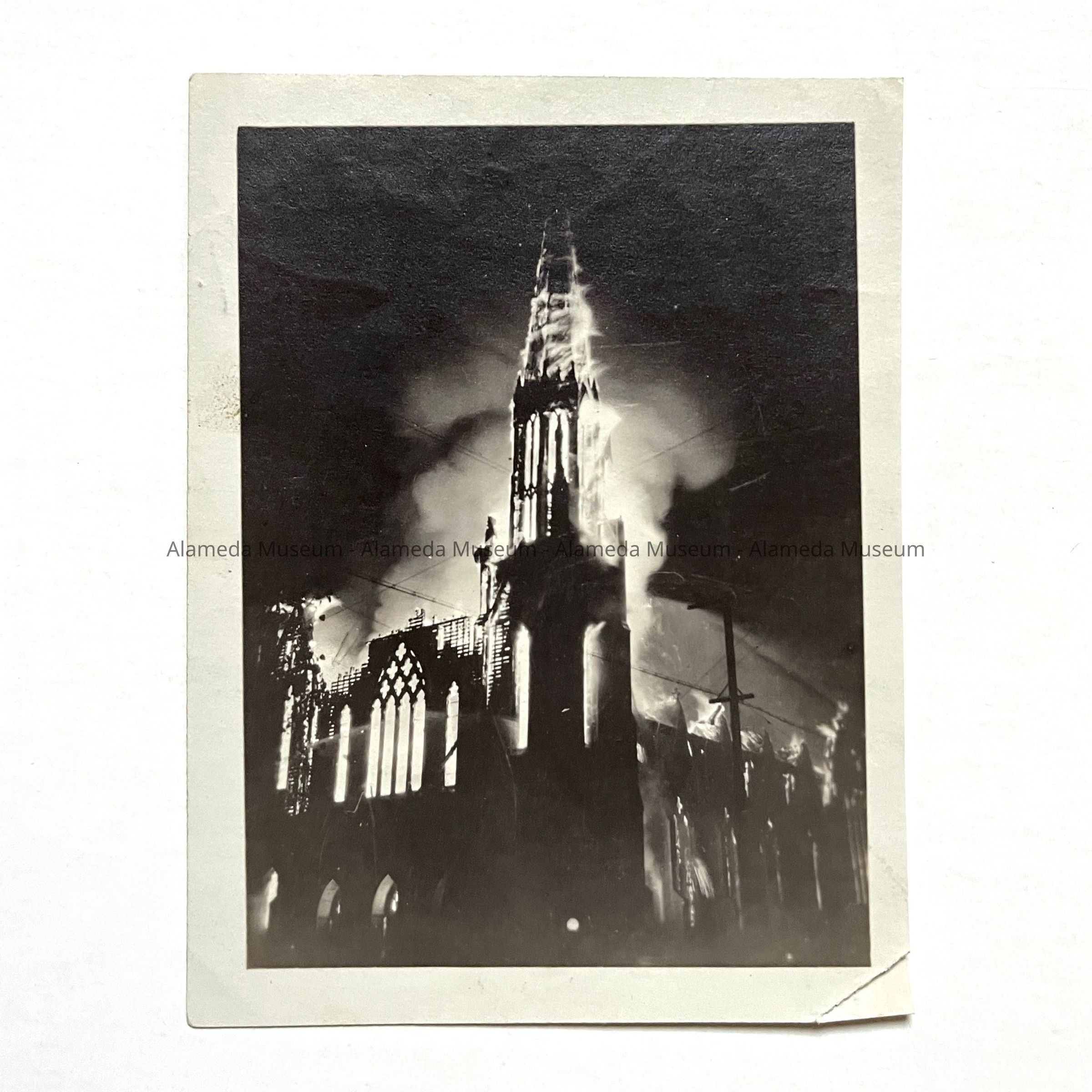 HISTORY OF OBJECT: PHOTOGRAPH DEPICTING THE DESTRUCTION BY FIRE OF THE ORIGINAL SAINT JOSEPH'S CATHOLIC CHURCH, ALAMEDA, CALIFORNIA; ERECTED IN 1894. PHOTOGRAPH TAKEN ON THE NIGHT OF SEPTEMBER 28, 1919 BY A MEMBER OF THE BLAKE-DYER FAMILY OF CLINTON AVENUE, ALAMEDA.