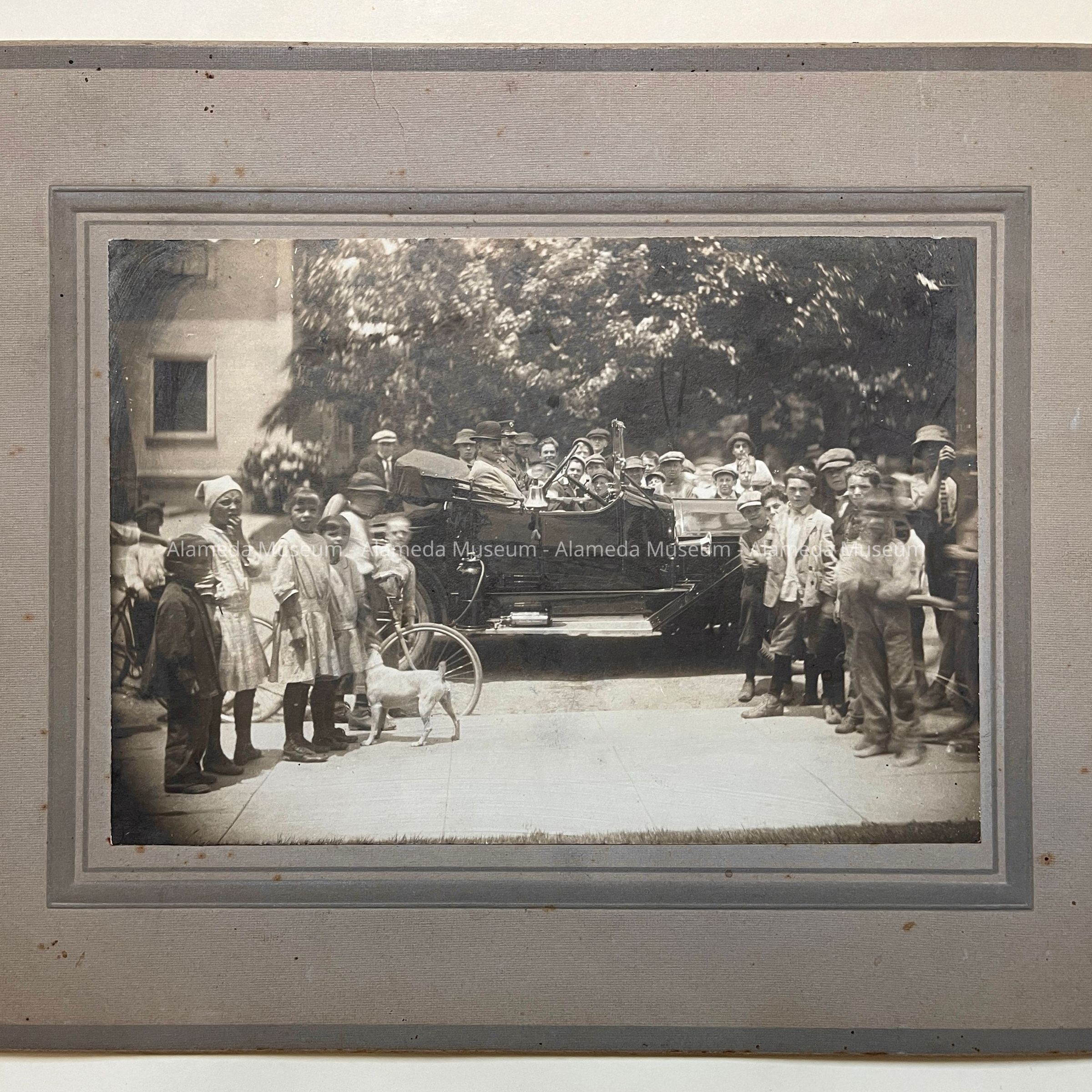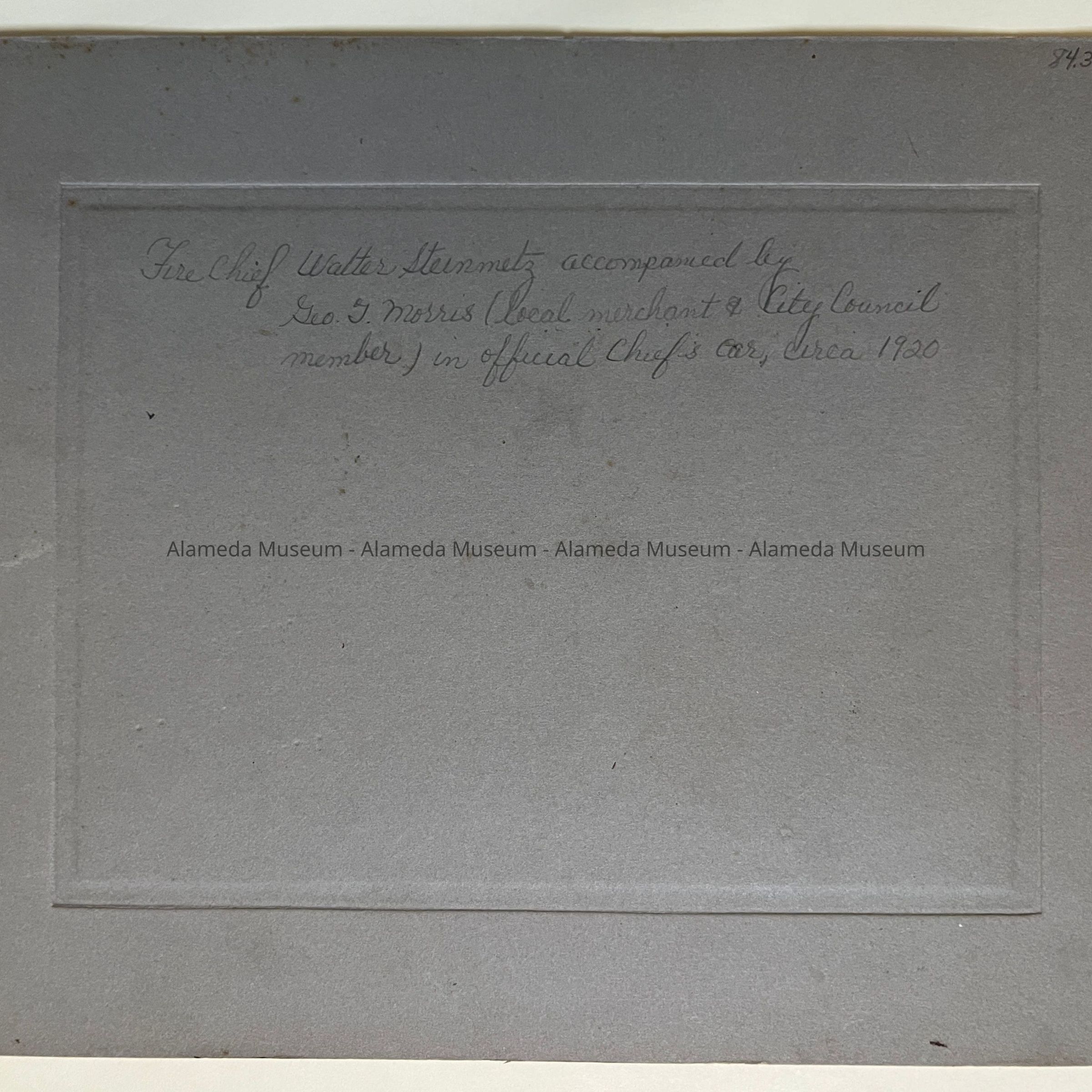 History of Object: Photo- Fire Chief Walter Steinmetz accompanied by Geo. T. Morris (local merchant & City Council member) in official Chief's car, circa 1920.