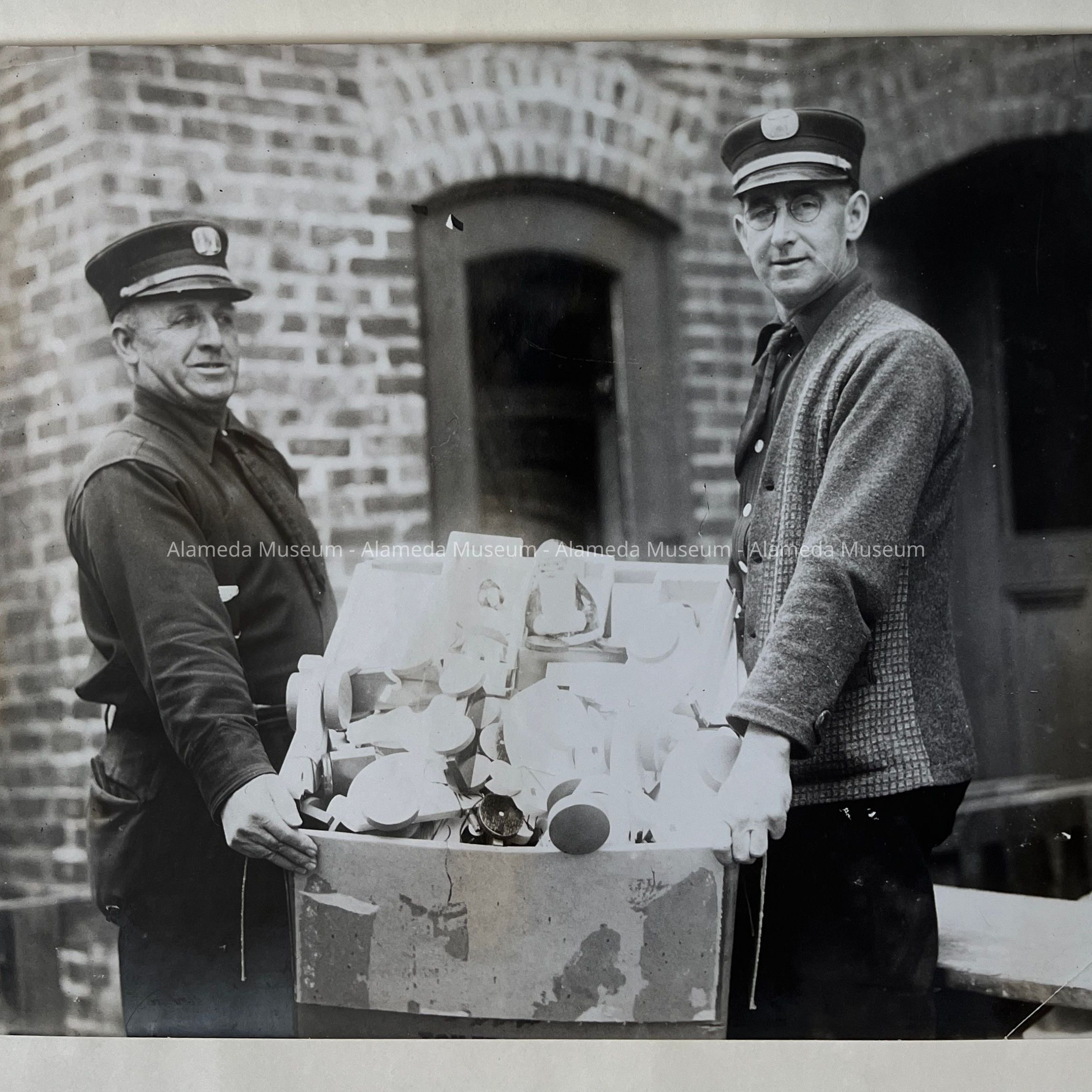 History of Object: Captains Gus Wagner and Dock Kennedy of the Alameda Fire Dept. carrying an open carton containing various donated toys as part of its Christmas toy distribution program.