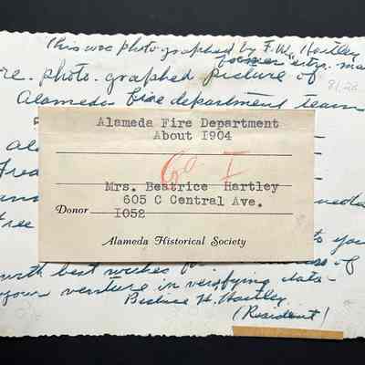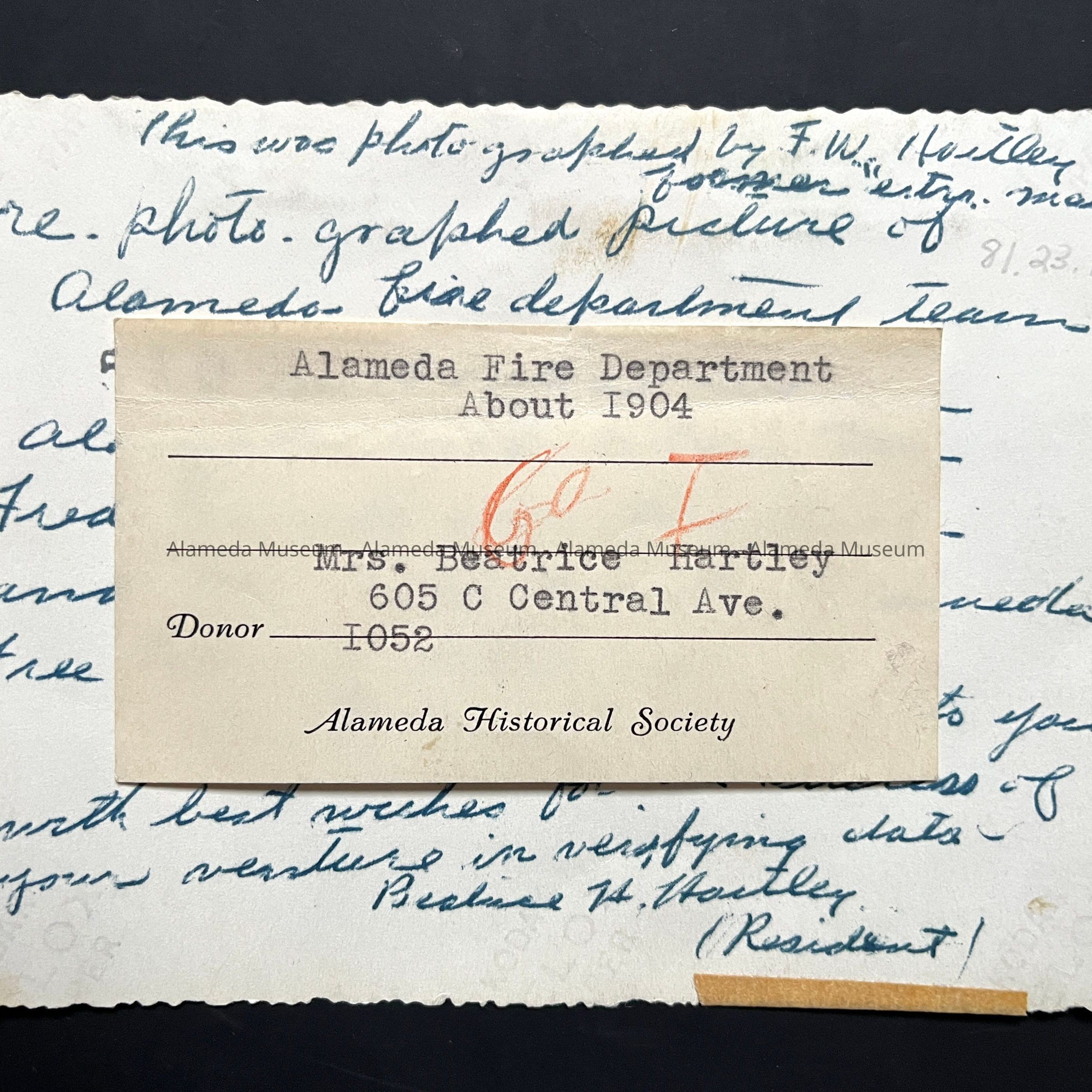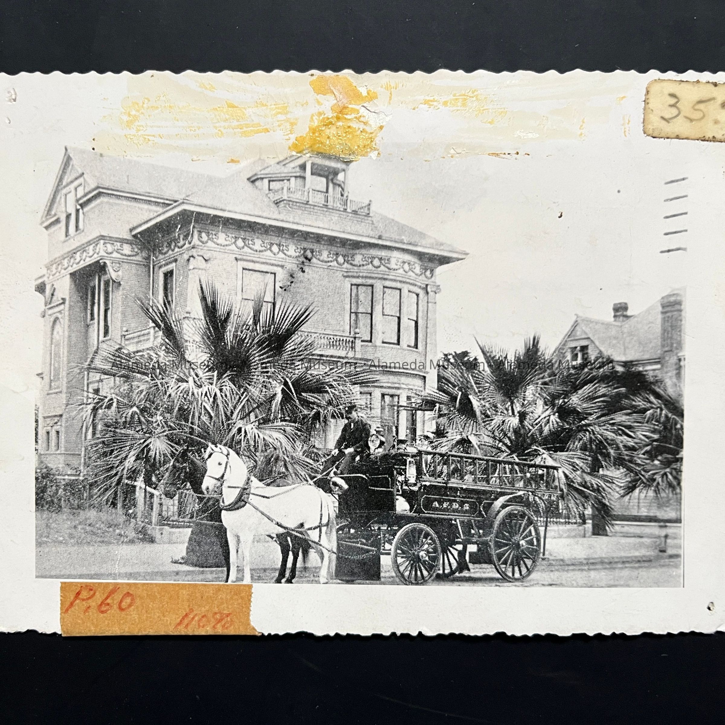 History of Object: This photograph was taken by F. W. Hartley, Alameda Fire Department. 1904. Fred Krauth was the Fire Chief. In the background is the Sevening mansion at the northwest corner of Central and Everett Street.