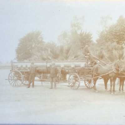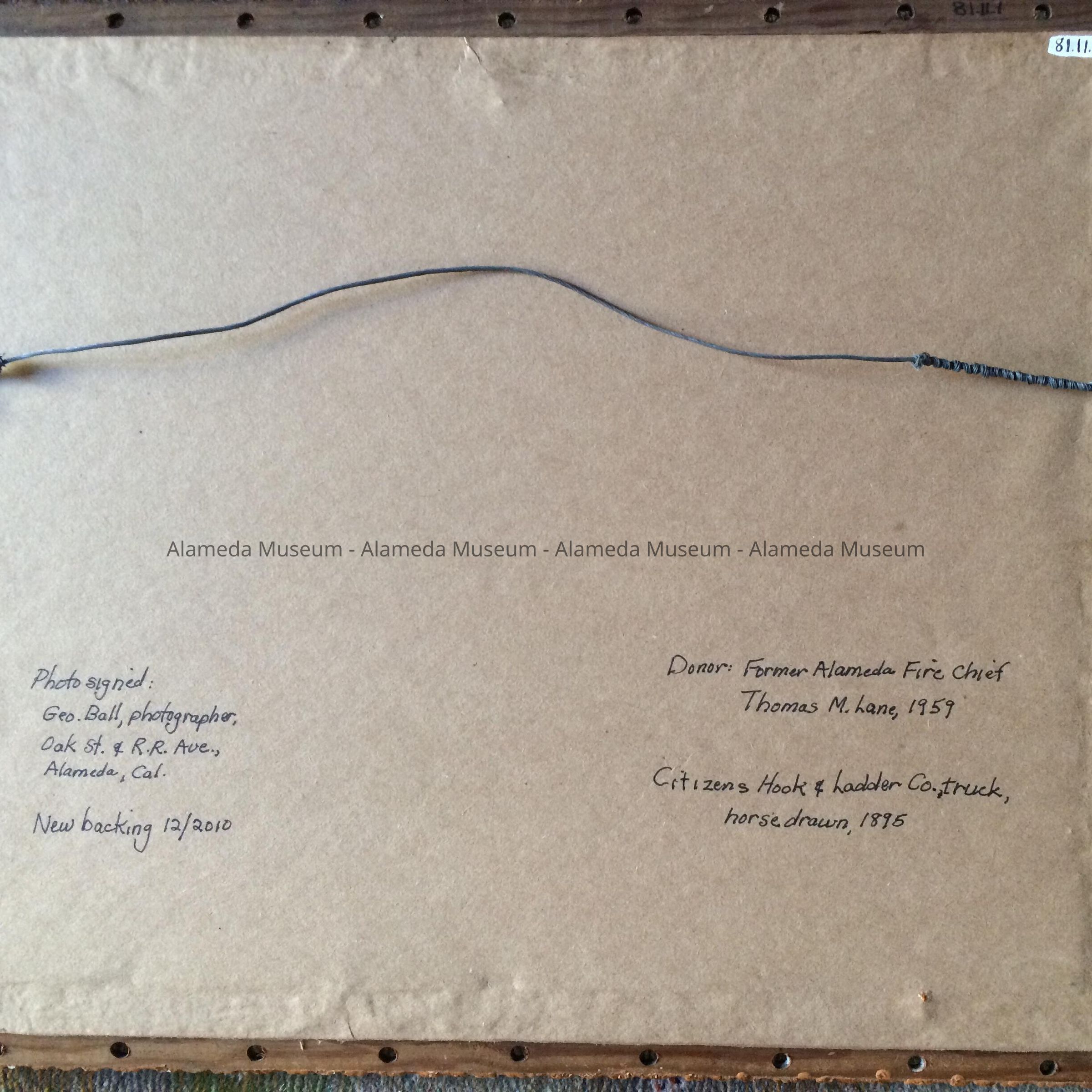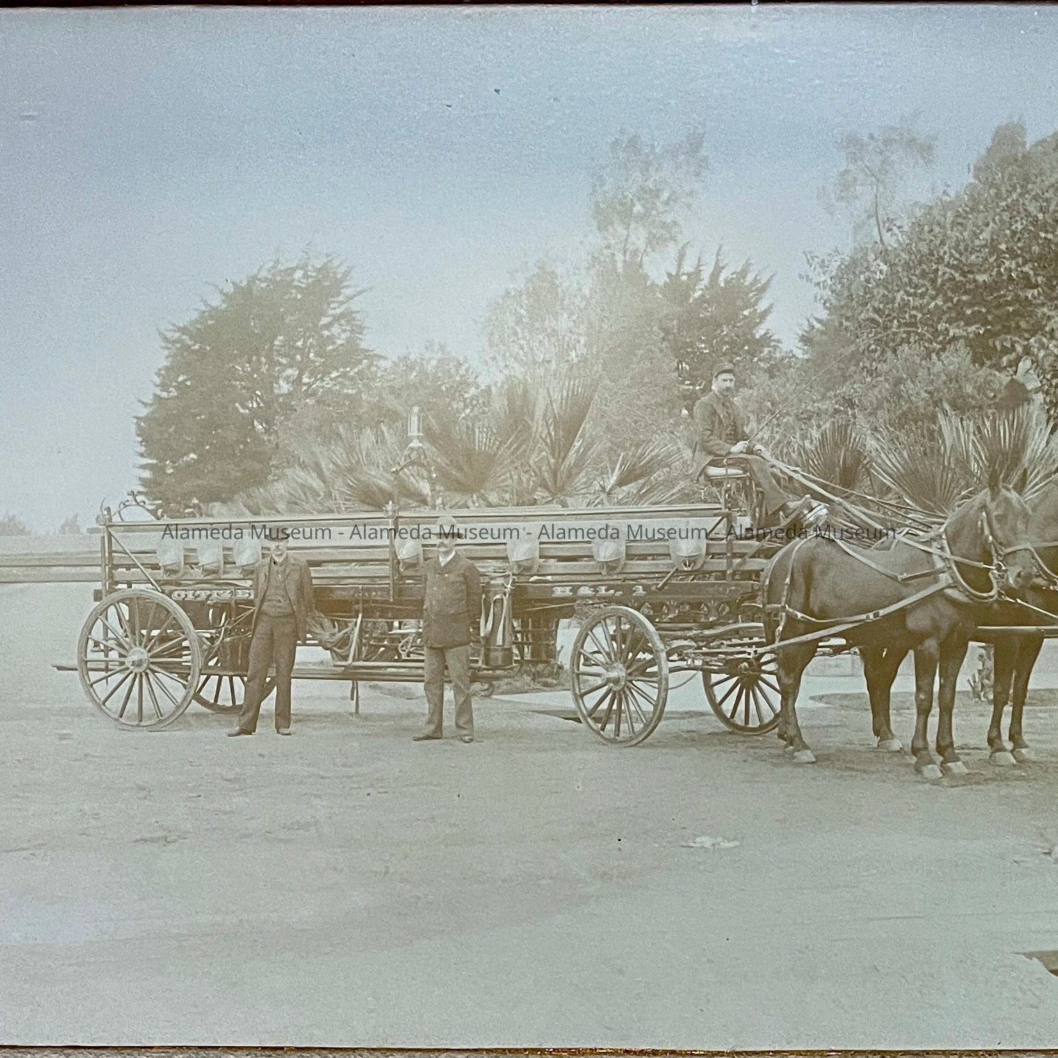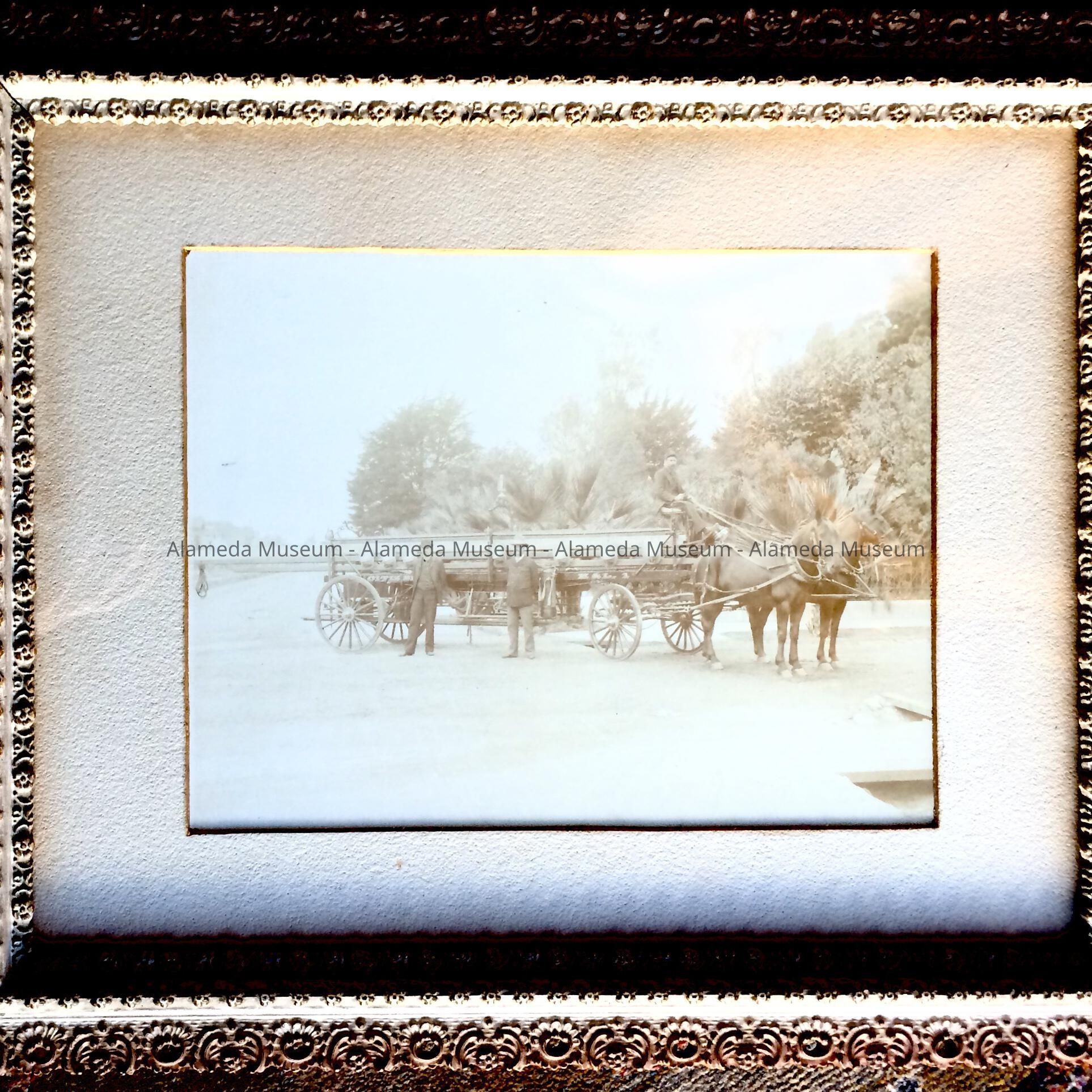 History of Object: Horse-drawn hook and ladder fire truck, Alameda Fire Dept., then-known as Citizens Hook and Ladder Company Number One; it was located on Webb Ave., just off Park St., and it was a volunteer group. Fire Chief Fred K. Krauth is pictured in the center wearing a light colored hat.