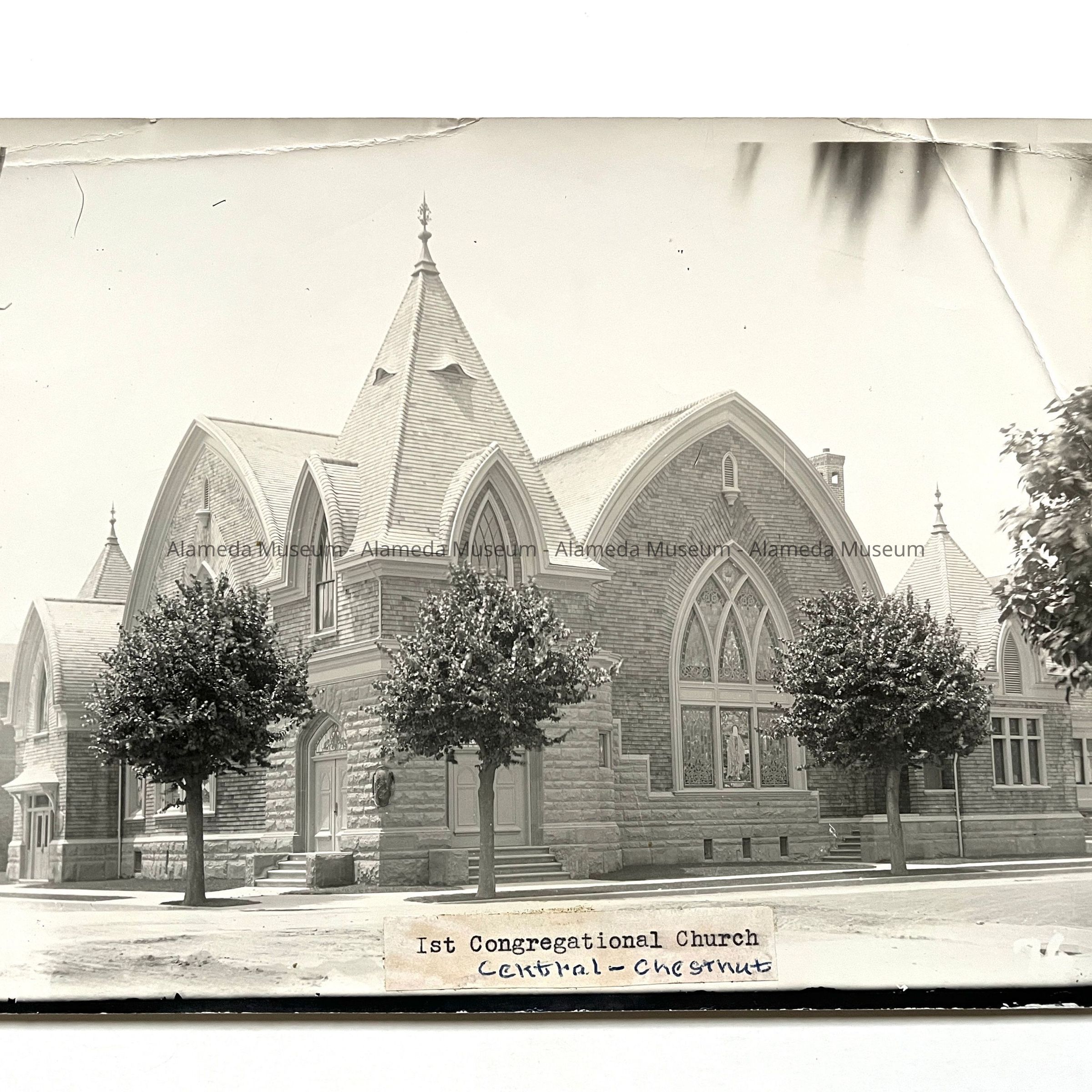 History of Object: View of First Congregational Church located at Central Avenue and Chestnut Streets. Structure is shown before the picket fence was erected around the property ca. 1900.