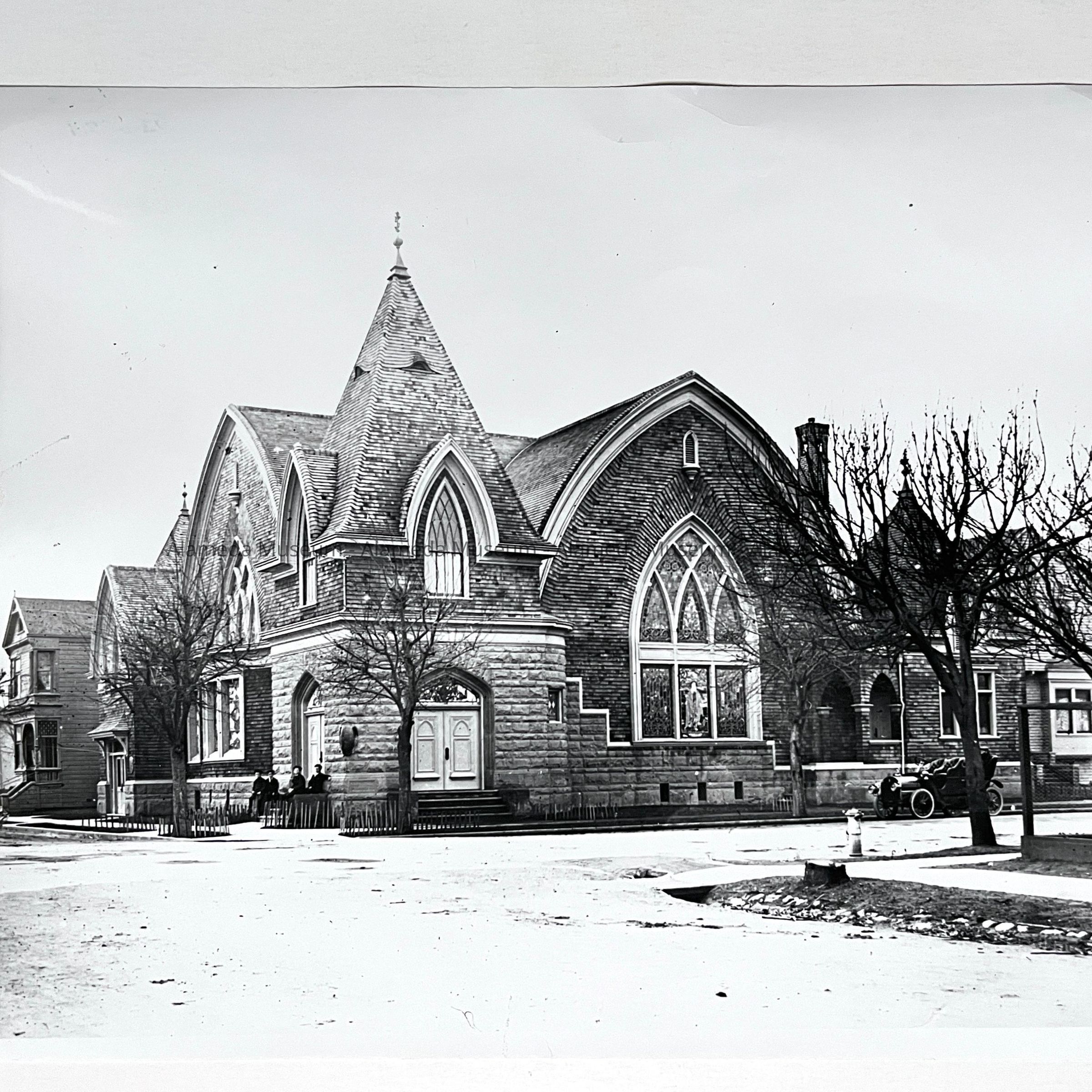 History of Object: View of the corner of Chestnut and Central showing the church with an open carriage automobile parked on the Central Avenue side of the edifice.