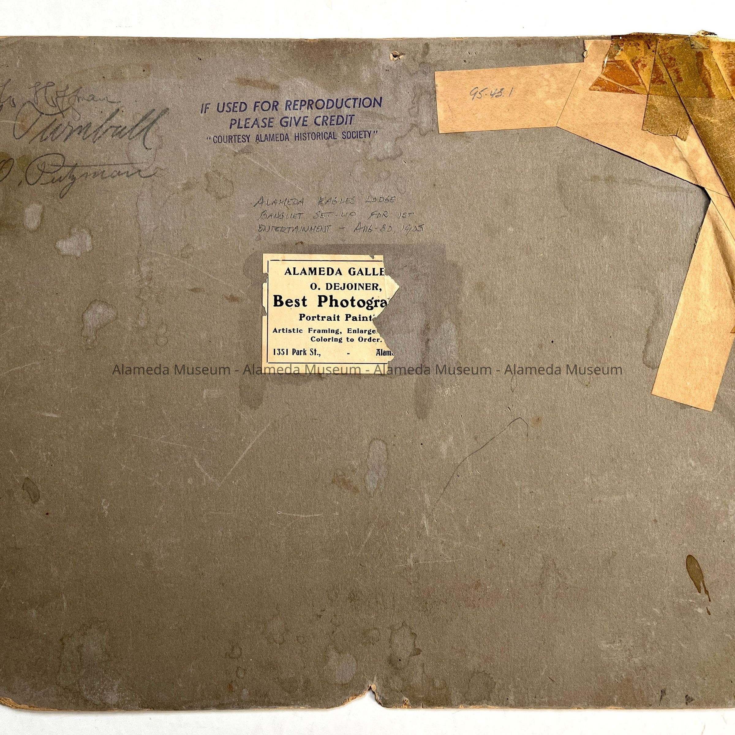 Black/white lt. sepia-toned print mounted on dk. gray paperboard. Description of the event is press-printed on the lower margin of the mounting. Photographer's label (partially gone) is on the verso: Alameda Gallery - O. DeJoiner - 1351 Park St., Alameda.