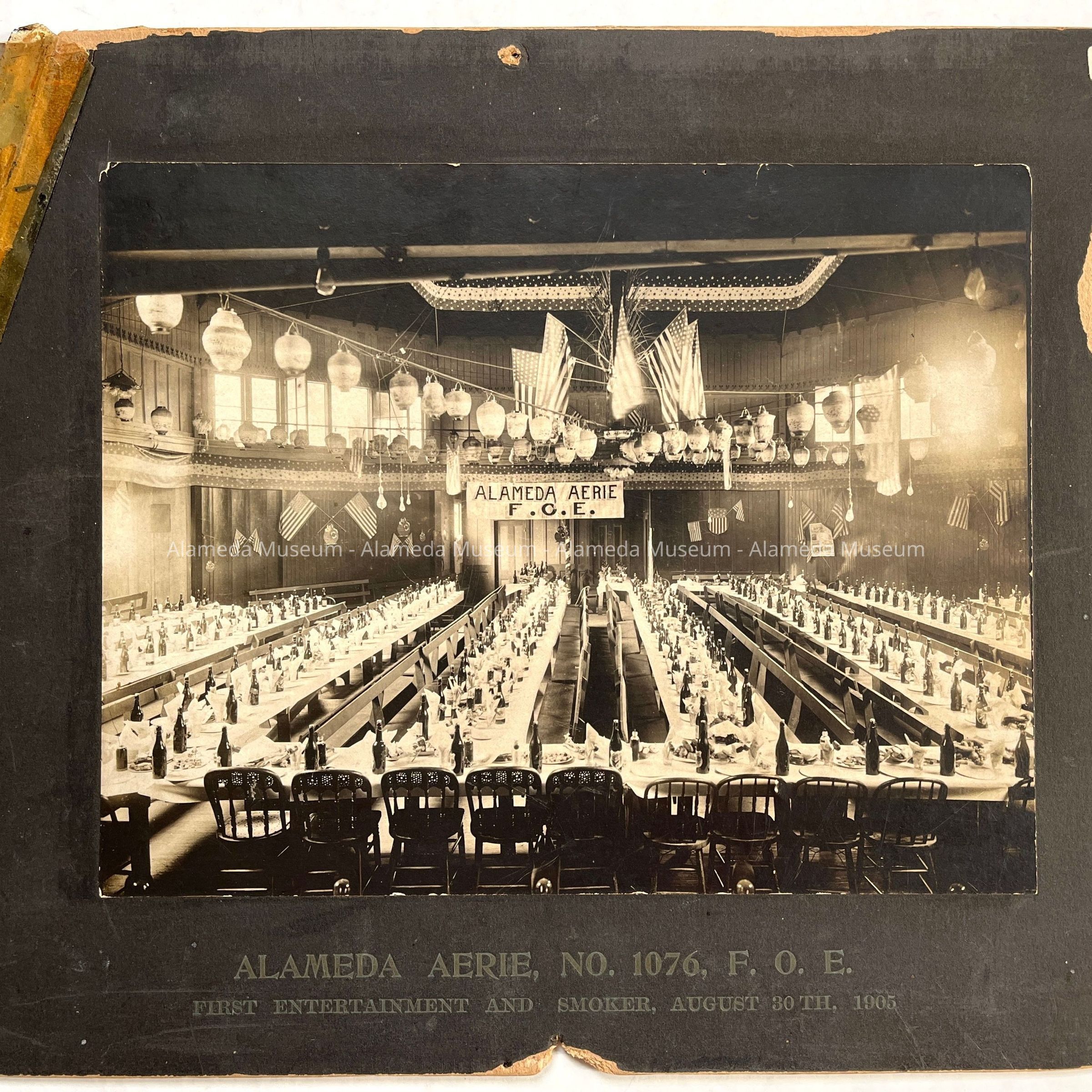 Interior view of a hall with banquet tables set up with napery, chinaware, beverages, waiting the start of "Alameda Aerie no. 1076, F.O.E. - First Entertainment and Smoker, August 30th, 1905" (per printed description on lower mount margin).