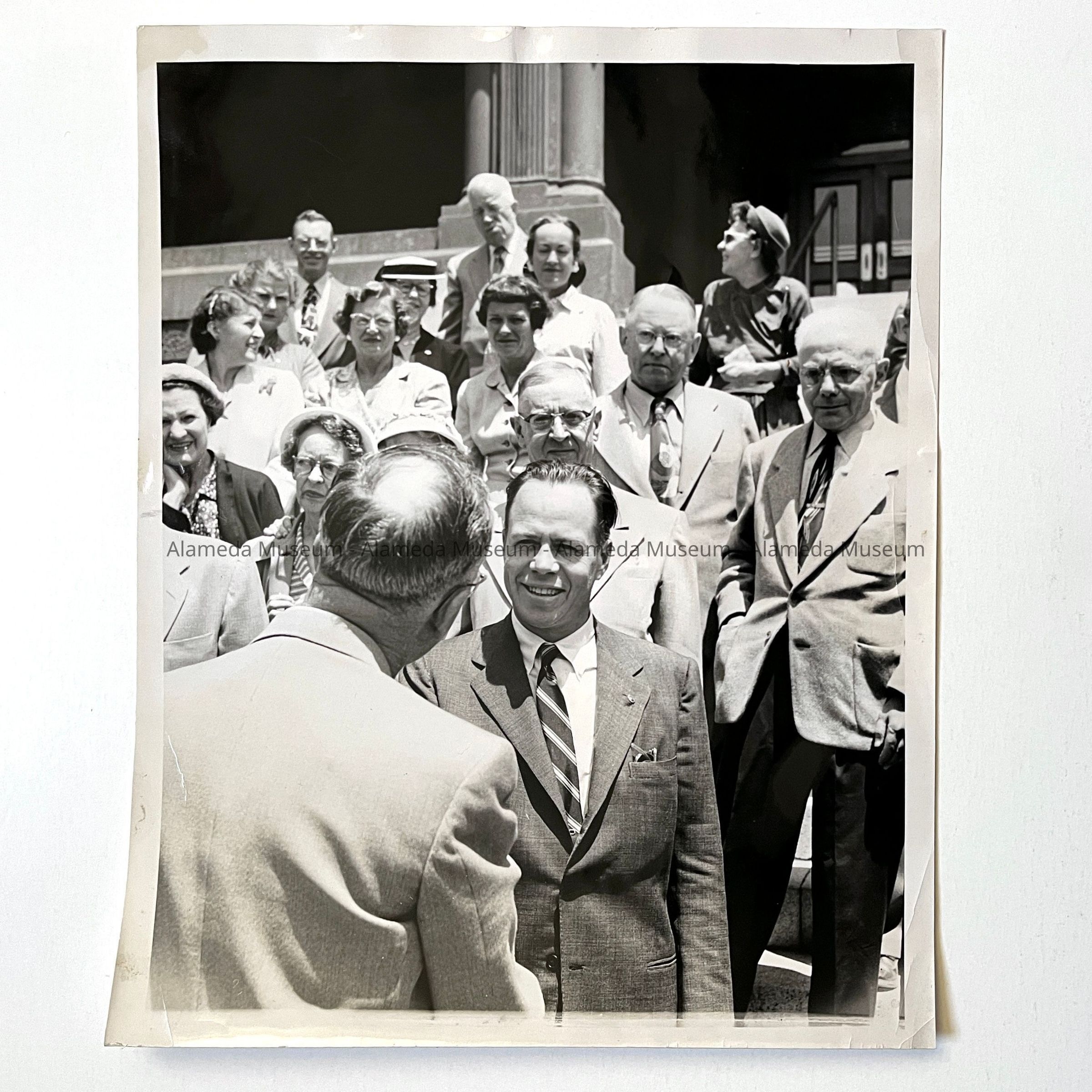 Photo formal greeting on steps of City Hall, with Judge Dan Knox, c. 1950sEntry/Object ID