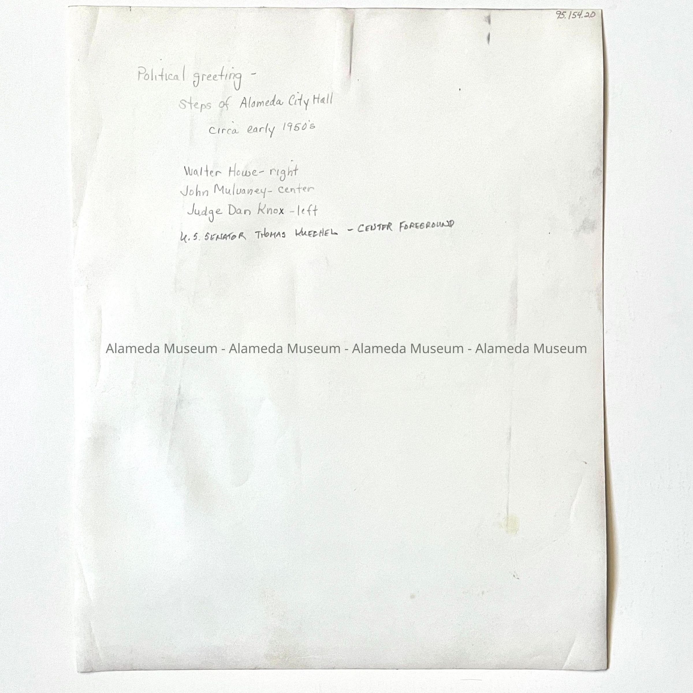 FORMAL GREETING, STEPS OF CITY HALL, ALAMEDA, CALIFORNIA, TAKEN IN THE EARLY 1950's. WALTER HOWE, RIGHT; JOHN MOLVANEY, CENTER; JUDGE DAN KNOX, LEFT.