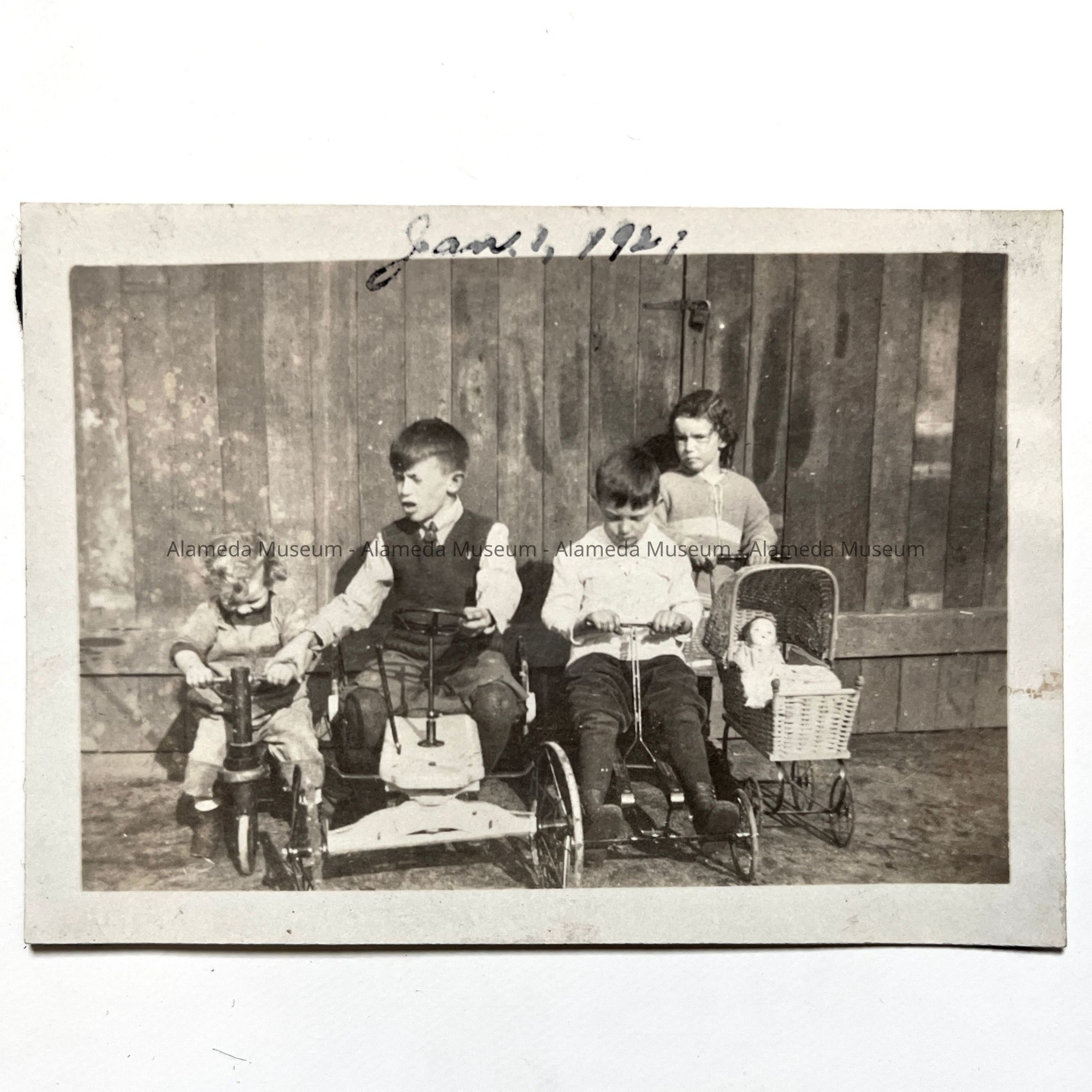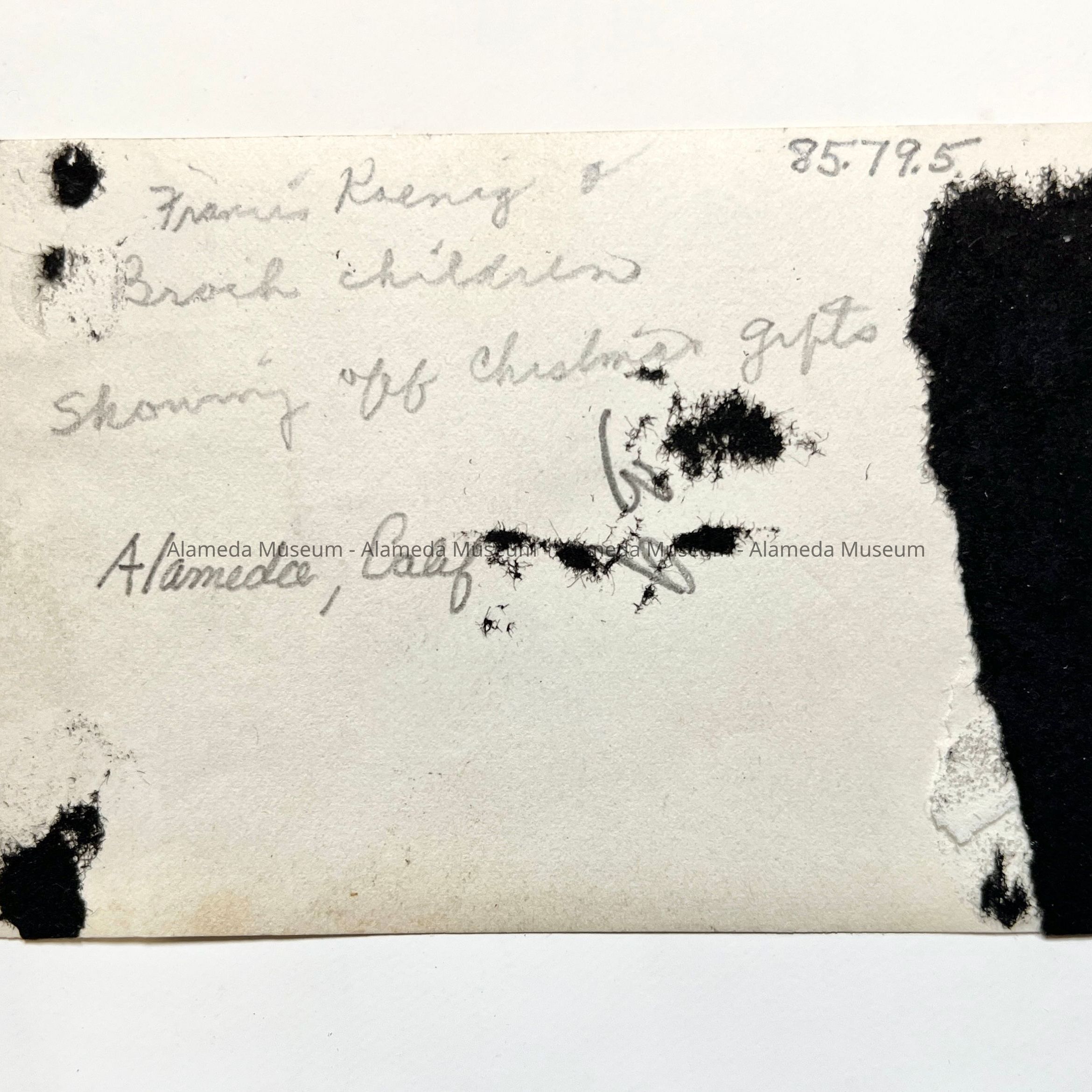 History of Object: Photo of Francis Koenig & Brock children showing off Christmas gifts. They were the grandchildren of Joseph Koenig, pioneer dry cleaning shop proprietor,
