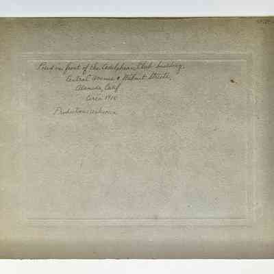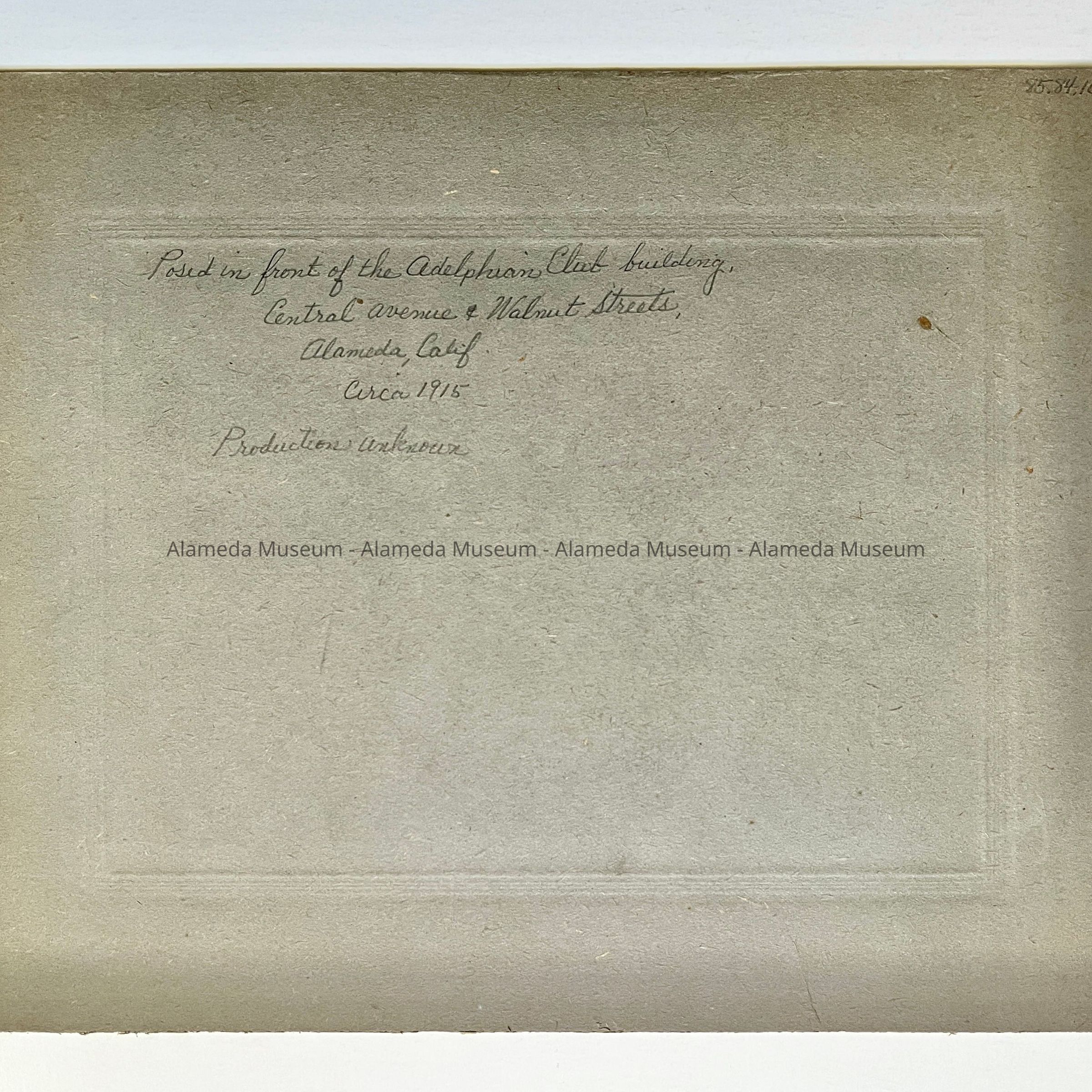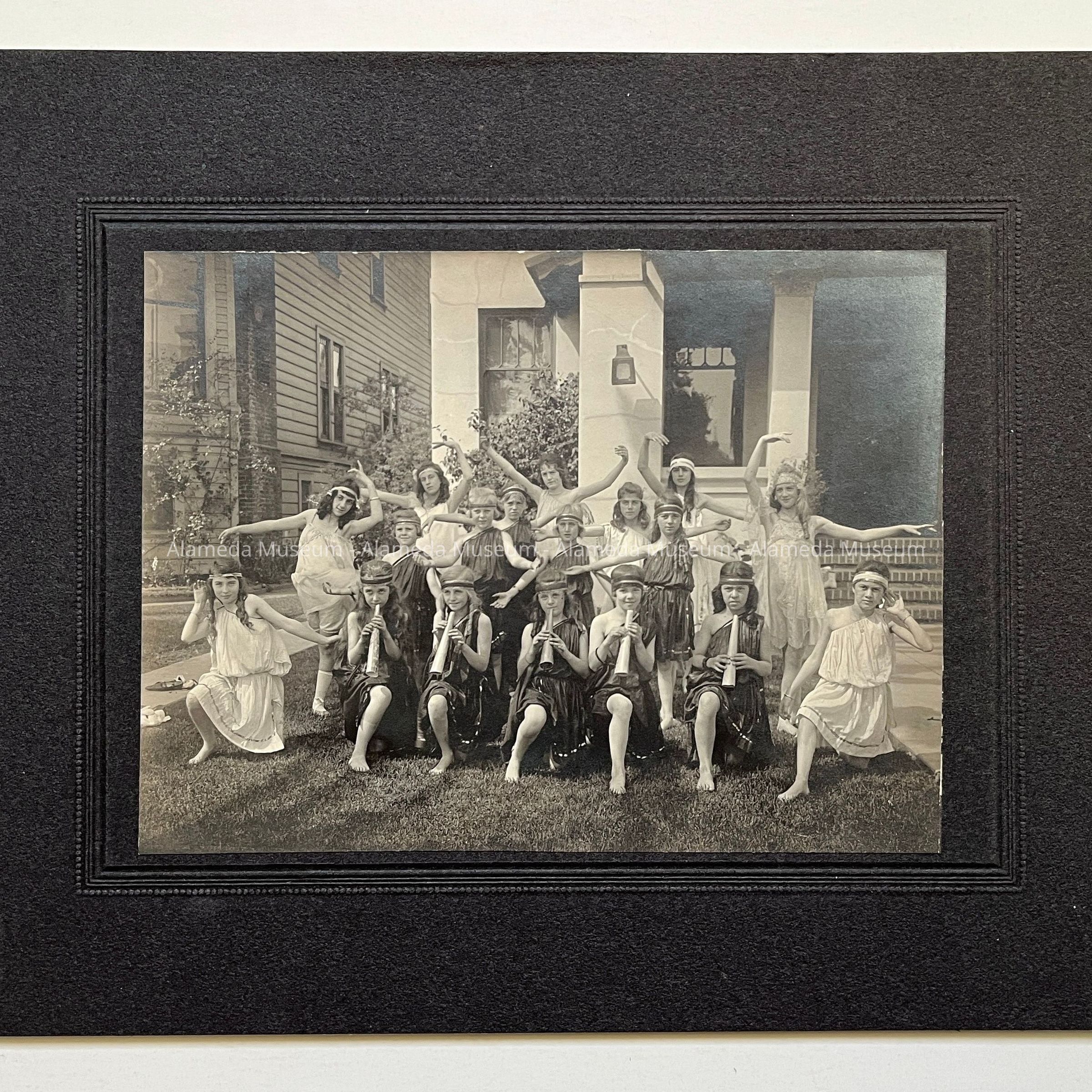 Photo depicting young girls in Greek attire posed in front of the Adelphian Club building, Central Avenue & Walnut Street, Alameda. Identities & event (production) unknown.