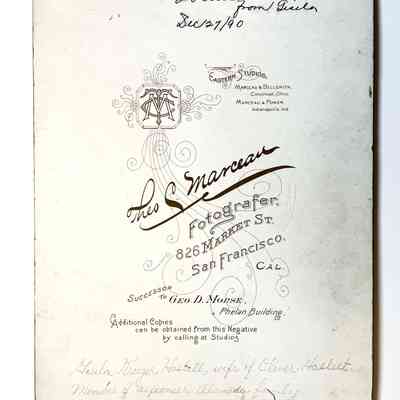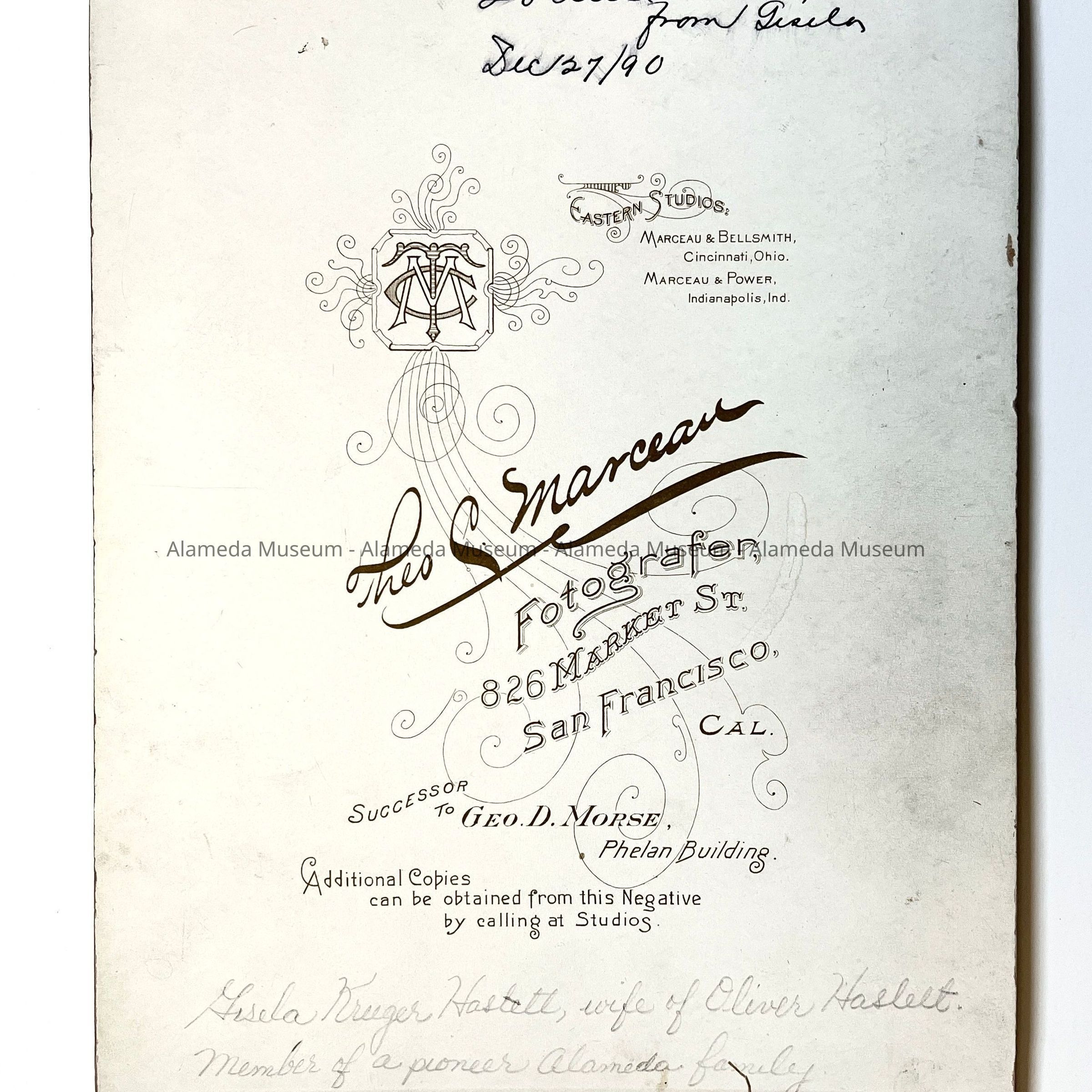 Description: Sepia tinted, white mounting, signed "Marceau Paris Panel, 826 Market Street, San Francisco".