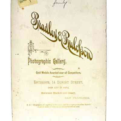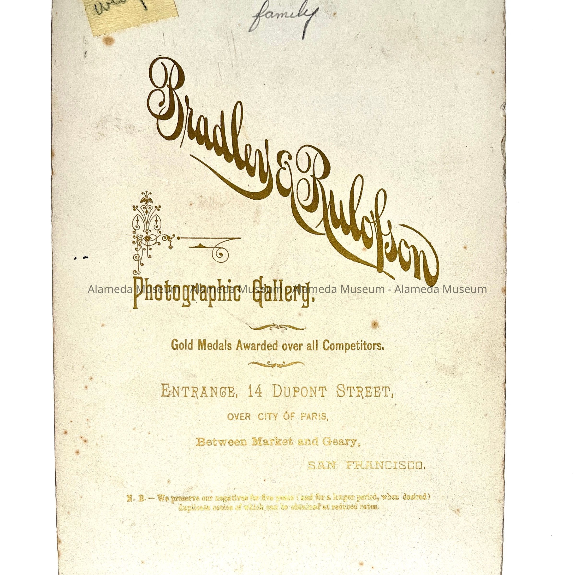 DESCRIPTION: Sepia tinted photograph signed by Bradley & Rulofson, San Francisco on the front and on the reverse side.