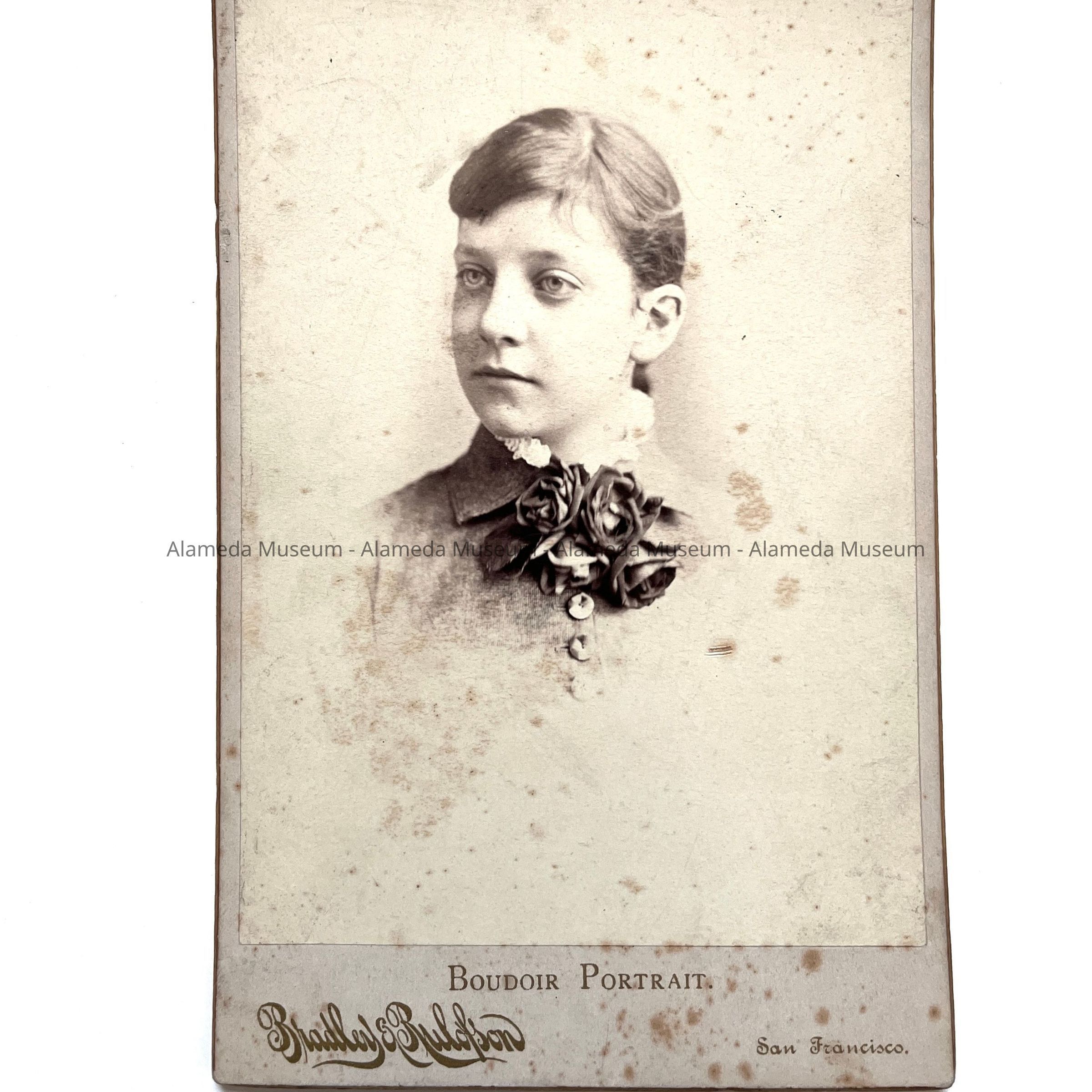 History of Object: Photograph of Gisella Kruger at age 14. She was the wife of Oliver Haslett, and both were members of a pioneer Alameda family.