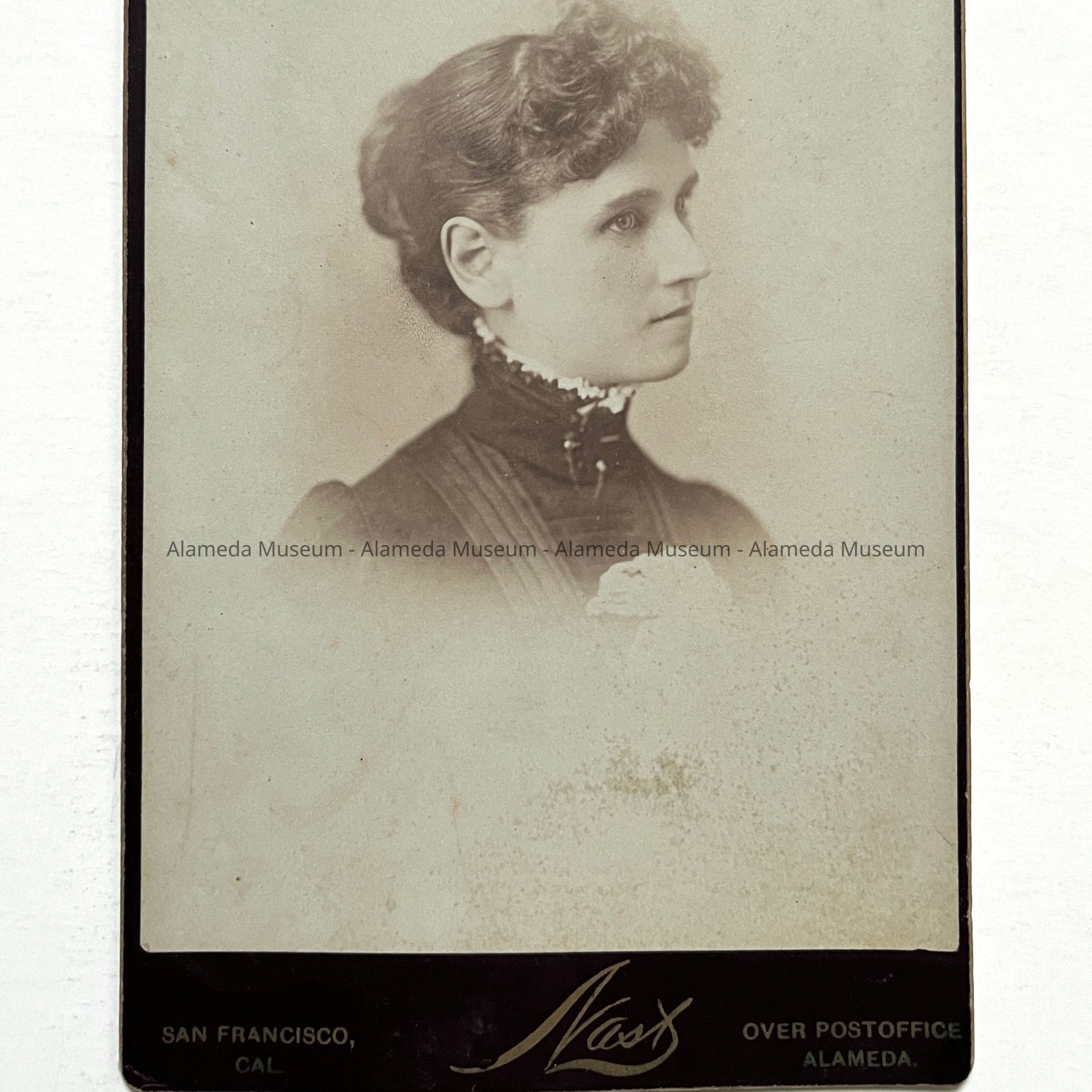 Description: Sepia tinted photo on maroon colored mounting, gold type inscription "Nast, Over Post Office, Alameda."