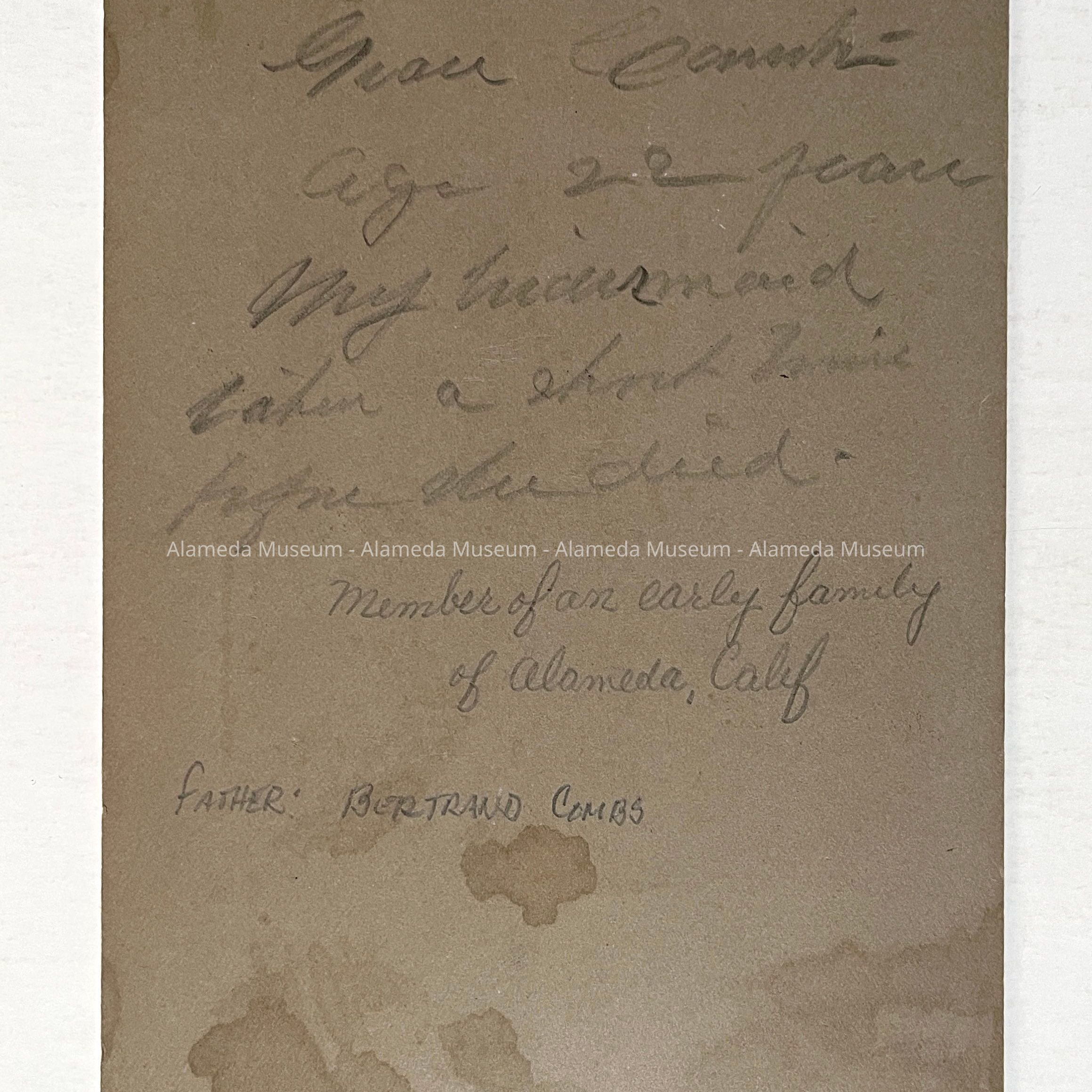 History of Object: Photo of Grace Combs, member of a family who settled in Alameda in the late 1860's.