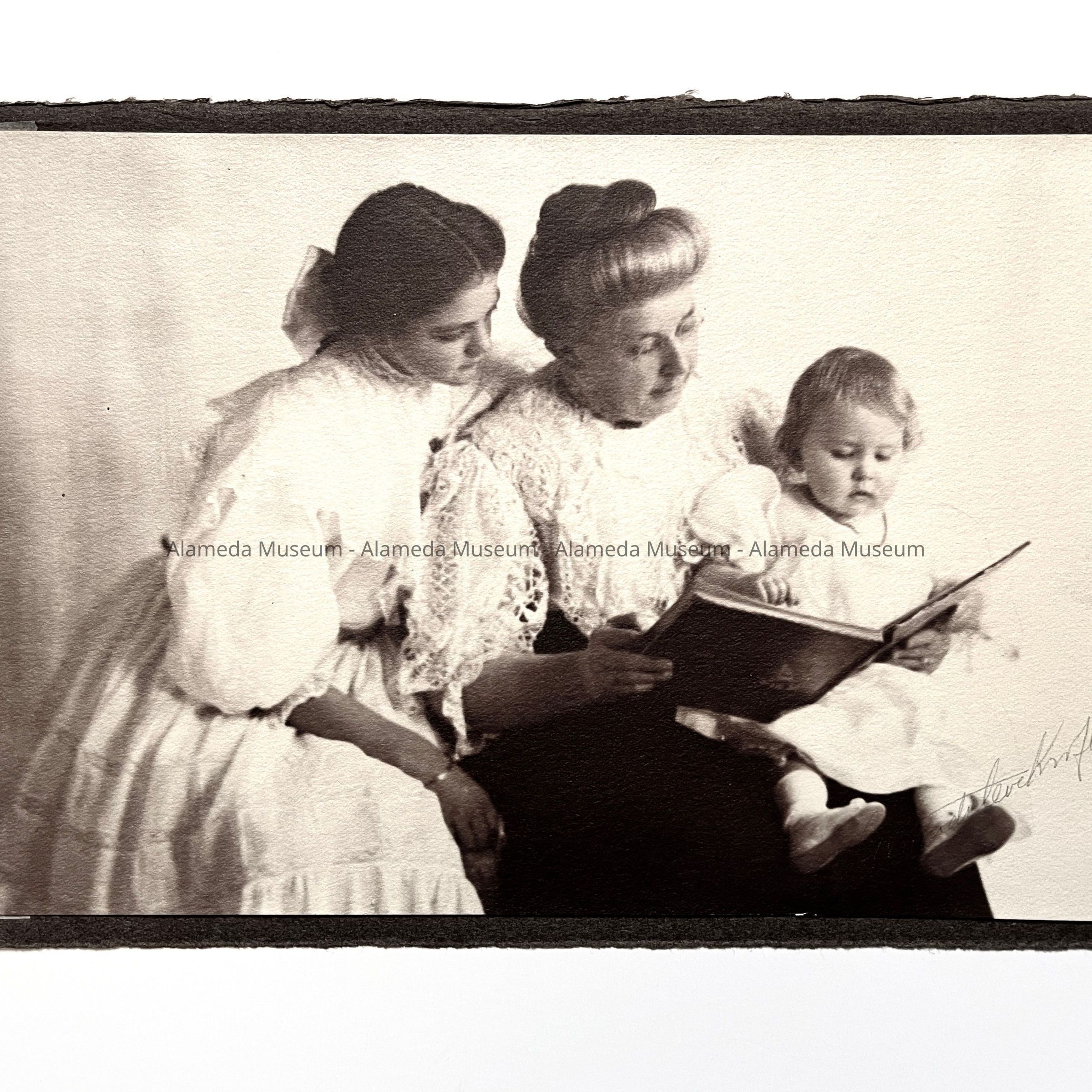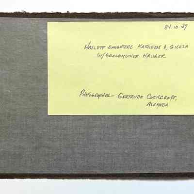 Sepia tinted photograph mat finish in brown jacket, signed (in pencil) "Gertrude Cockcroft". Photograph is of Grandmother Kruger with her granddaughters Kathleen and Gisella Haslett, all members of a pioneer Alameda family.