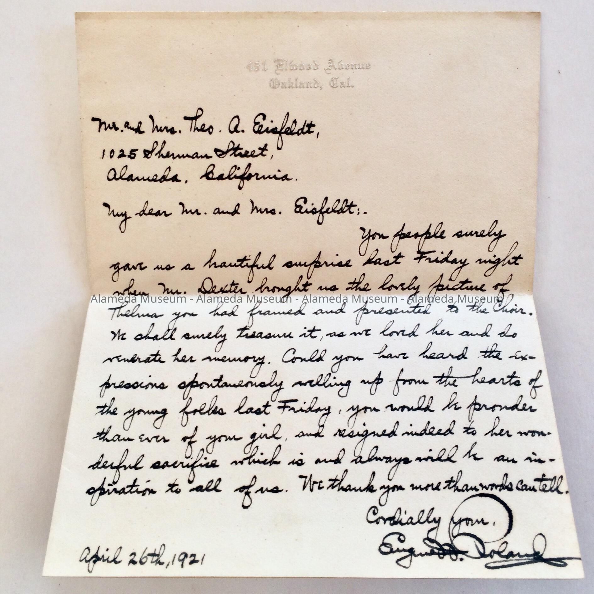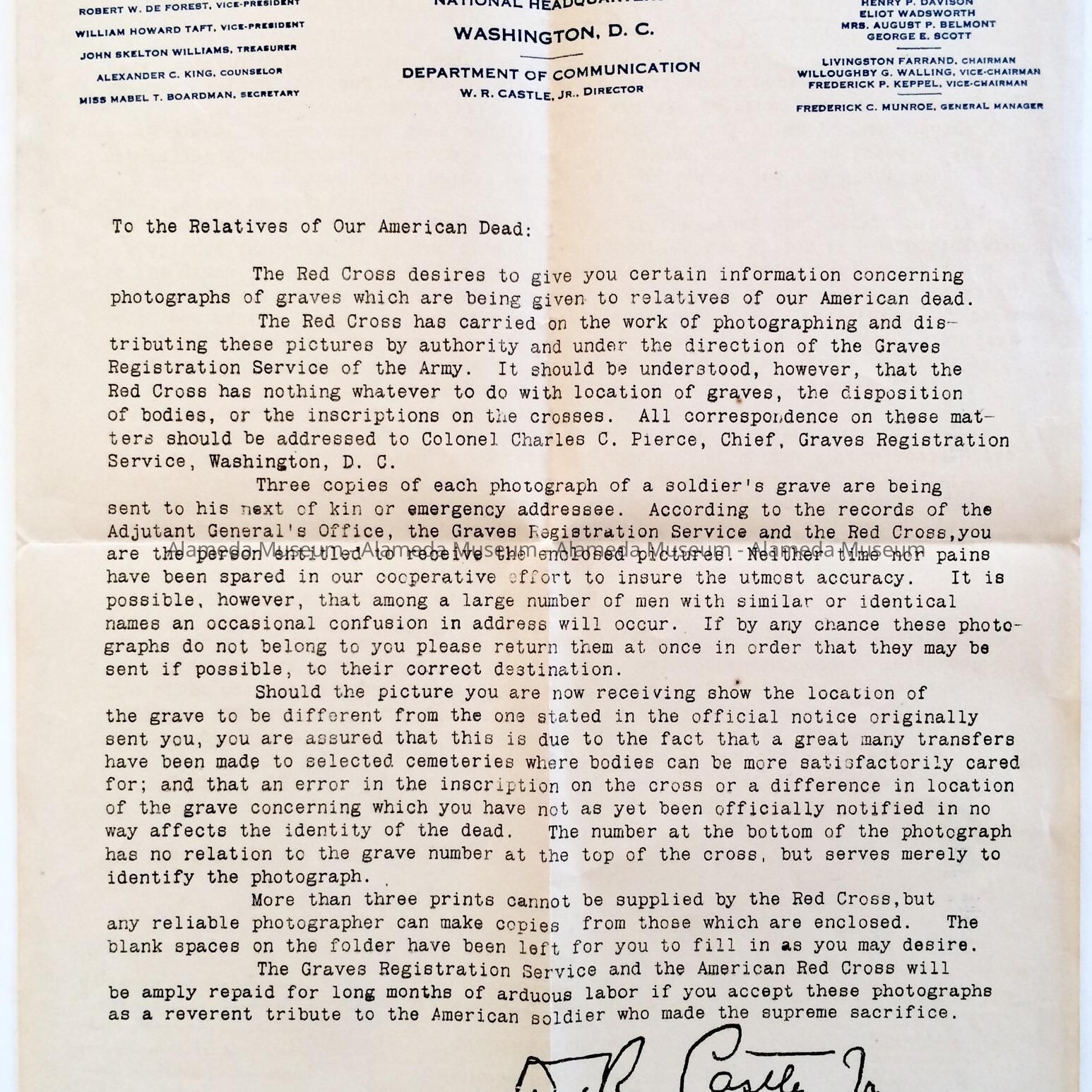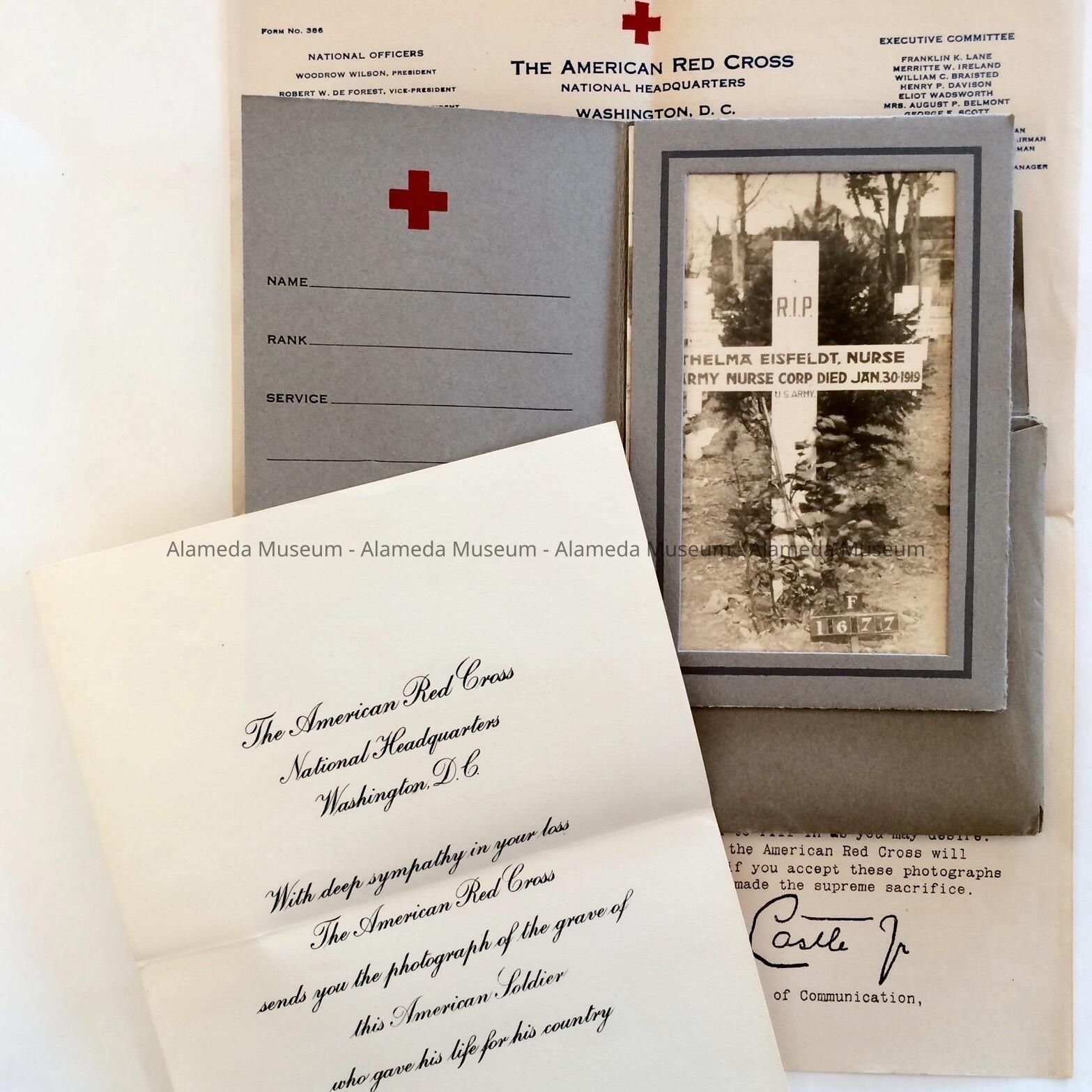 Photo of the grave of Thelma Eisfeldt (nurse) sent by the Red Cross to her parents who were temporarily living in San Francisco. It also includes a letter of sympathy.