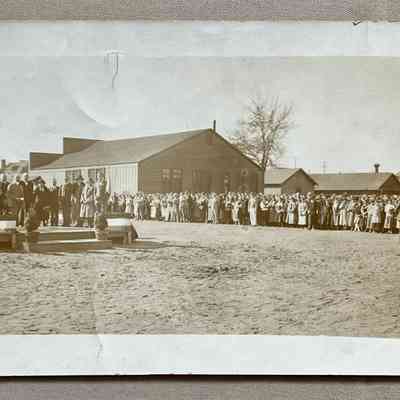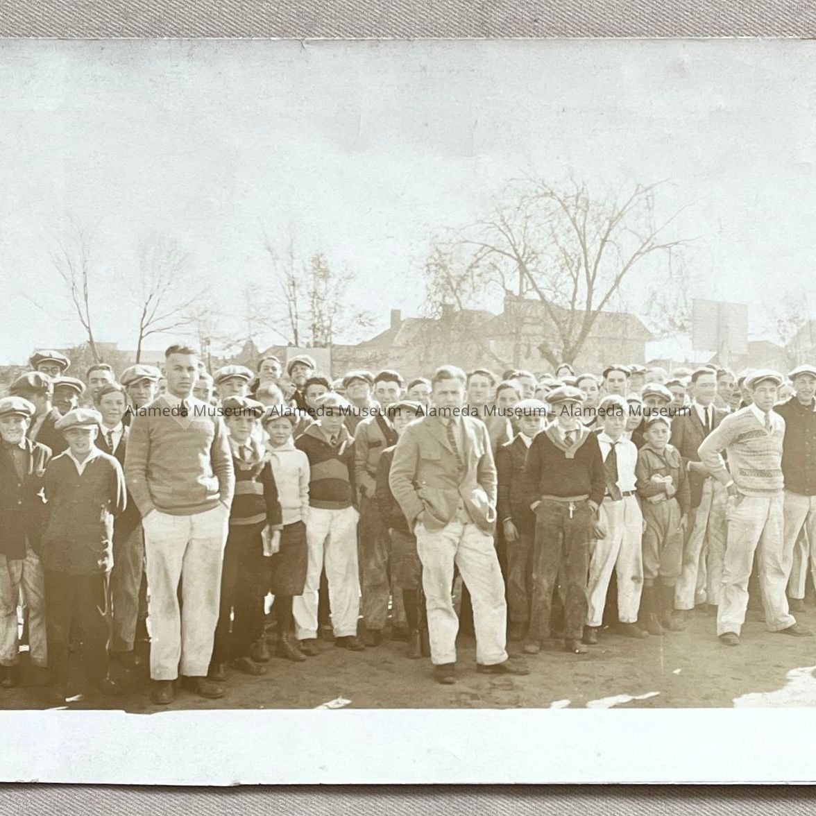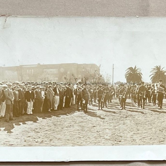 History of Object: The groundbreaking ceremony for the "new" Alameda High School, ca. 1925. A military uniformed band (possibly ROTC) is seen in the background.