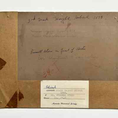 Description: Sepia-toned albumen print photo mounted on tan paperboard. Photographer unknown. The mounting has been damaged by a crease on the lower right corner covered with a Scotch-tape residue, staining, scuffing, and an old green cataloging label glued to the upper left corner, as well as several nail holes.