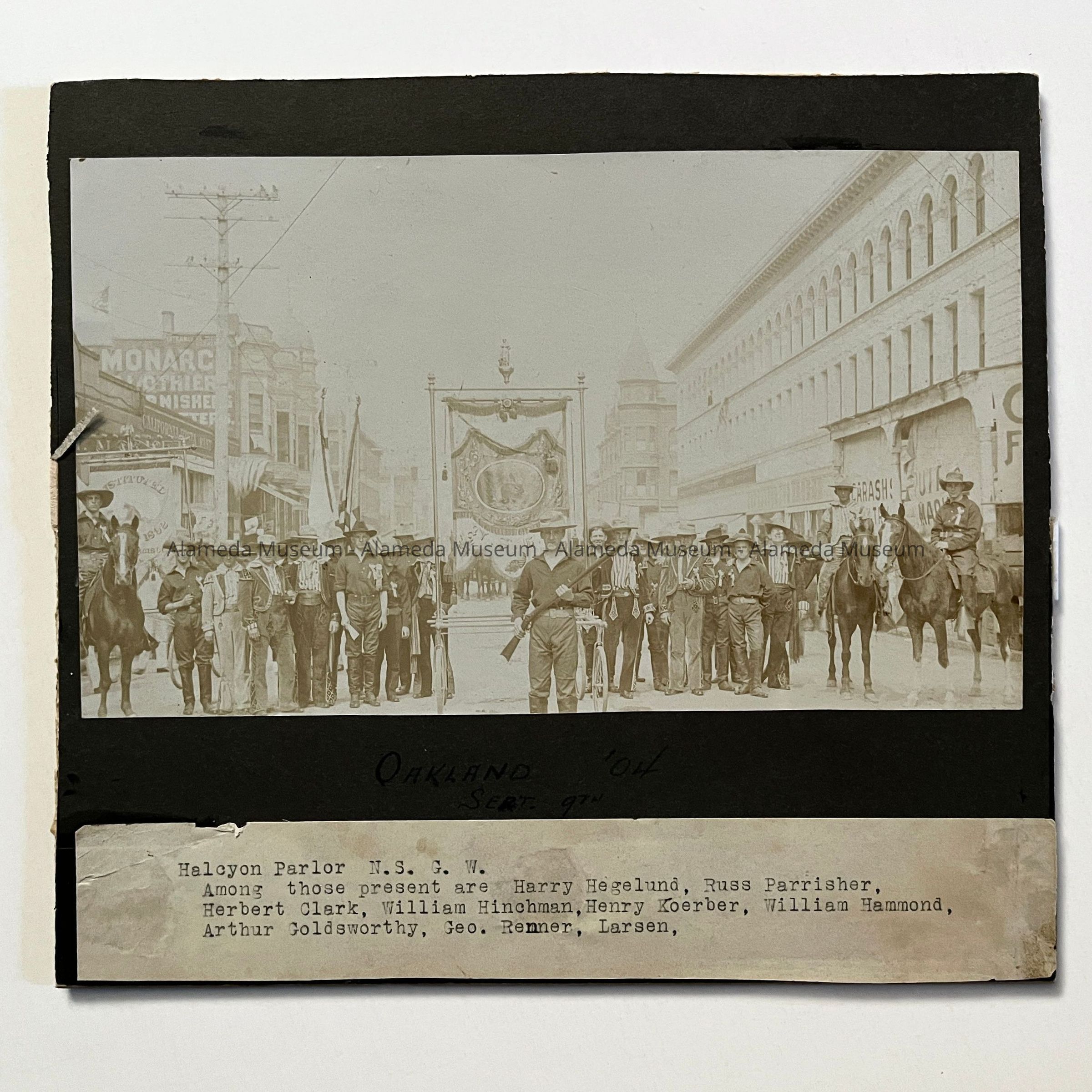 History of Object: Members of Alameda's Halcyon Parlor, N.S.G.W., marching unit in a parade in Oakland, Sept. 9, 1904. The men are attired in Western gear, and some of them are identified on a descriptive label affixed on the mounting below the image.