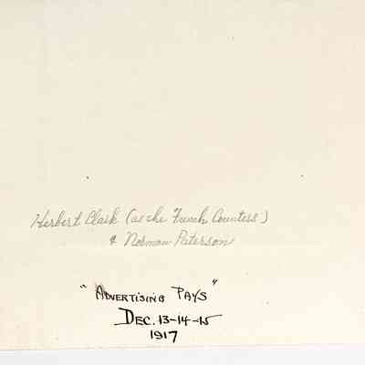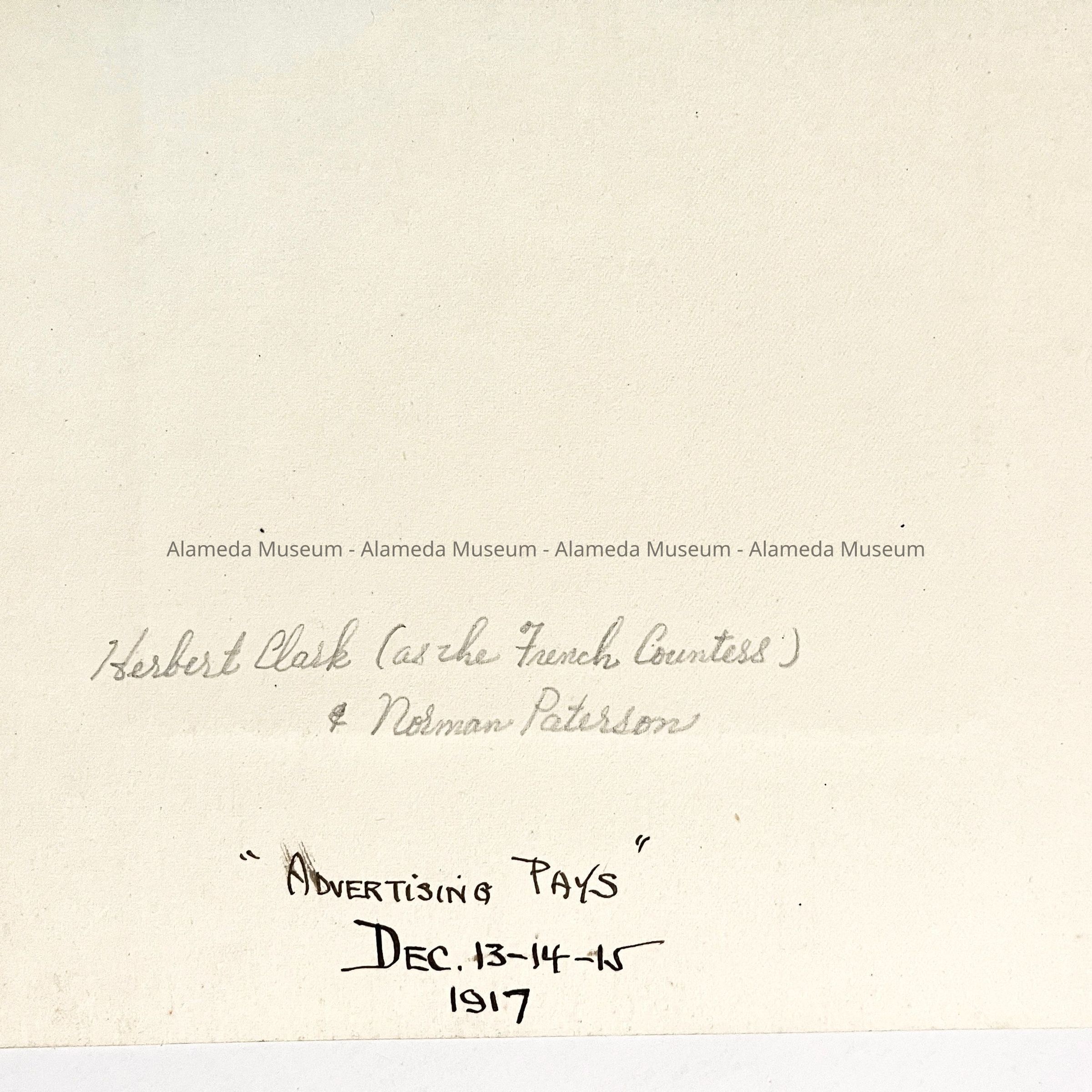 Herbert Clark took many parts in the numerous Elks Plays & Minstrel Shows. To him the most memorable was "Advertising Pays" which made the rounds of the various Army & Navy installations during W.W.I. In this play he took the part of a French Countess. His wardrobe was supplied by the leading ladies stores of the time; including numerous furs, bags & jewelry & costly dresses. The gentleman with the Countess is Norman Paterson, born in Australia & later married to Alla Mastick of Alameda. Picture was taken by Gertrude Cockroft, well known in Alameda.