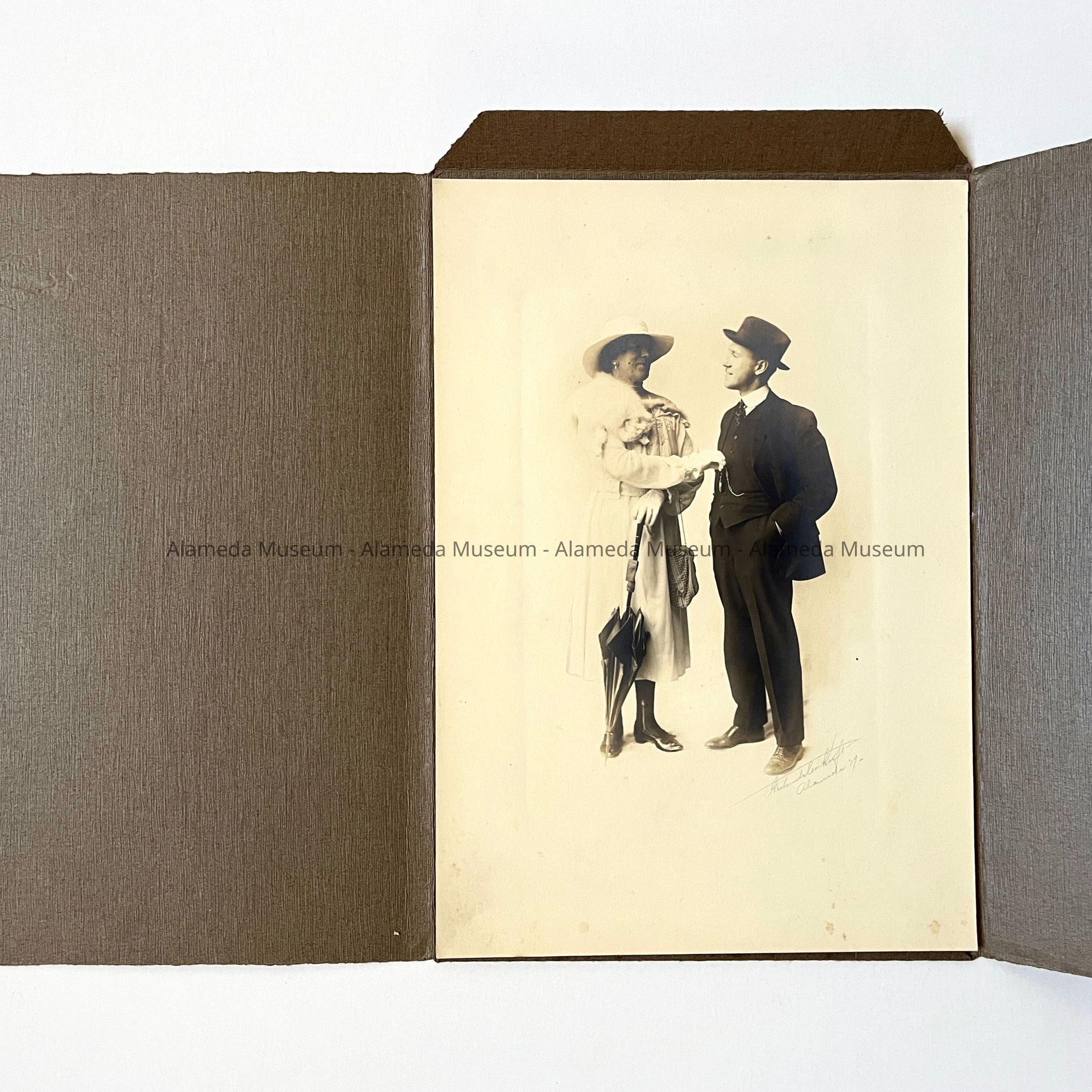 Description: Sepia tinted photograph with brown heavy paper photographic jacket. Signed on lower portion of photo "Gertrude Cockroft, Alameda, 17". Subject- double portrait, theatrical pose.