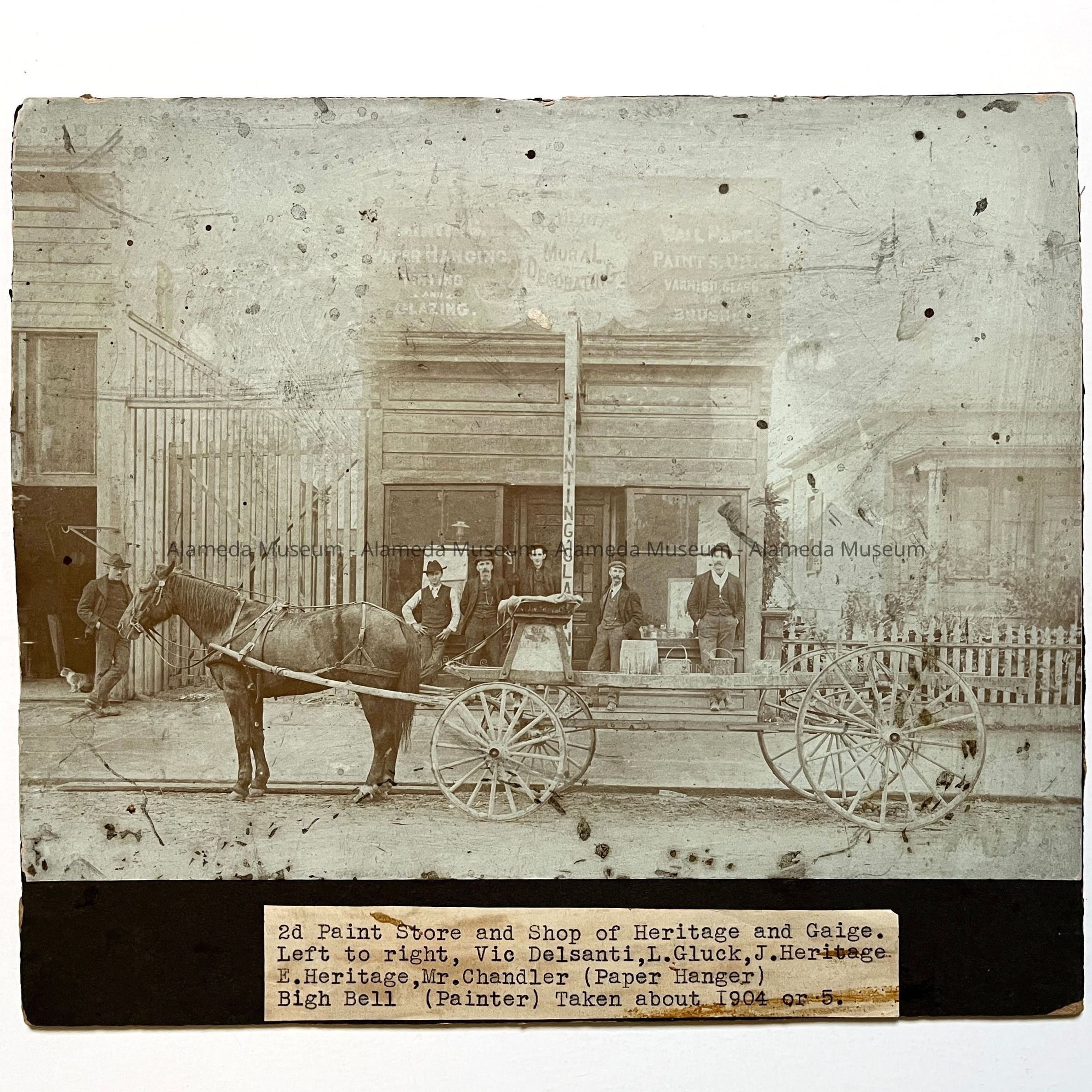 History of Object: Horse with attached delivery cart standing in front of the second paint store and shop of Heritage and Gaige. Store employees are identified on the descriptive label, attached.