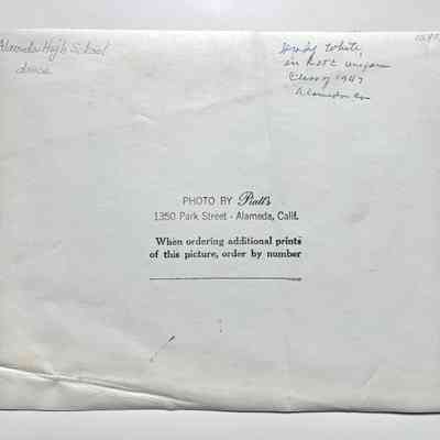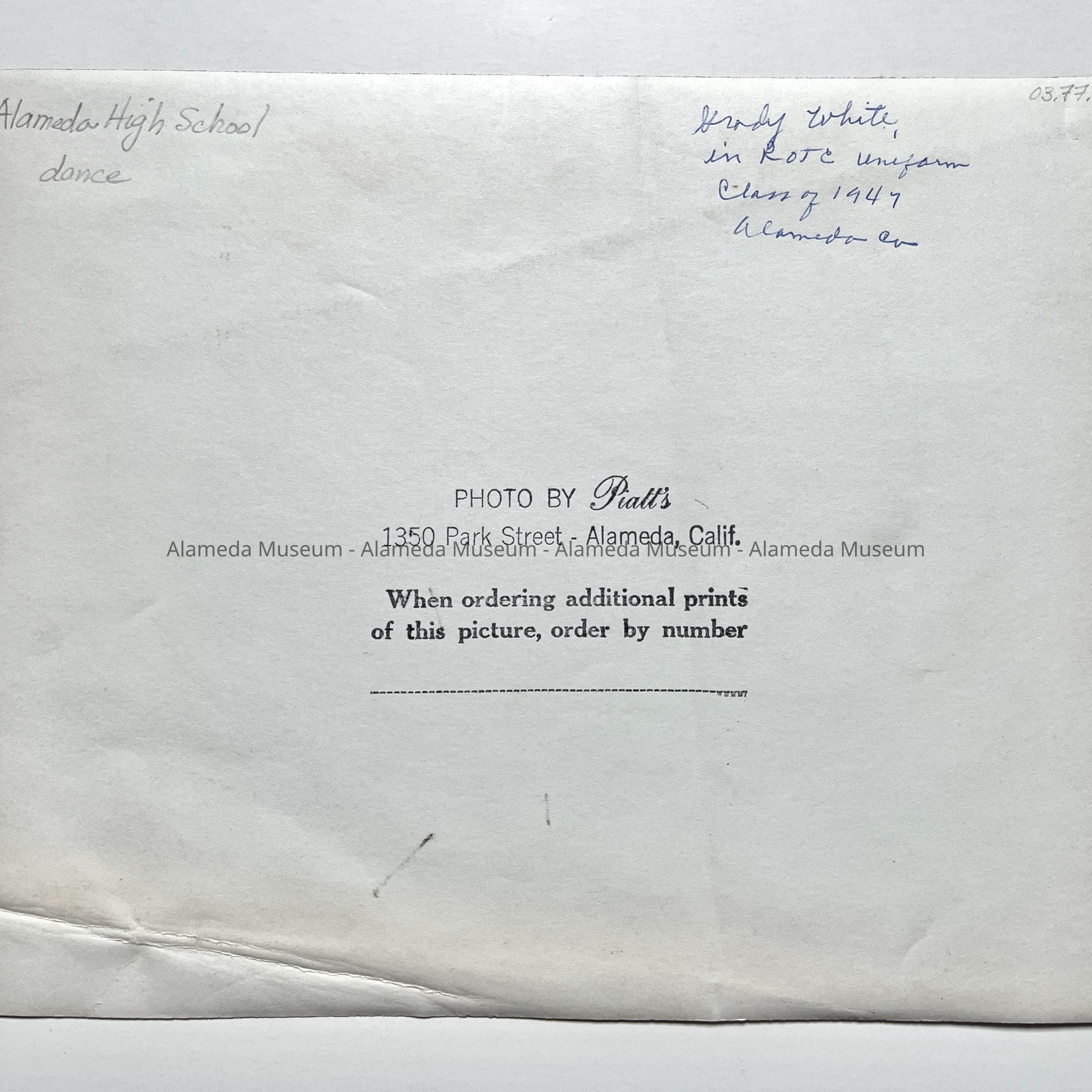 A BLACK-AND-WHITE PHOTOGRAPH, SIGNED ON THE REVERSE SIDE, "PIATT'S, 1350 PARK STREET, ALAMEDA, CA."
