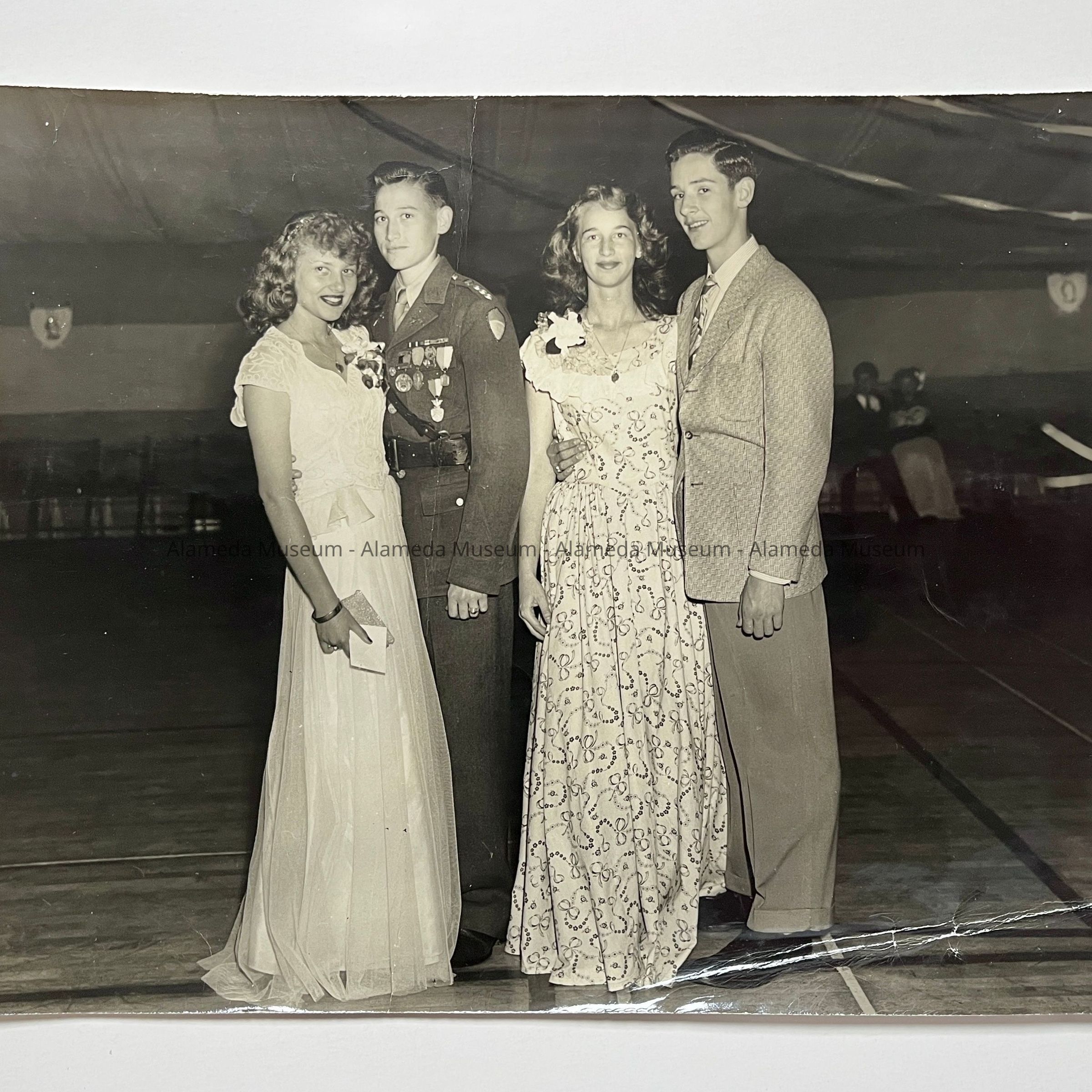 A PHOTOGRAPH OF GRADY WHITE IN HIS ROTC UNIFORM, WITH MEDALS AND AN UNIDENTIFIED "DATE" AND ANOTHER COUPLE (UNIDENTIFIED) AT AN ALAMEDA HIGH SCHOOL DANCE IN 1947.