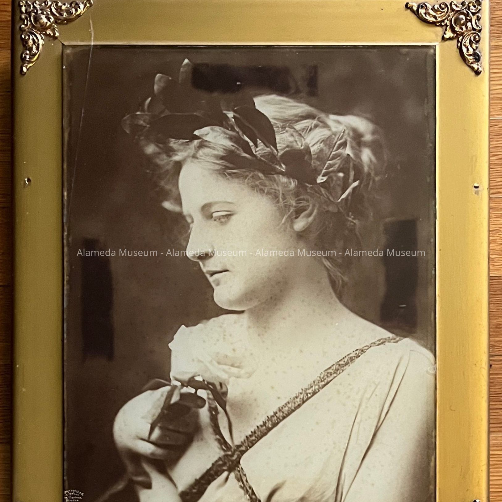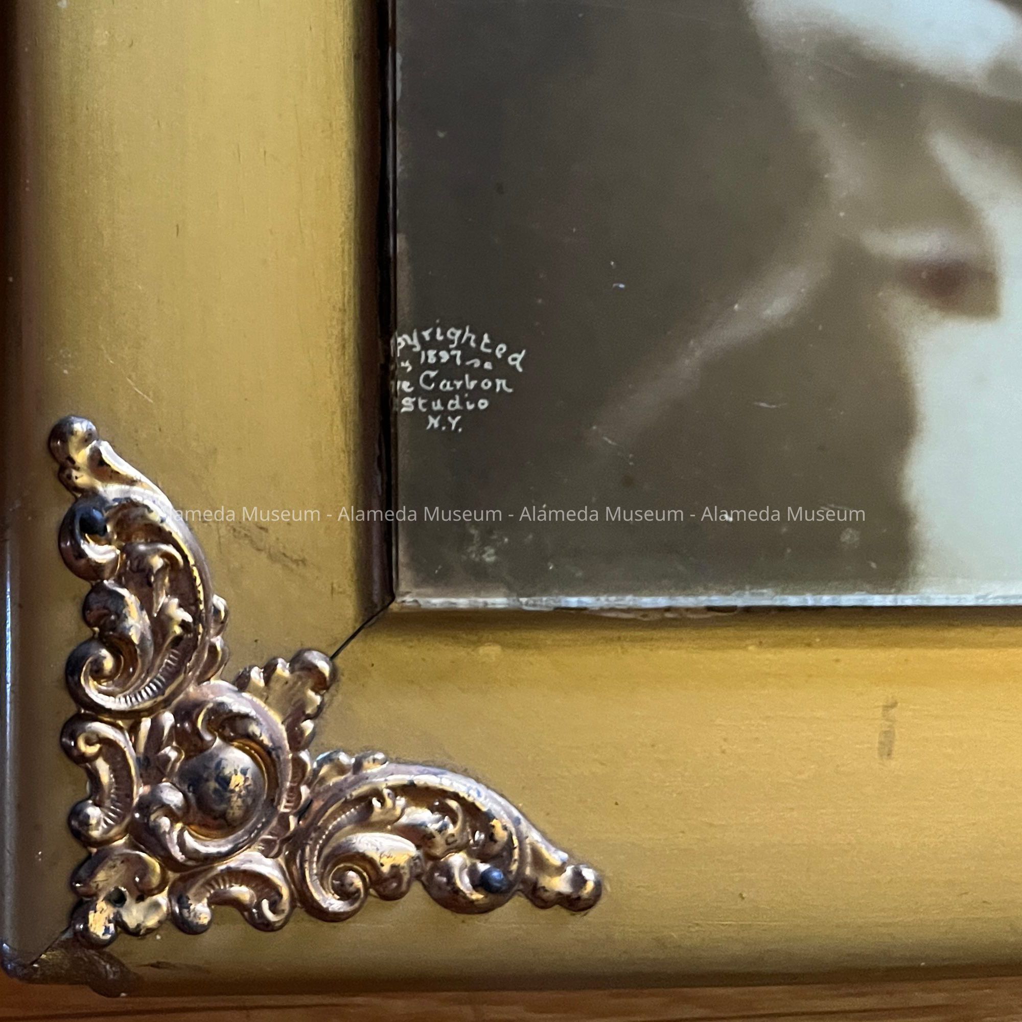 A SEPIA-TINTED PHOTO OF GRECIAN-STYLE LADY, ATTACHED TO GLASS ON A WOODEN GESSO GILDED FRAME. THE CORNERS OF FRAME ARE IN EMBOSSED BRASS DETAILS THAT HAVE BEEN GOLD-PLATED. THE PHOTO IS SIGNED, "COPYRIGHTED 1897." “THE CARBON STUDIO, NEW YORK."