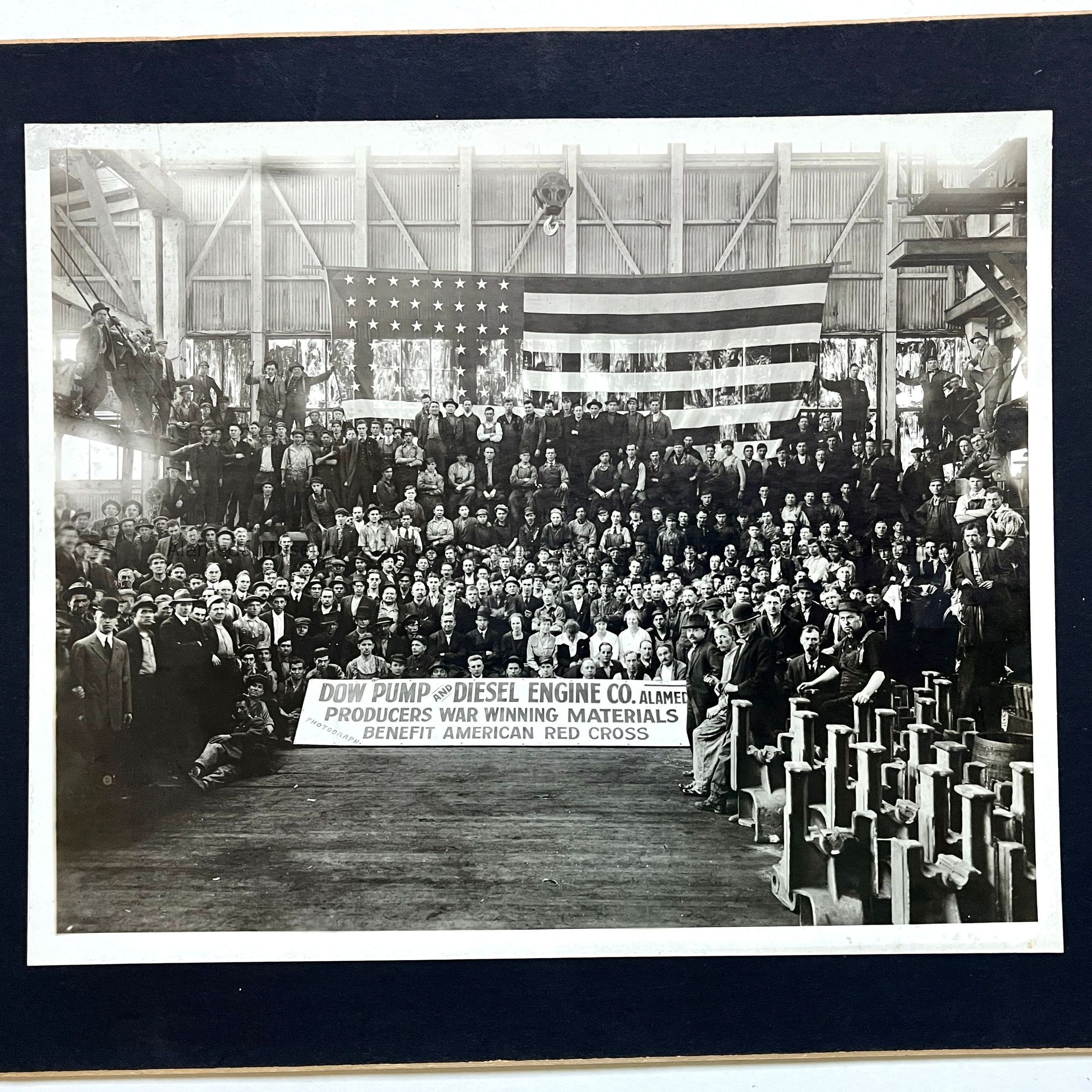 Interior view of Dow Pump and Diesel Engine Co., Alameda, taken during the First World War. The picture depicts the employees of the plant standing around a large sign that states "Dow Pump and Diesel Engine Co. Alameda, Producers War Winning Materials. Benefit American Red Cross" In the background of the assembled group is a large American flag outstretched. The donor’s husband, Alec Low, was an employee of the company at that time, and is pictured in the group photograph.