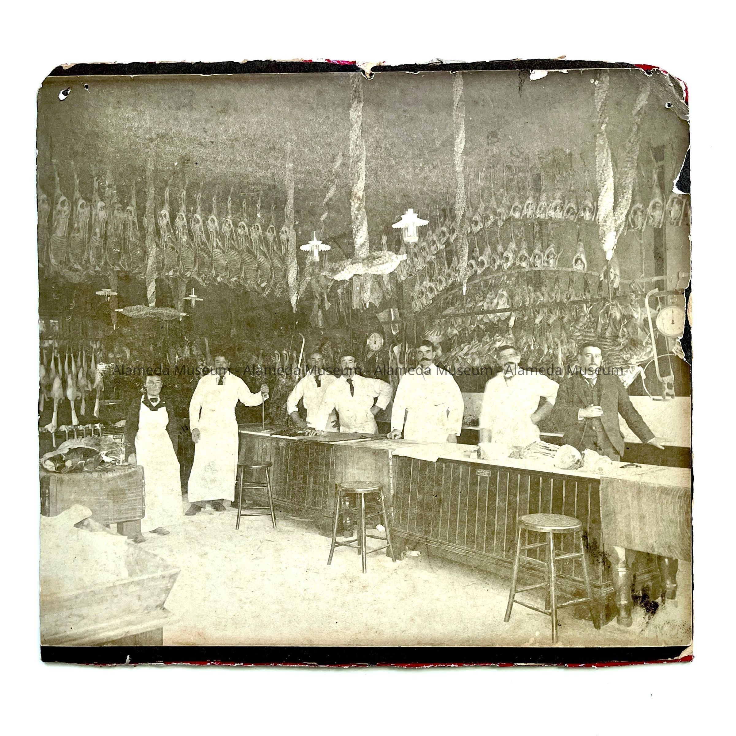 History of Object: Interior view of Ansel's Meat Market, located on S.E. corner of Chestnut and Encinal. Butchers are identified on the descriptive label.