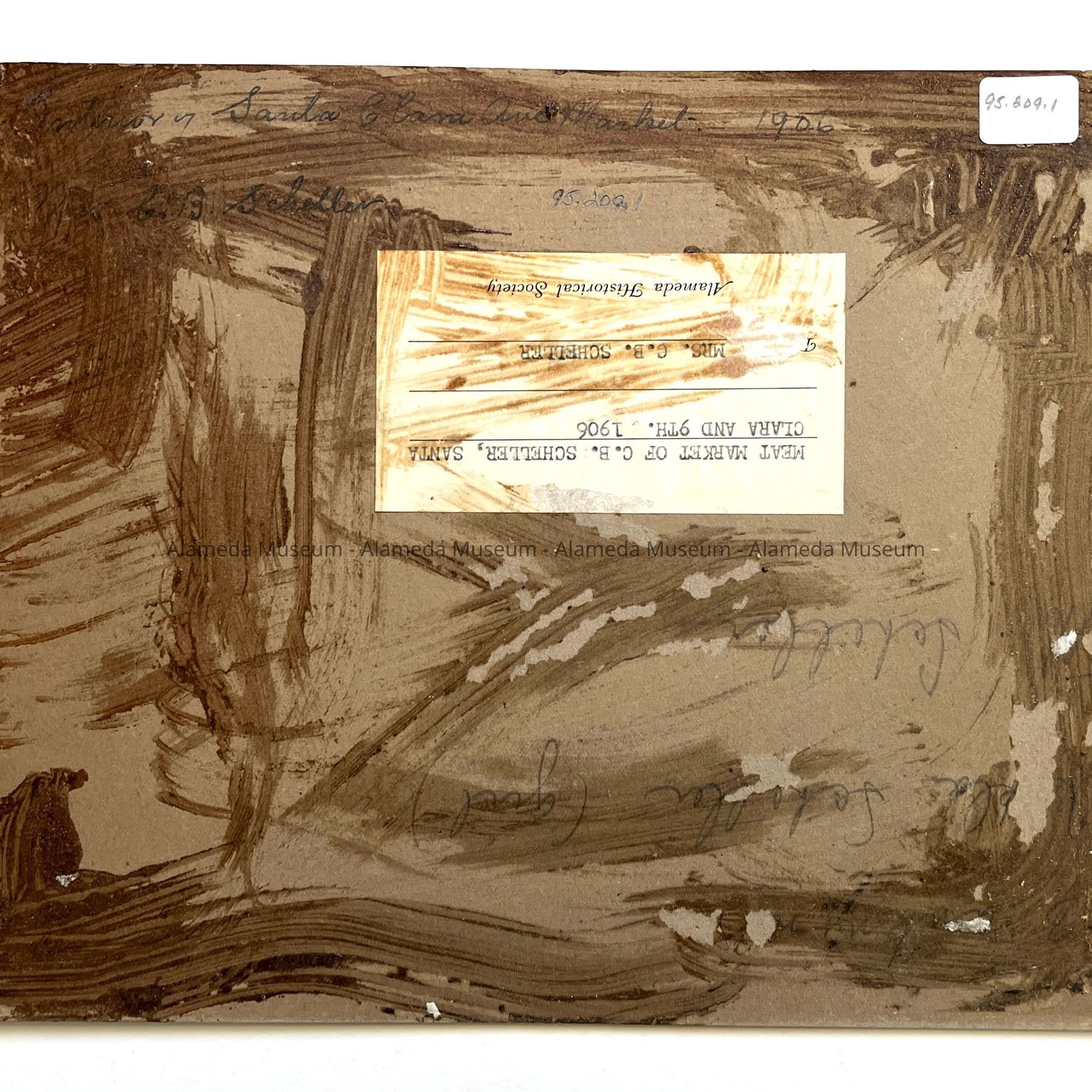 History of Object: Interior view of C.B. Scheller's meat market located at Santa Clara Ave. and 9th Street. The owner and some family members are identified on the descriptive label.