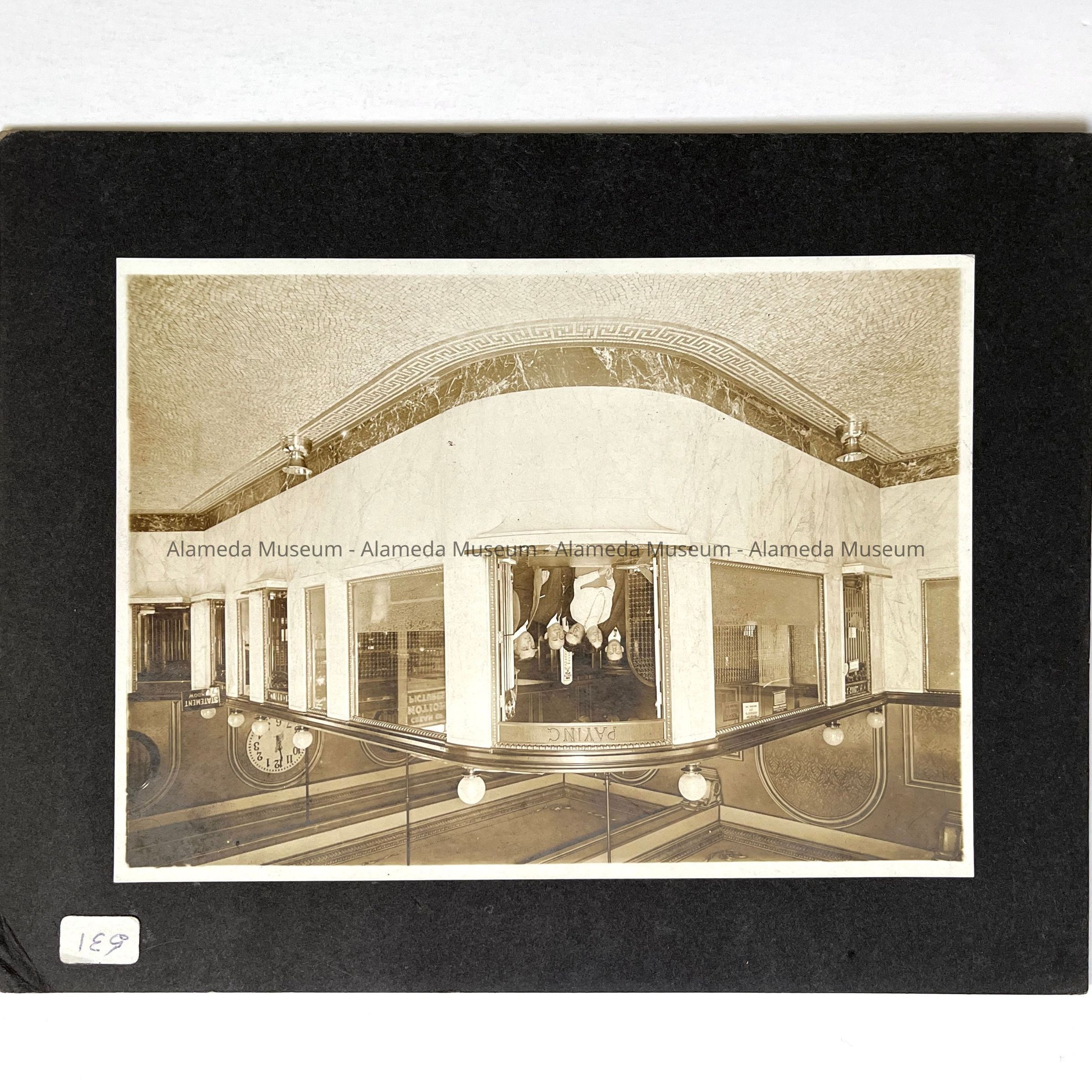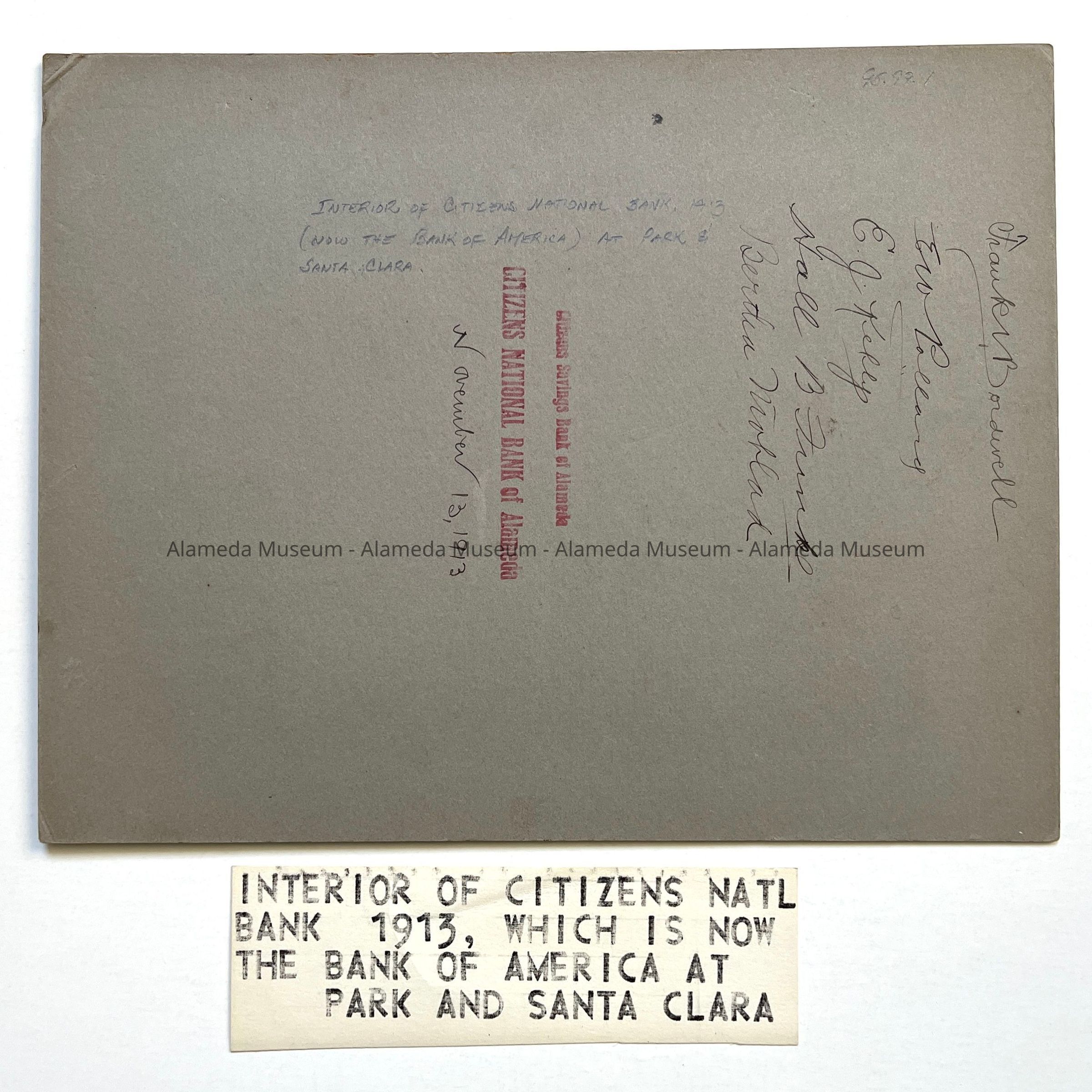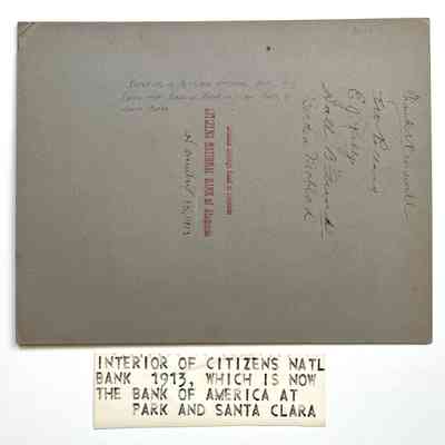 History of Object: Interior view of Citizens National Bank (now the Bank of America) at Park and Santa Clara Streets. Five staff members are standing behind a counter, and are identified by their signatures on verso. Photo is dated November 13, 1913.