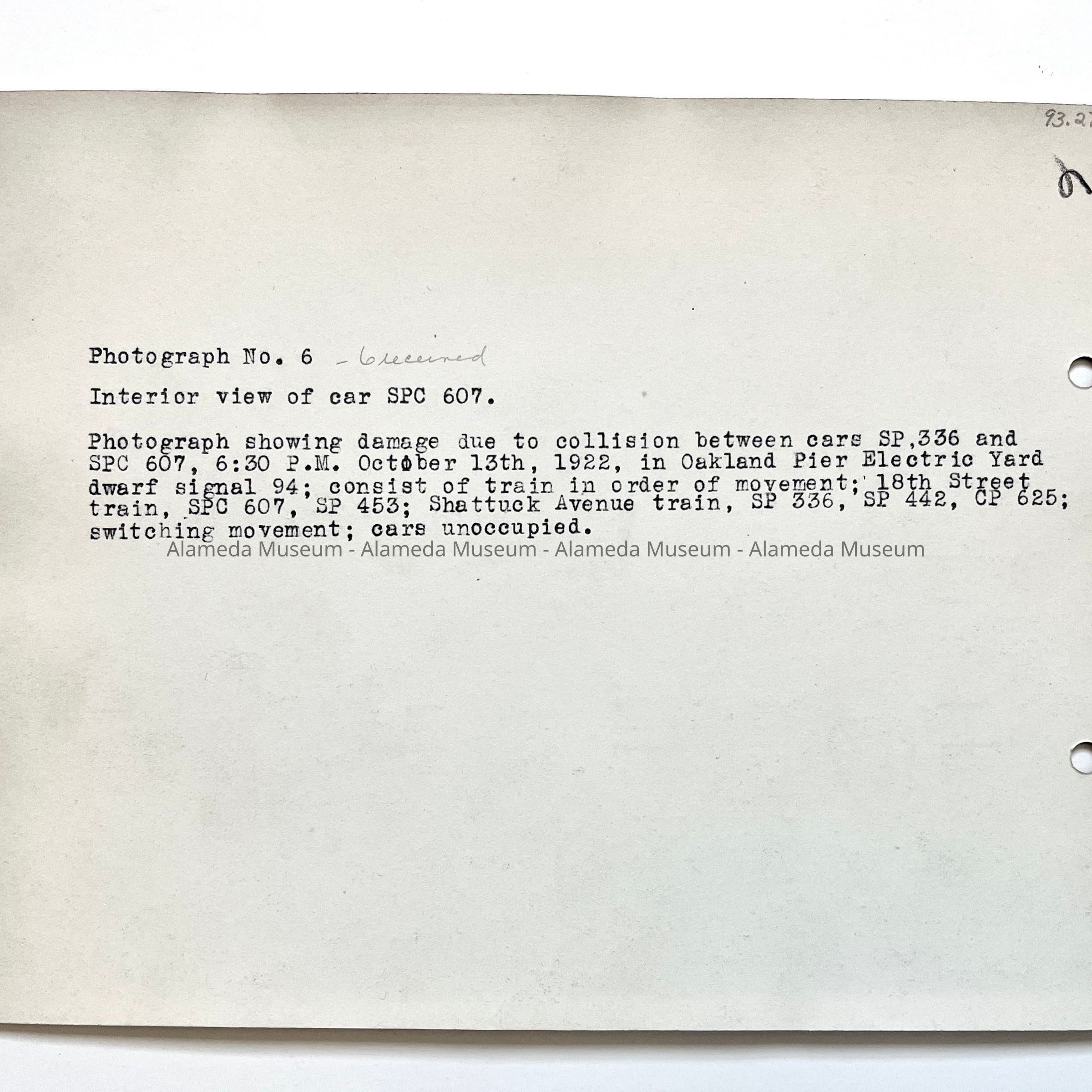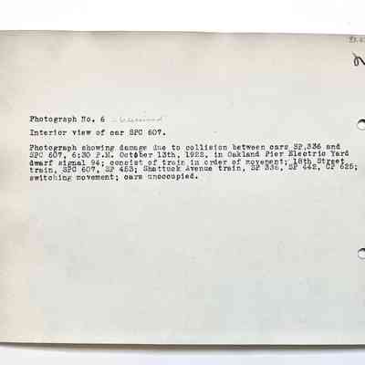 Description: INTERIOR VIEW OF SOUTHERN PACIFIC RAIL CAR NO. 607, DISPLAYING COLLISION DAMAGE. SOUTHERN PACIFIC RAILROAD COMPANY, West End, Alameda, California, 1922.