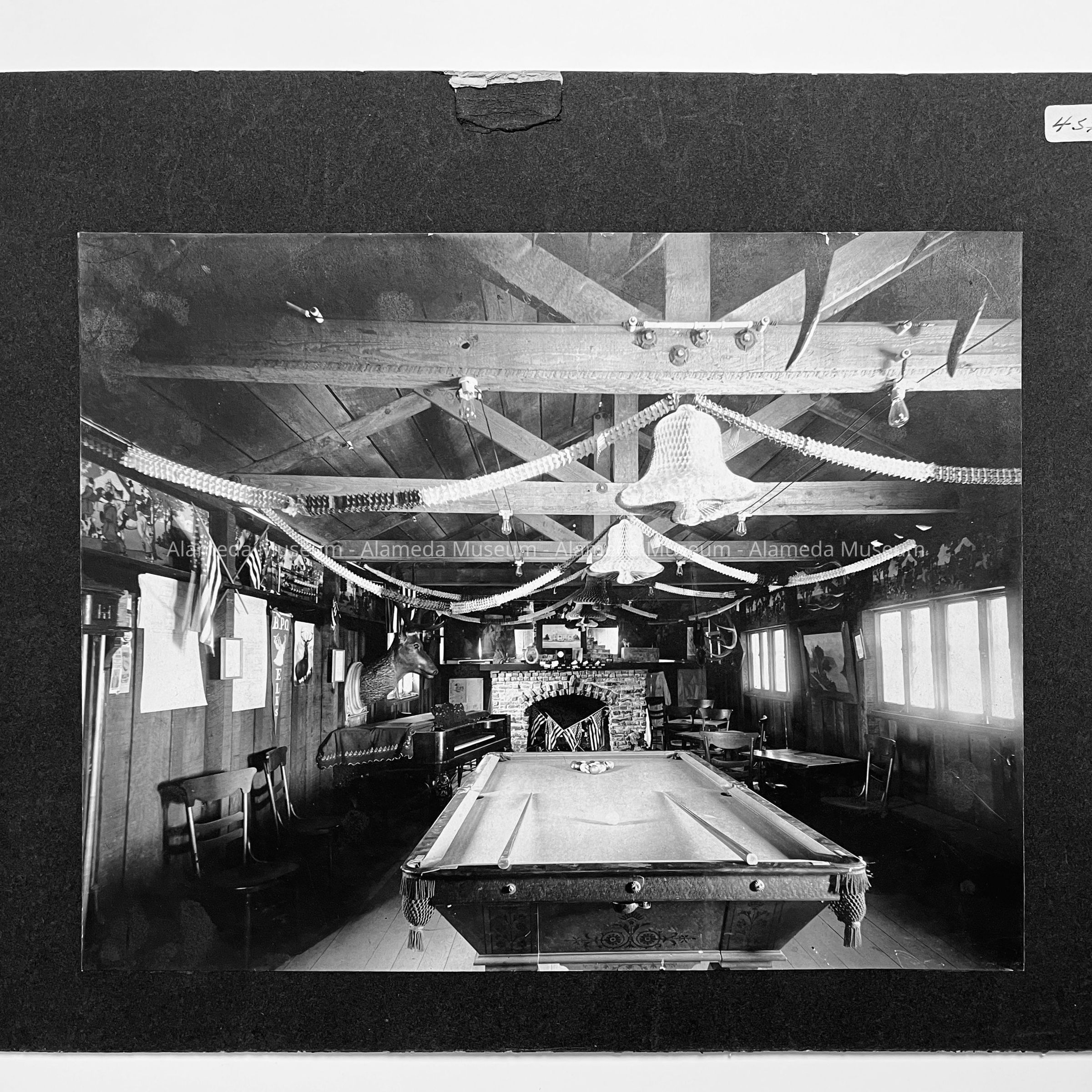 History of Object: Interior view of temporary Elks Lodge, the "Elks Shack", built in one day by volunteers, used while permanent lodge was being built. This "shack" is still located on the Elks Club grounds.