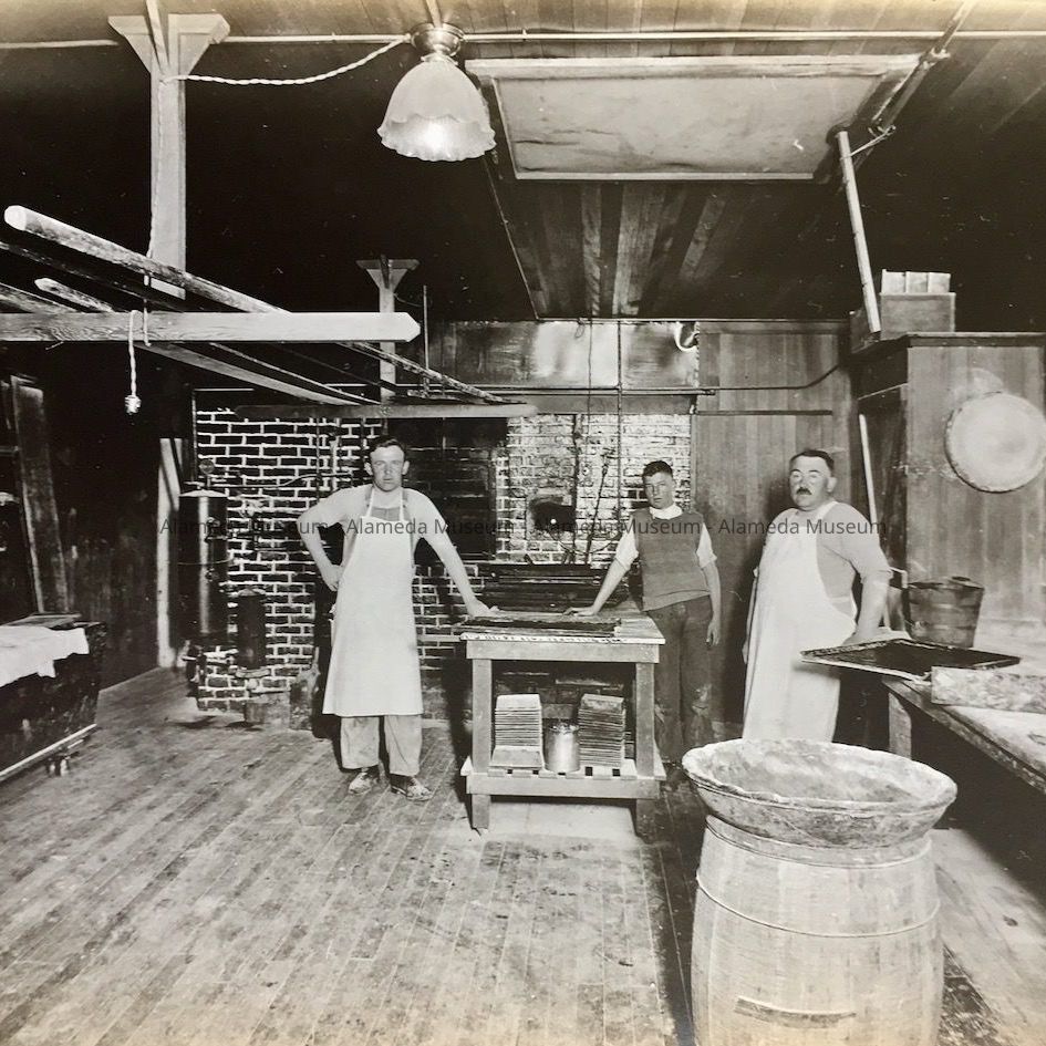 History of Object: View of Hofmann's Bakery interior with family members at 918 Central Avenue, Alameda. Approximate date of photo, 1919. Left: George Hofmann (1896 San Francisco-1922 Alameda; uncle of the donor); center: Frederic Ewaldt Hofmann (12/23/1903 San Francisco-9/23/1987 Alameda; father of the donor), right: Christian Michael Hofmann (1873 Brinbaum, Bavaria-1942 Alameda; grandfather of the donor).