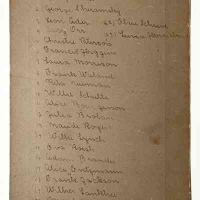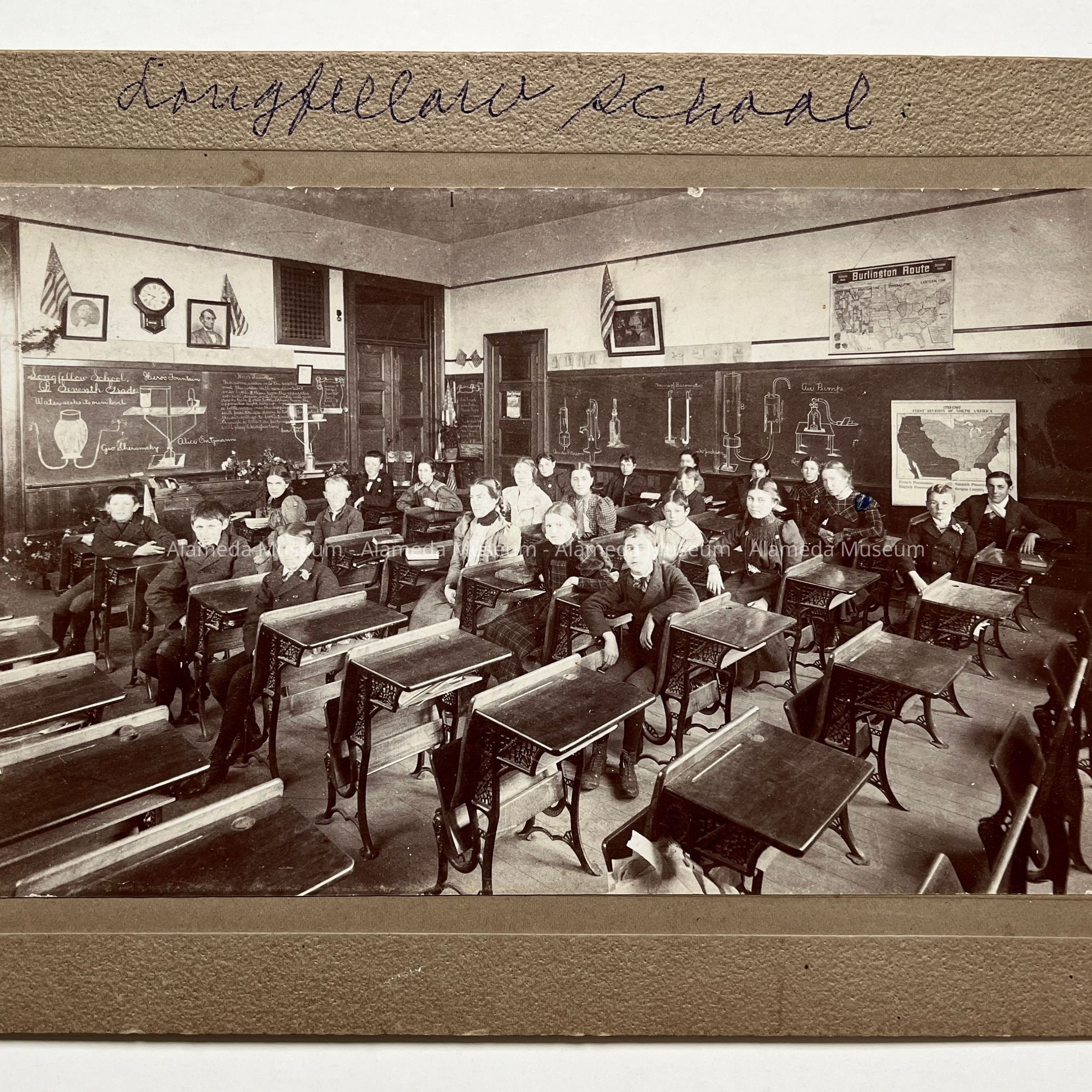 History of Object: Interior view of a Longfellow School classroom, students seated at desks. Their names are listed on verso.