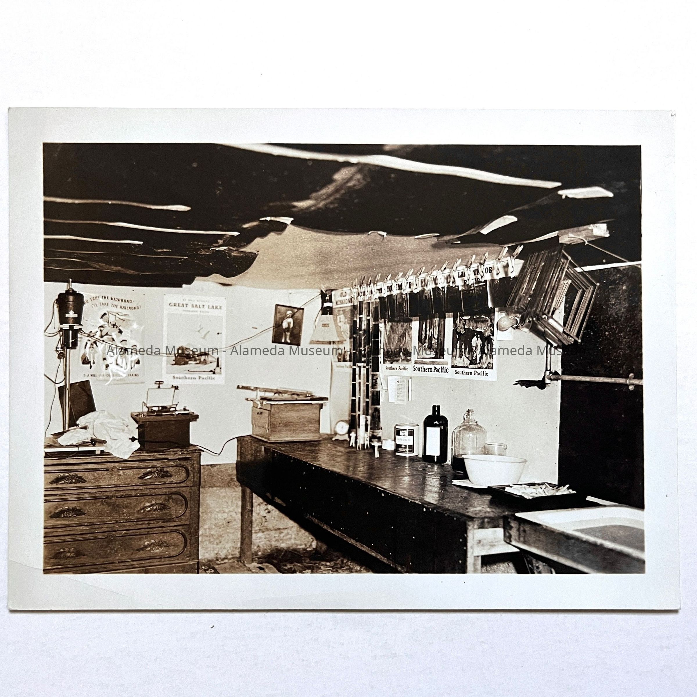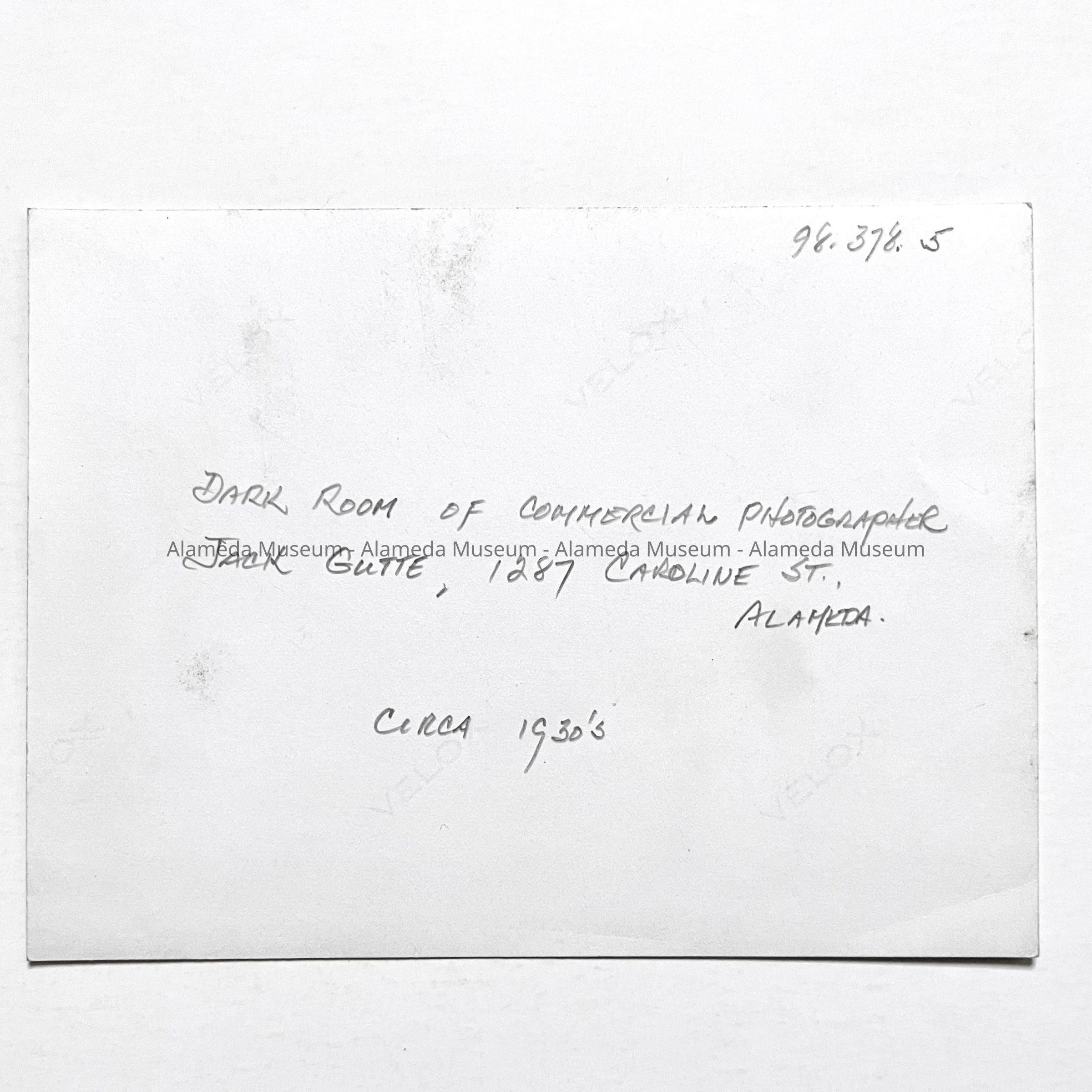 History of Object: Interior view of a photographer's darkroom, presumably that of Jack Gutte, a commercial photographer who operated out of his residence at 1287 Caroline St., Alameda, and later at 3016 Lincoln Avenue.